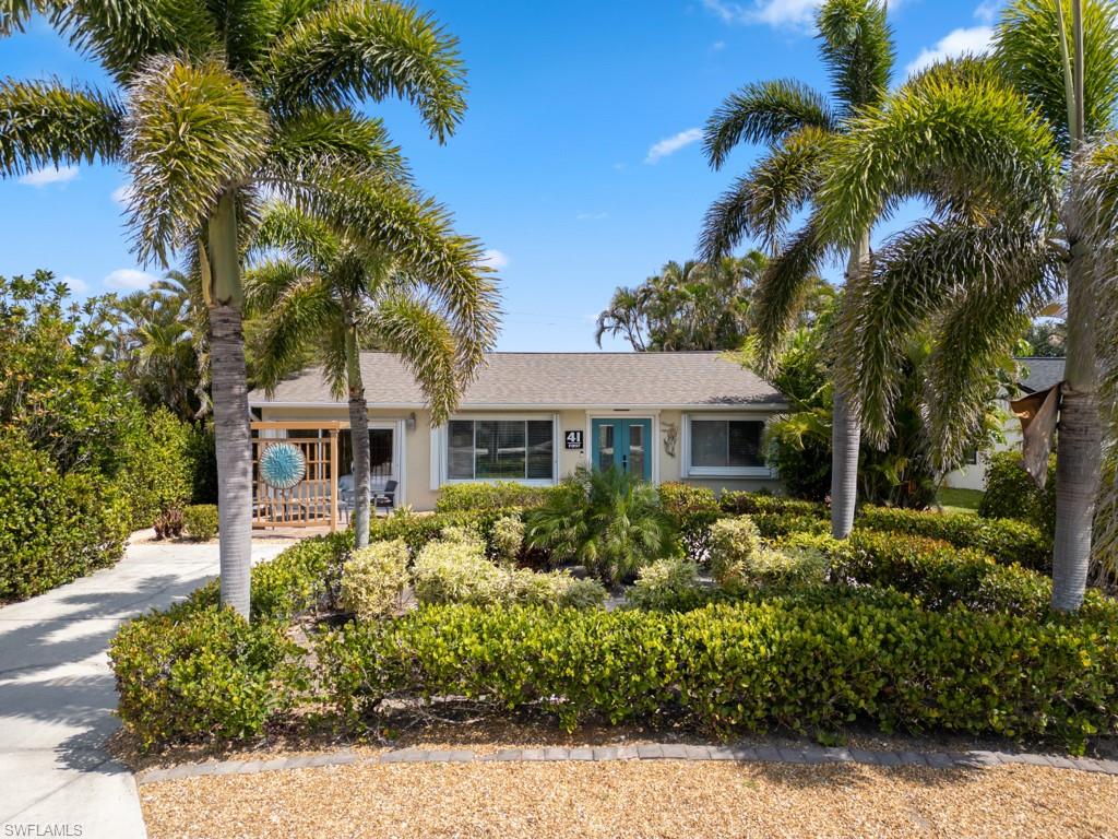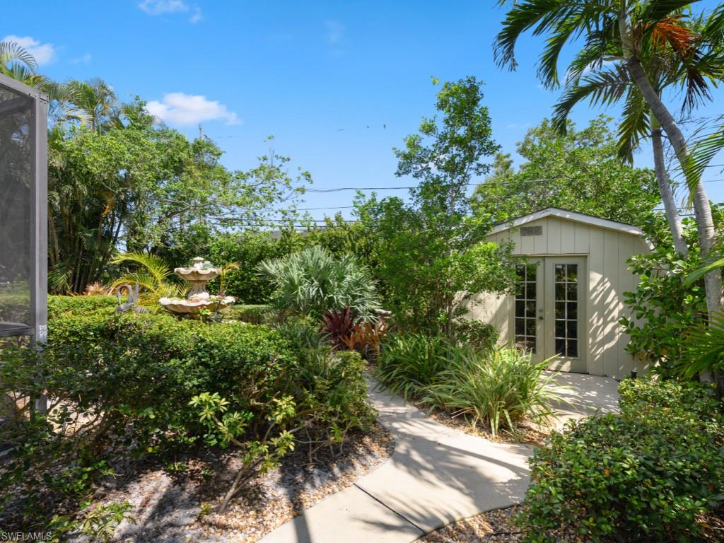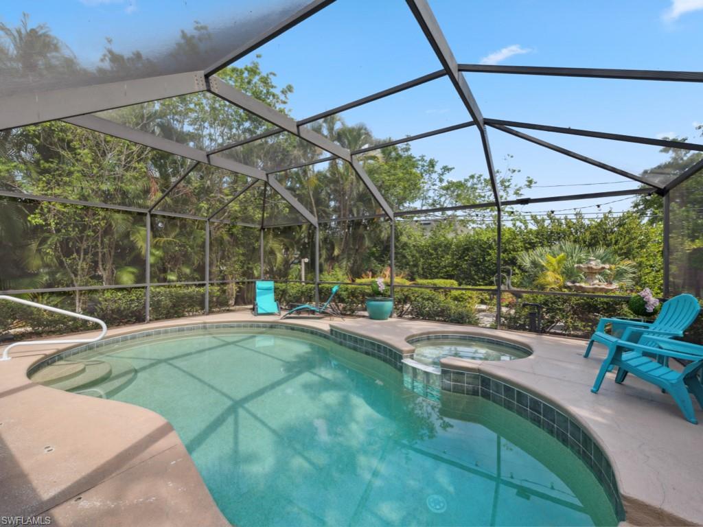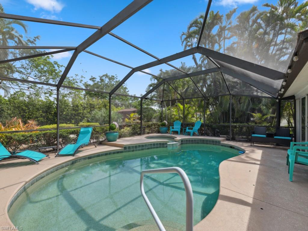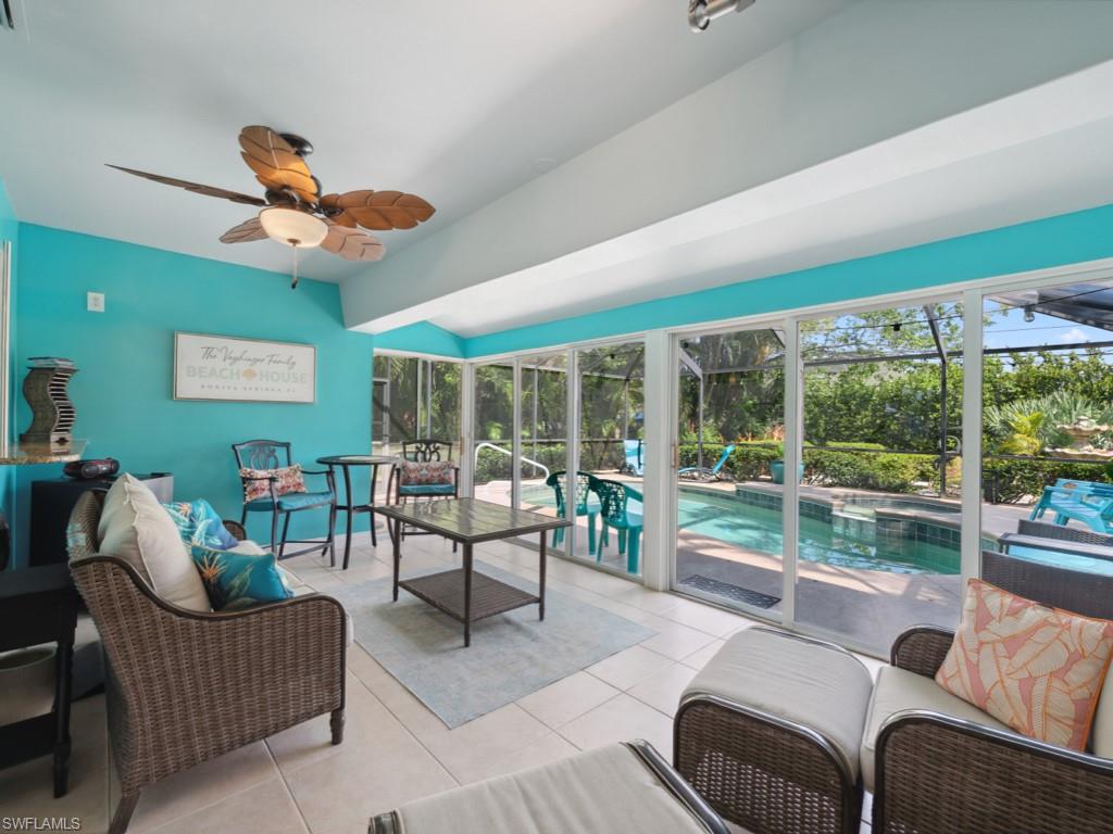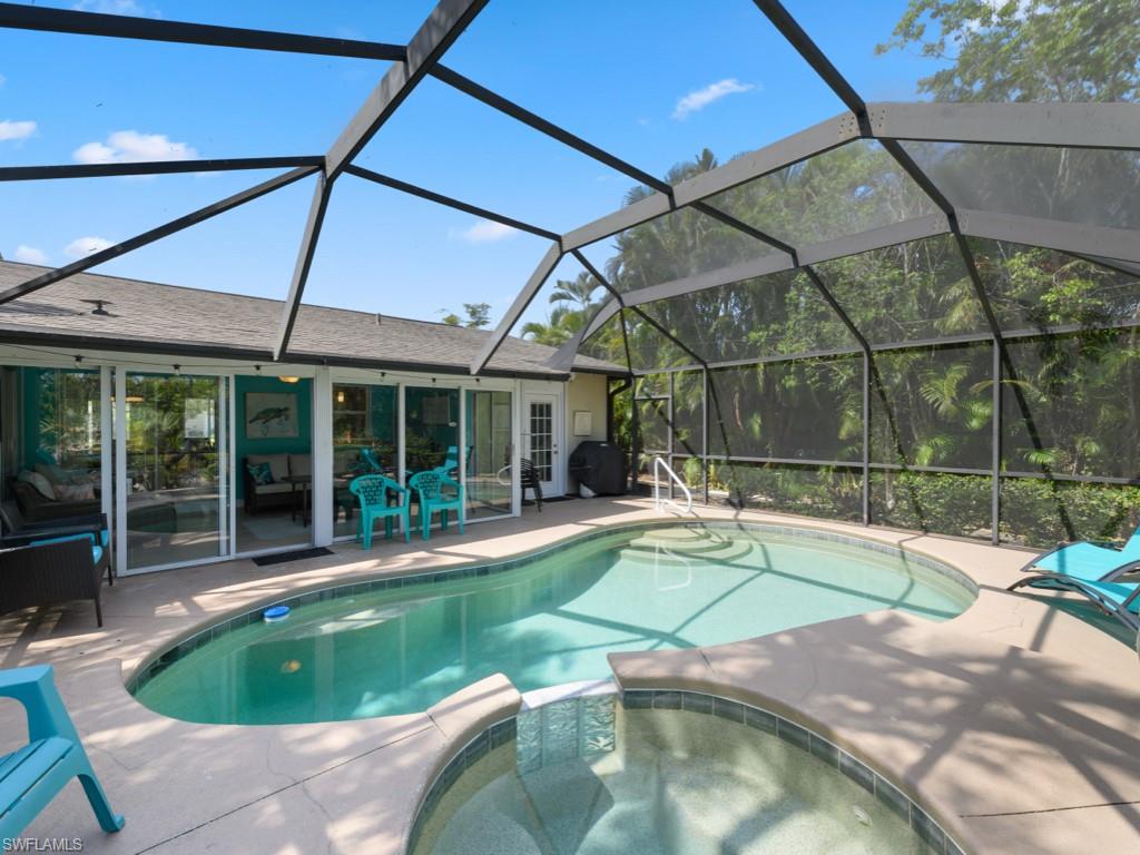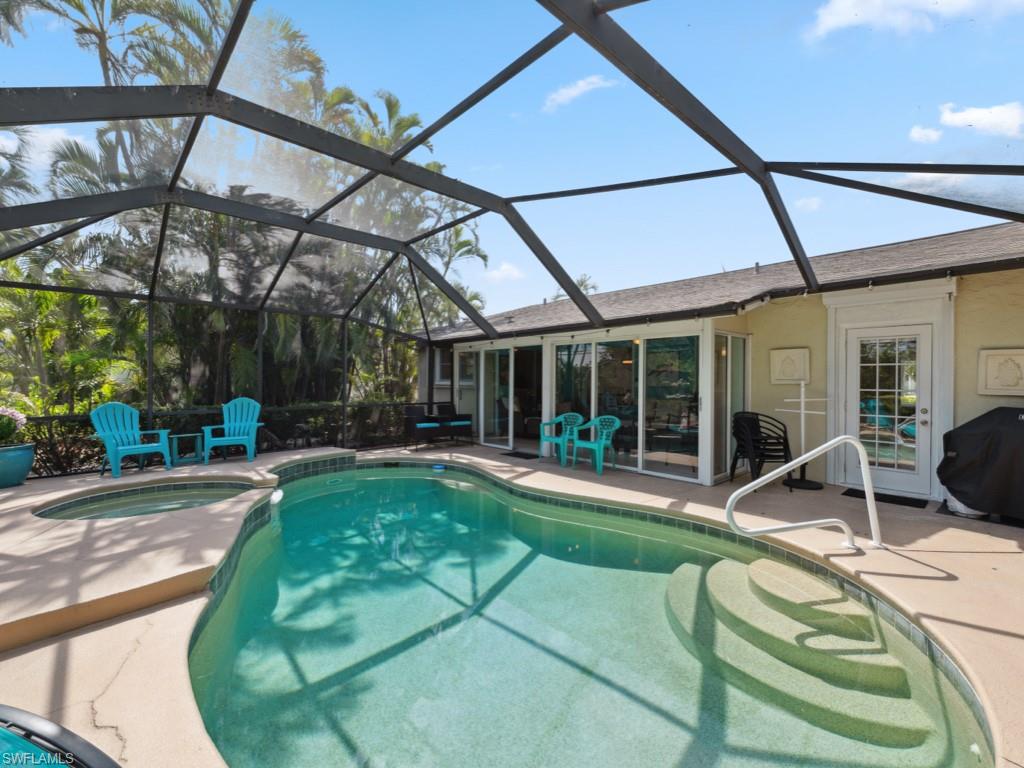 This move-in-ready, 3-bedroom, 2-bathroom single-family home offers the ultimate Florida lifestyle, just 5 minutes from the white, sandy beaches of Bonita Springs, shopping, dining and the array of amenities SW Florida has to offer. Nestled in a peaceful setting with lush, tropical landscaping, this residence provides privacy and tranquility. This lovely home features a spacious primary suite with a private bath that opens directly to the pool/spa area, perfect for relaxing or entertaining. The split bedroom floor plan includes two additional bedrooms on the opposite side of the home, one of which also opens to the Florida Room and pool beyond enhancing outdoor living options. A convenient bathroom is located just steps from the pool and lanai, adding to the seamless indoor-outdoor experience. Enjoy the Florida sunshine on the open front or rear patios, both ideal spots for unwinding. A glass-enclosed, 4 season Florida room offers versatile additional living space. Inside, easy-maintenance tile flooring flows throughout, combining charm and practicality.The property is situated outside of a flood zone, has hurricane protection, and did not flood during recent events. Notably, it features a 2019 roof for added peace of mind. For investors, this home has a strong rental history and comes turnkey furnished, ready for immediate occupancy or rental income. With no HOA, CDD, or rental restrictions, this charming property offers exceptional flexibility. Don’t miss the opportunity to make this Florida paradise your new home!