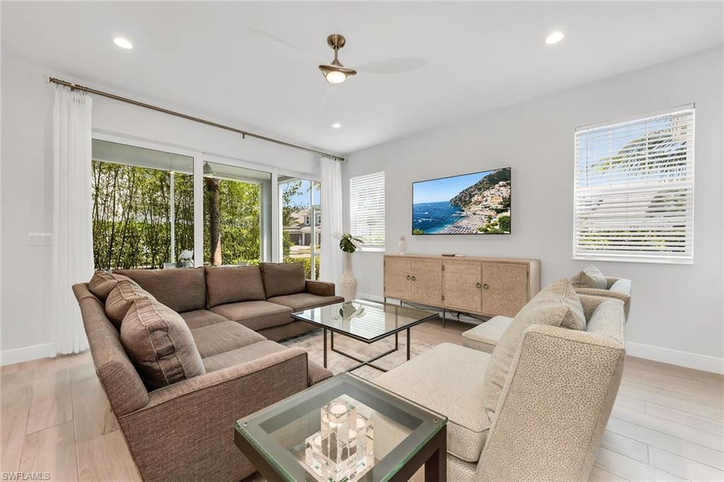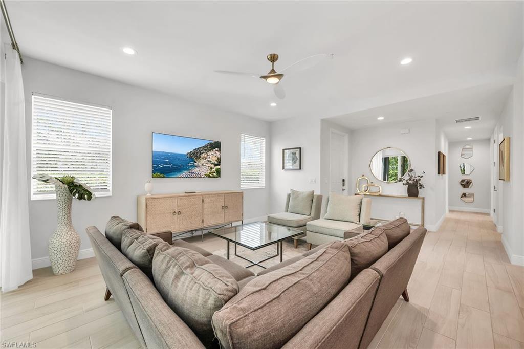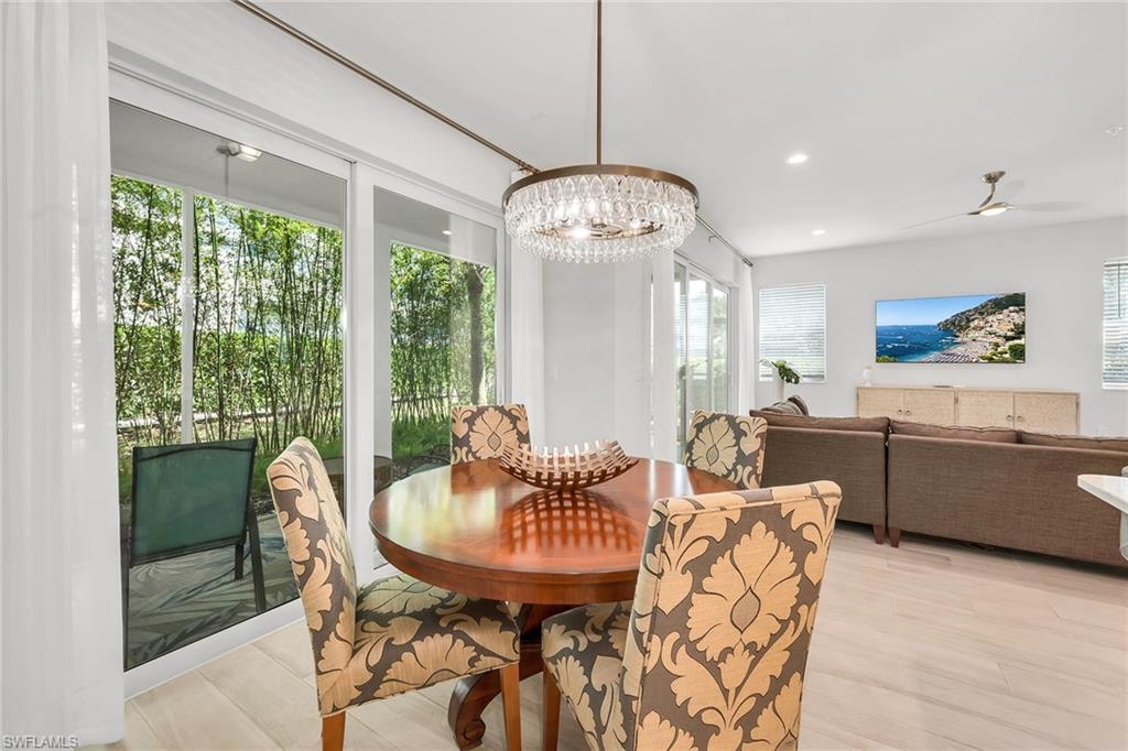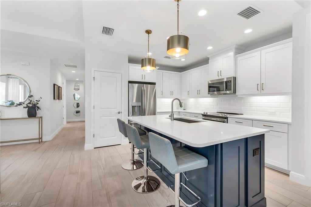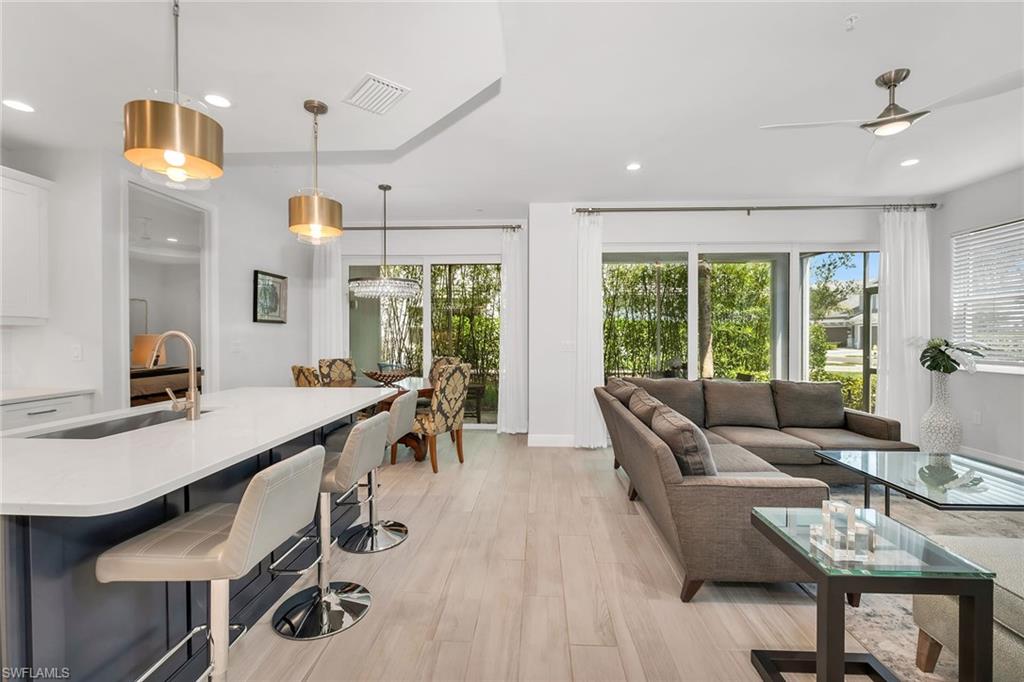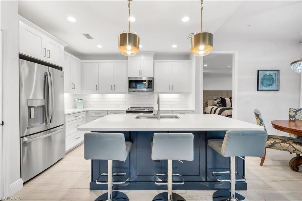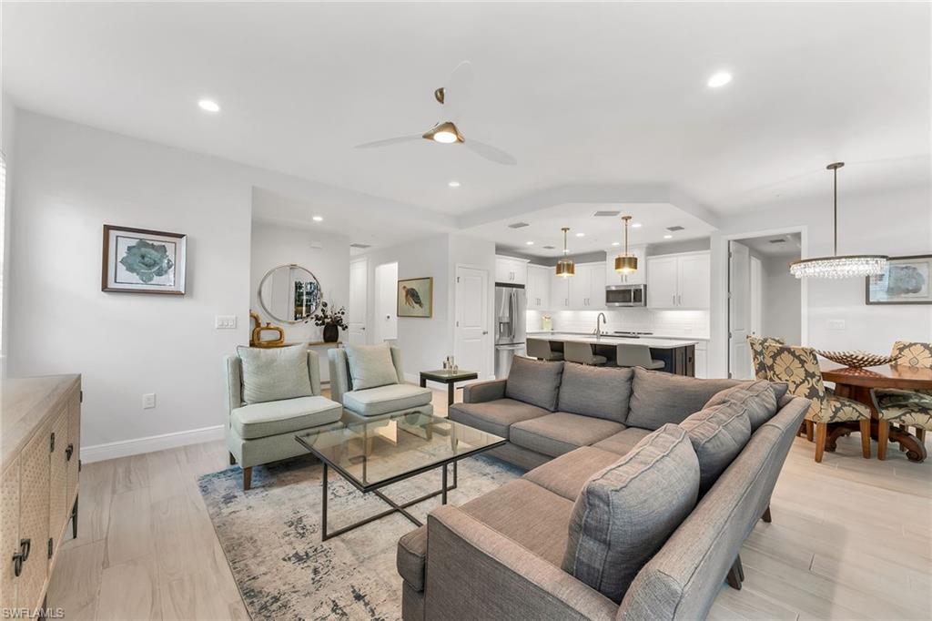 Are you seeking a move-in-ready residence that offers privacy, designer-curated interiors and effortless luxury? This fully furnished, first-floor Keswick end-unit carriage home, built in 2022, is the best priced property in Seychelles and showcases refined living with lush private garden views and southeastern exposure. Thoughtfully decorated by a professional interior designer, the residence is filled with modern finishes and timeless style, offering two bedrooms, two baths and impact-rated windows and doors throughout. Inside, the open floor plan features tile flooring in the main living areas, recessed lighting and an airy, sophisticated ambiance. The kitchen is a showpiece with white shaker-style cabinetry, under-cabinet lighting, quartz countertops, a tile backsplash and stainless steel appliances including a range, microwave and French-door refrigerator with ice maker. A large center island with a bar counter anchors the kitchen, seamlessly connecting to the adjacent dining area with a chandelier and spacious living room, both of which offer access to the landscaped lanai, a private retreat ideal for quiet mornings or alfresco entertaining. The primary suite features a tray ceiling and a beautifully designed en-suite bath with a dual-sink vanity, a frameless glass walk-in shower tiled floor-to-ceiling, and an oversized walk-in closet with built-in shelving in the bath for added convenience. The guest bedroom offers a large walk-in closet and is adjacent to a bath with a shower tub combo, providing comfort and privacy for visitors. Residents of Seychelles enjoy access to resort-style amenities, including a tropical pool, spa, state-of-the-art fitness center and a 4,500-square-foot clubhouse. Ideally minutes from Naples beaches, shopping and dining, this beautifully furnished home delivers comfort, sophistication and exceptional value in one of Southwest Florida’s desirable gated communities.