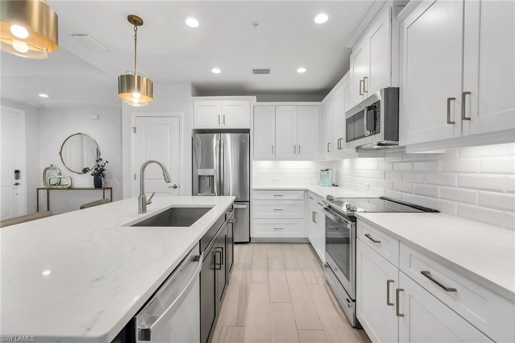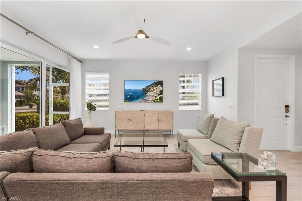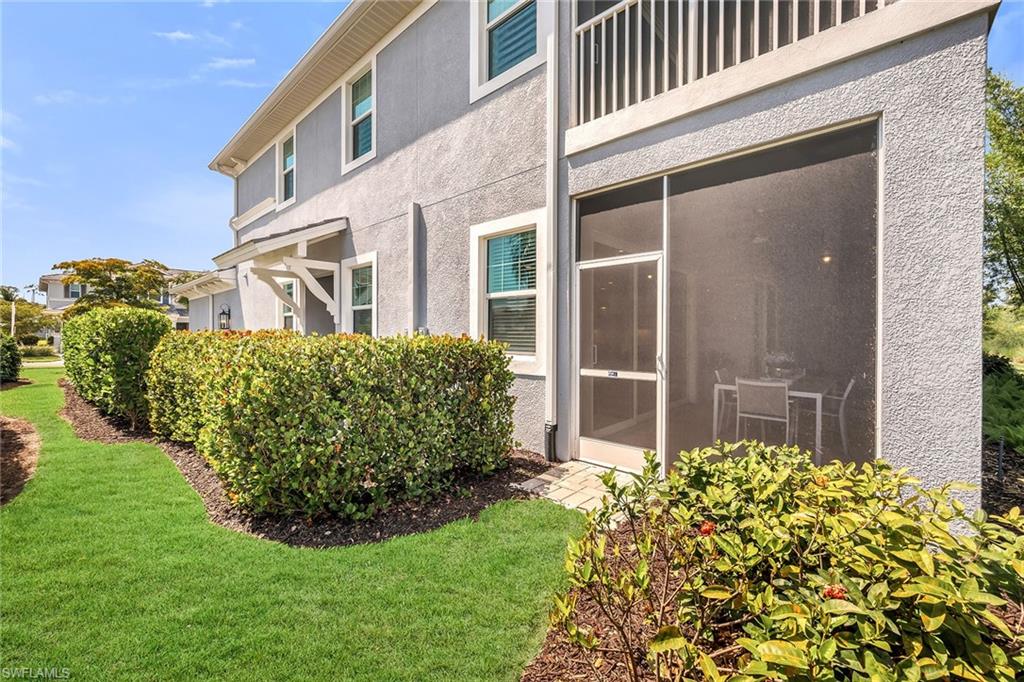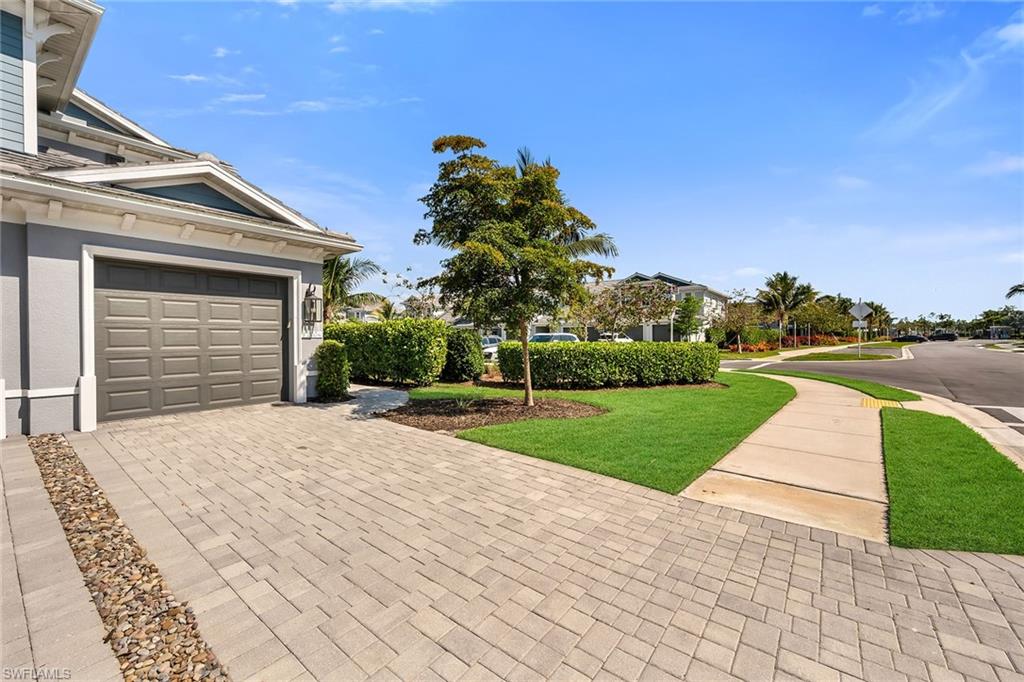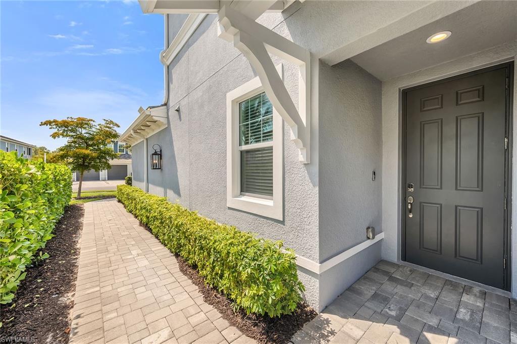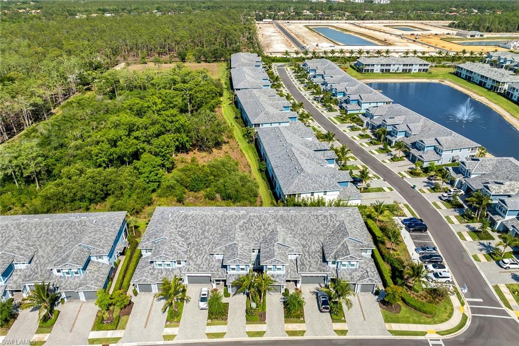 Are you seeking a move-in-ready residence that offers privacy, designer-curated interiors and effortless luxury? This fully furnished, first-floor Keswick end-unit carriage home, built in 2022, is the best priced property in Seychelles and showcases refined living with lush private garden views and southeastern exposure. Thoughtfully decorated by a professional interior designer, the residence is filled with modern finishes and timeless style, offering two bedrooms, two baths and impact-rated windows and doors throughout. Inside, the open floor plan features tile flooring in the main living areas, recessed lighting and an airy, sophisticated ambiance. The kitchen is a showpiece with white shaker-style cabinetry, under-cabinet lighting, quartz countertops, a tile backsplash and stainless steel appliances including a range, microwave and French-door refrigerator with ice maker. A large center island with a bar counter anchors the kitchen, seamlessly connecting to the adjacent dining area with a chandelier and spacious living room, both of which offer access to the landscaped lanai, a private retreat ideal for quiet mornings or alfresco entertaining. The primary suite features a tray ceiling and a beautifully designed en-suite bath with a dual-sink vanity, a frameless glass walk-in shower tiled floor-to-ceiling, and an oversized walk-in closet with built-in shelving in the bath for added convenience. The guest bedroom offers a large walk-in closet and is adjacent to a bath with a shower tub combo, providing comfort and privacy for visitors. Residents of Seychelles enjoy access to resort-style amenities, including a tropical pool, spa, state-of-the-art fitness center and a 4,500-square-foot clubhouse. Ideally minutes from Naples beaches, shopping and dining, this beautifully furnished home delivers comfort, sophistication and exceptional value in one of Southwest Florida’s desirable gated communities.