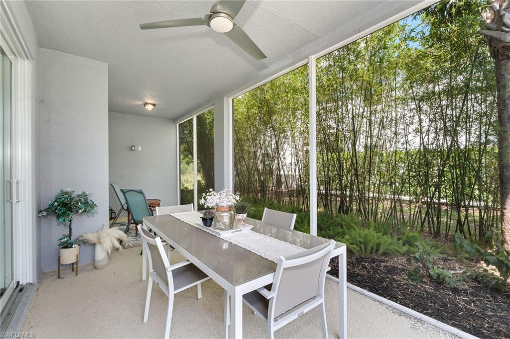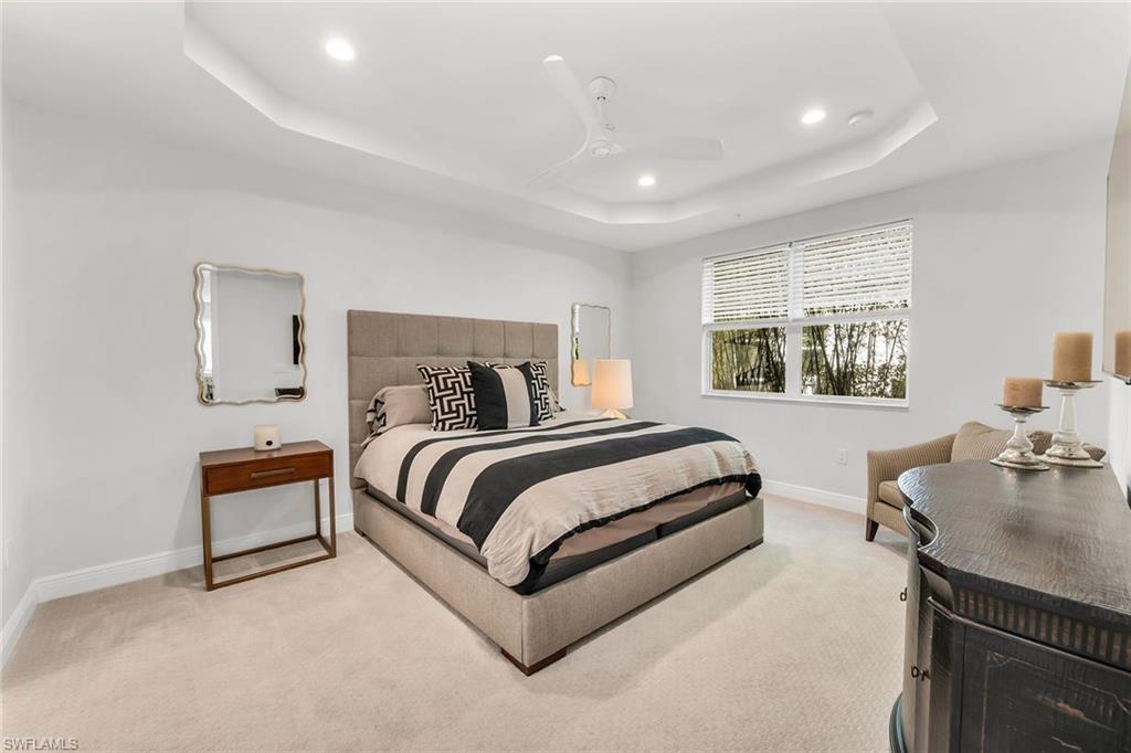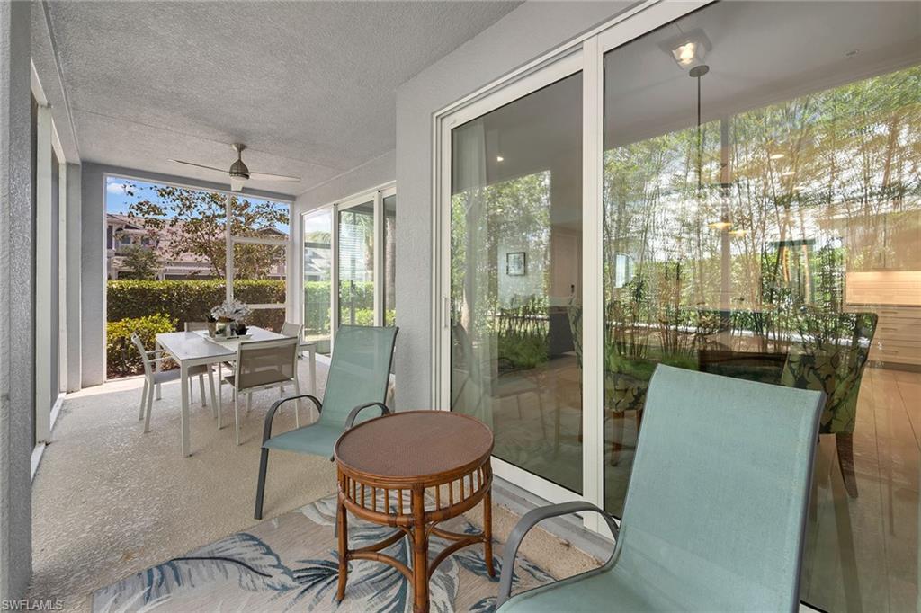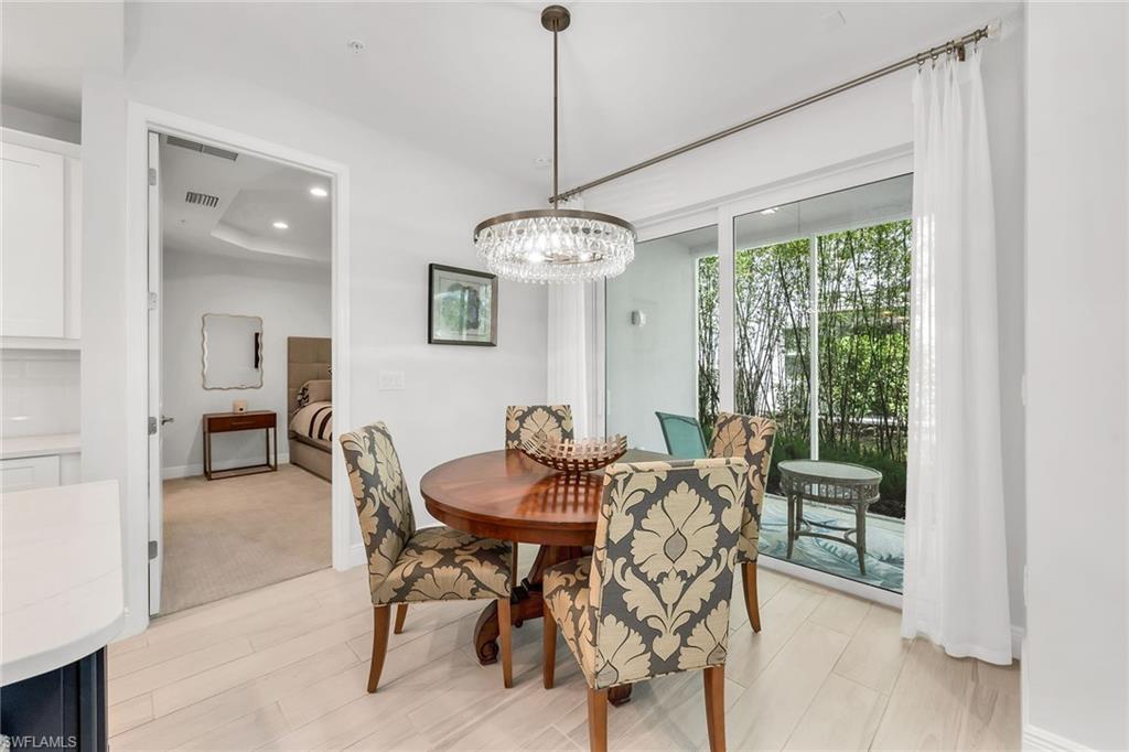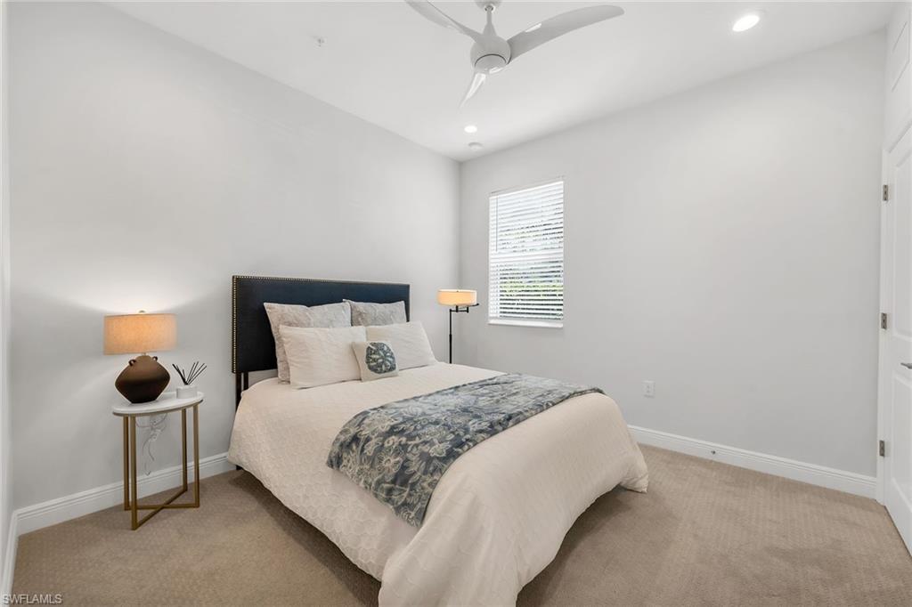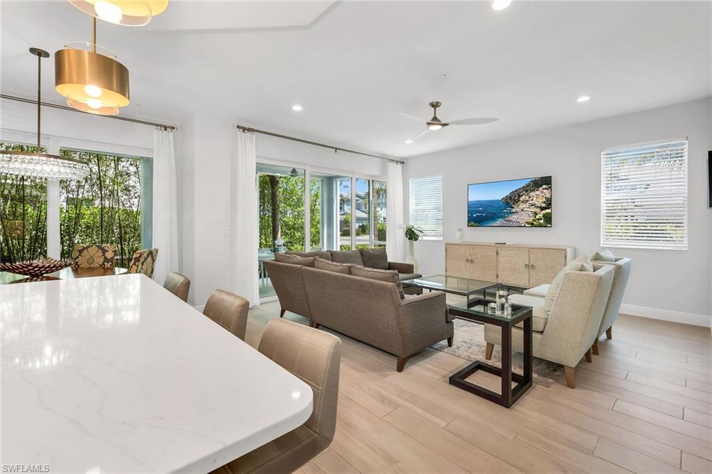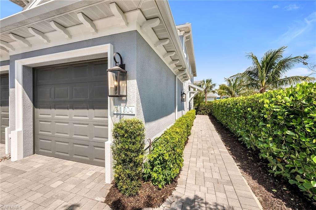 Are you seeking a move-in-ready residence that offers privacy, designer-curated interiors and effortless luxury? This fully furnished, first-floor Keswick end-unit carriage home, built in 2022, is the best priced property in Seychelles and showcases refined living with lush private garden views and southeastern exposure. Thoughtfully decorated by a professional interior designer, the residence is filled with modern finishes and timeless style, offering two bedrooms, two baths and impact-rated windows and doors throughout. Inside, the open floor plan features tile flooring in the main living areas, recessed lighting and an airy, sophisticated ambiance. The kitchen is a showpiece with white shaker-style cabinetry, under-cabinet lighting, quartz countertops, a tile backsplash and stainless steel appliances including a range, microwave and French-door refrigerator with ice maker. A large center island with a bar counter anchors the kitchen, seamlessly connecting to the adjacent dining area with a chandelier and spacious living room, both of which offer access to the landscaped lanai, a private retreat ideal for quiet mornings or alfresco entertaining. The primary suite features a tray ceiling and a beautifully designed en-suite bath with a dual-sink vanity, a frameless glass walk-in shower tiled floor-to-ceiling, and an oversized walk-in closet with built-in shelving in the bath for added convenience. The guest bedroom offers a large walk-in closet and is adjacent to a bath with a shower tub combo, providing comfort and privacy for visitors. Residents of Seychelles enjoy access to resort-style amenities, including a tropical pool, spa, state-of-the-art fitness center and a 4,500-square-foot clubhouse. Ideally minutes from Naples beaches, shopping and dining, this beautifully furnished home delivers comfort, sophistication and exceptional value in one of Southwest Florida’s desirable gated communities.