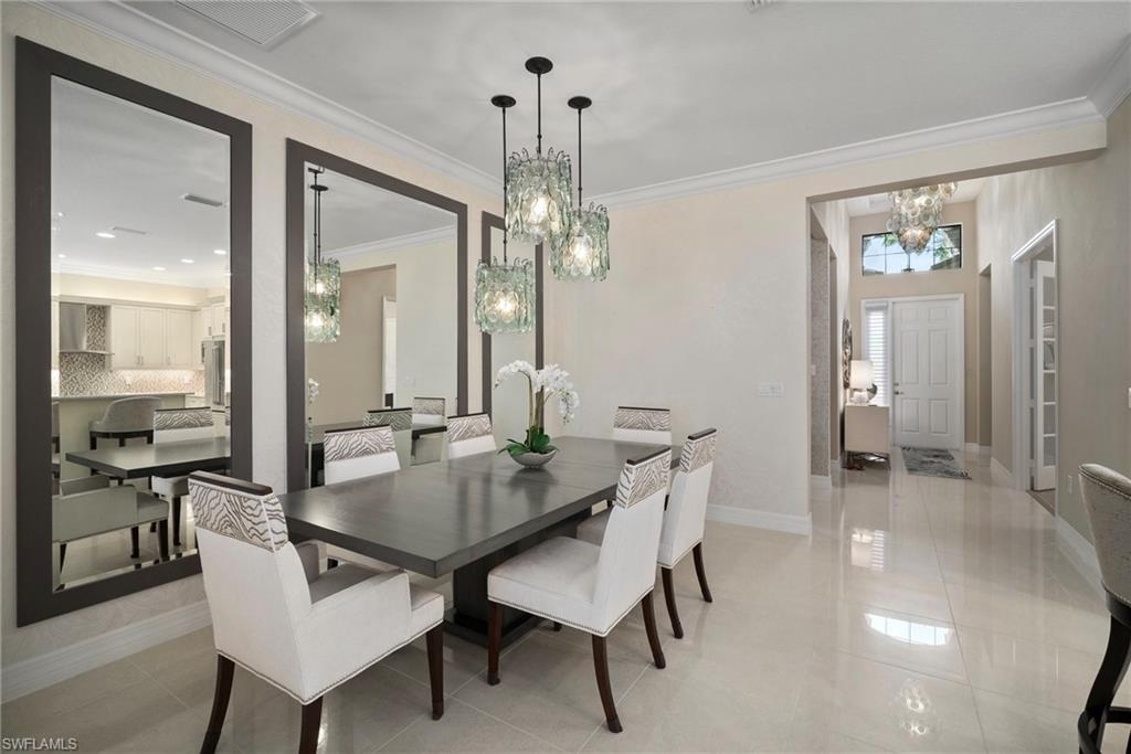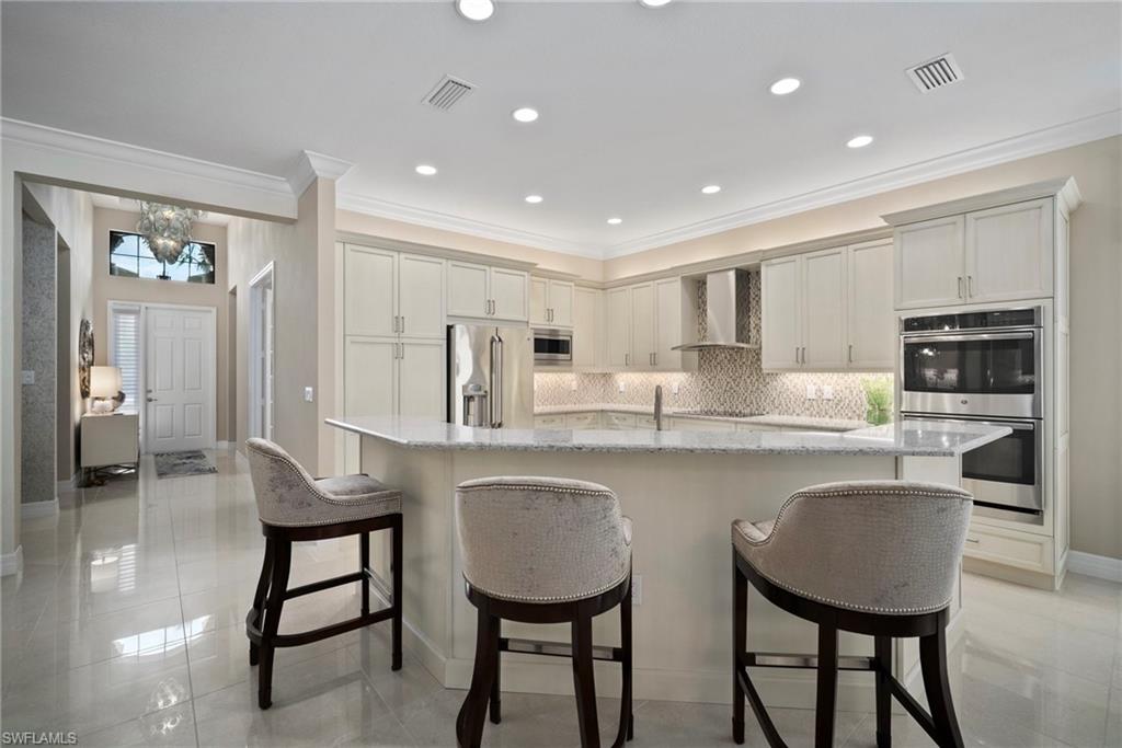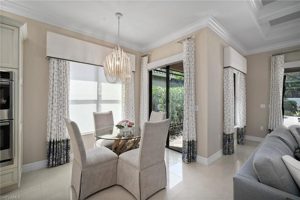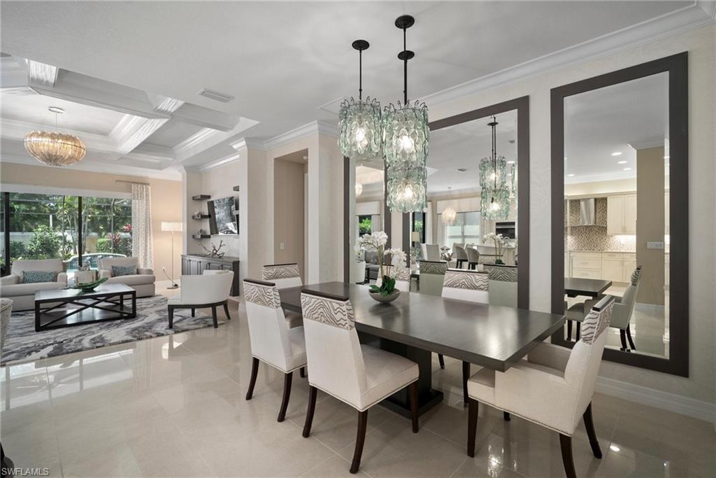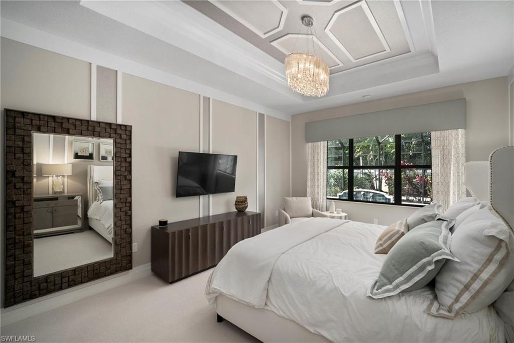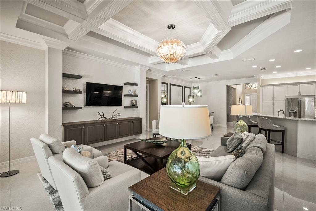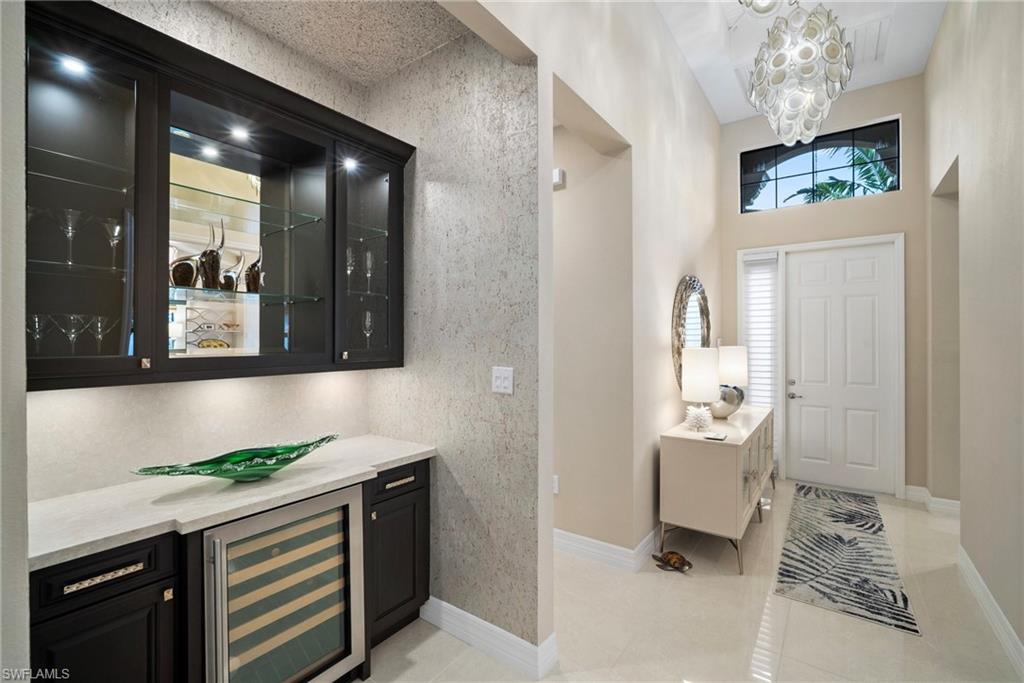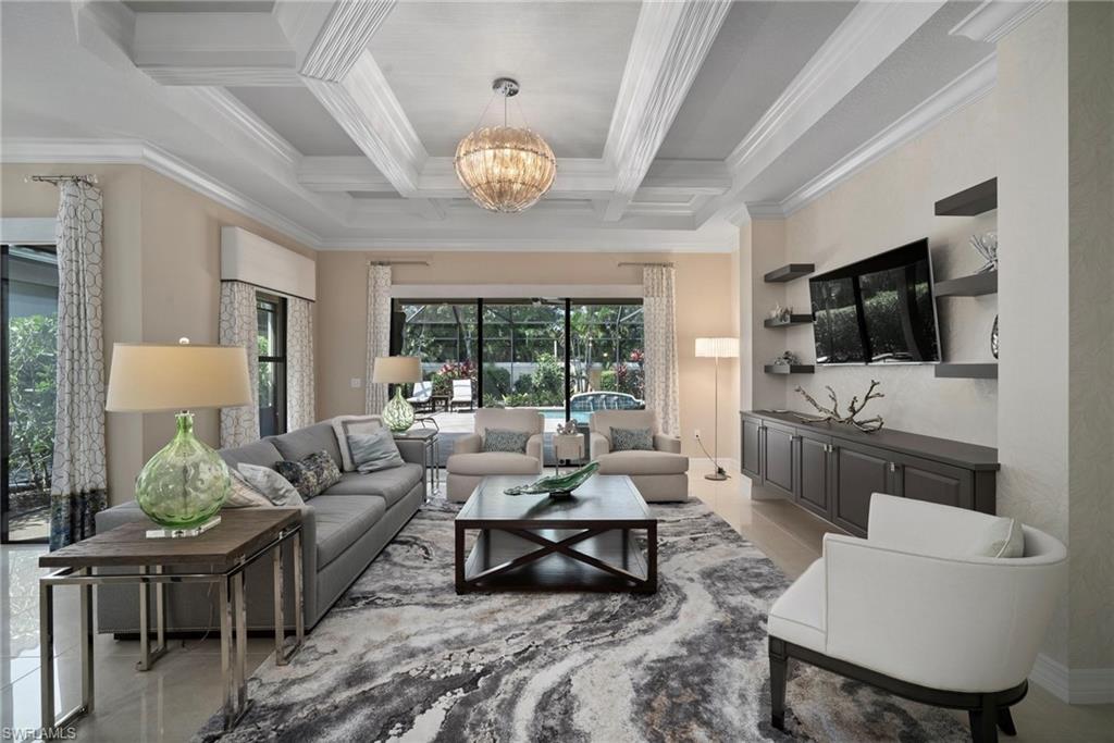 Professionally curated by Design West with over $300,000 in upgrades, this home showcases quality and style with custom coffered ceilings, elegant lighting, and premium finishes throughout. The open-concept layout blends everyday comfort with an entertainer’s flair featuring a custom media wall, and a built-in bar with wine cooler. There is meticulous attention to detail in the wall coverings, blinds and draperies which highlight the natural light and space. The kitchen offers quartz countertops, high-end appliances, and custom cabinetry with built-in pantry, and roll out drawers for smart, stylish storage. Every detail speaks to high end craftsmanship, from extensive woodwork around windows, doors, and mirrors, deep baseboards, crown molding, and intricate custom ceiling woodwork that elevate the entire space. All closets have been custom built as well. The owner’s suite is a true retreat with its custom ceiling and wall treatments. There are two fully built-out closets and a spacious spa-inspired bathroom that invites relaxation. Each guest suite enjoys its own private bath and wing for privacy. Throughout the home, custom window treatments—including silhouette shades and elegant drapery add warmth and privacy. All the bedrooms have remote powered blackout blinds. Step outside to a serene oasis with lush landscaping, a saltwater pool with a tranquil fountain, and a spacious covered lanai—perfect for year-round dining and entertaining. A whole house generator with 500 gallon propane tank, impact-rated windows and StormSmart hurricane screens provide peace of mind, while the epoxy-coated garage floor with built-in storage completes this one-of-a-kind offering. Marbella Isles offers world-class amenities and is conveniently located in the heart of Naples, in a great school district, just minutes from beaches, shopping, and downtown. Amenities include active pickleball & tennis programs, bocce courts, a resort-style pool, separate pool & play area for kids, world-class clubhouse with a fitness center, half-court basketball, & kitchen and games rooms. The community is meticulously maintained, has a solid HOA board and strong cash reserves.