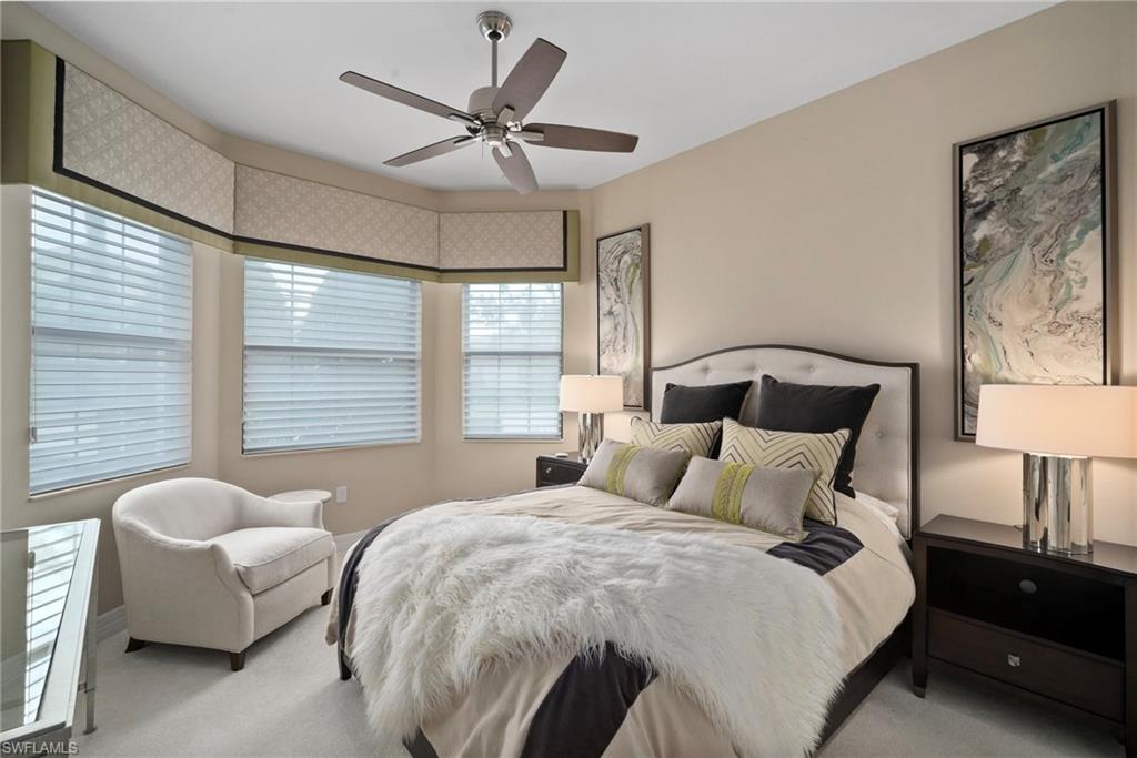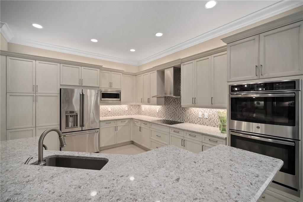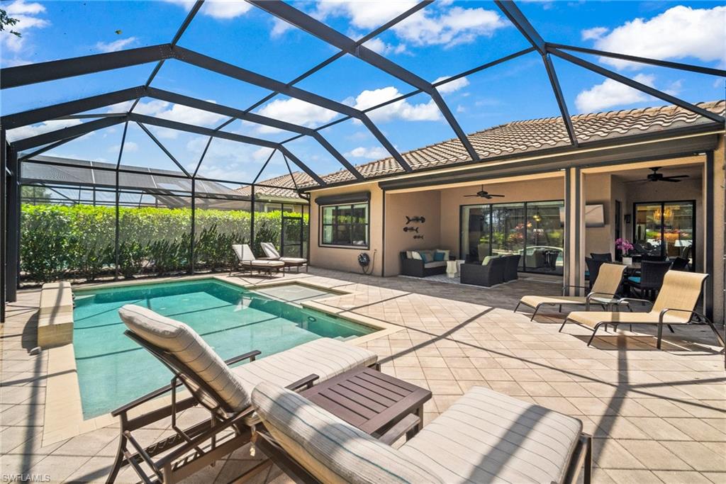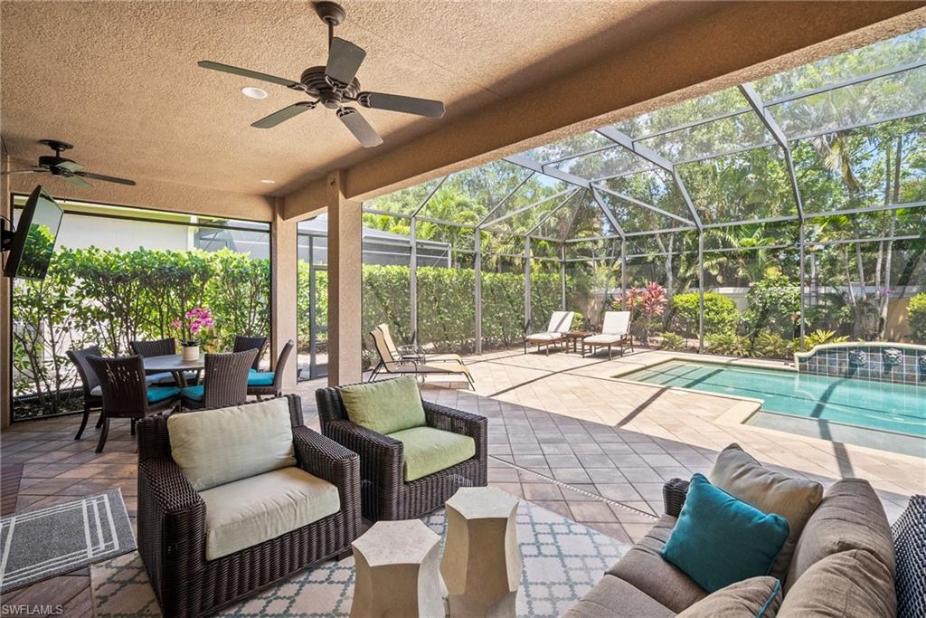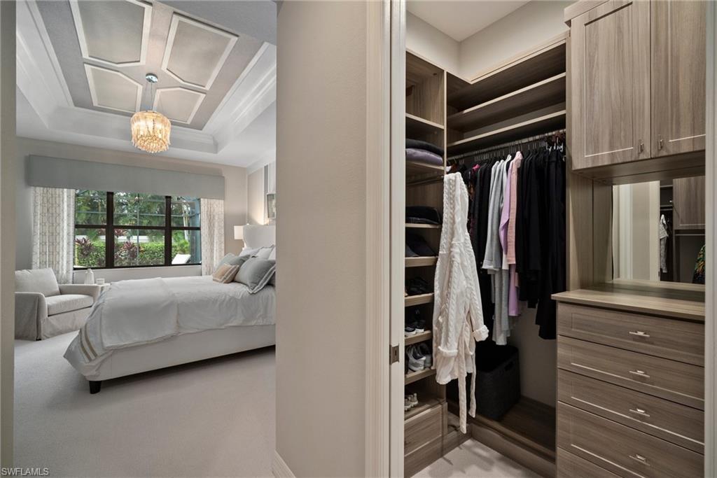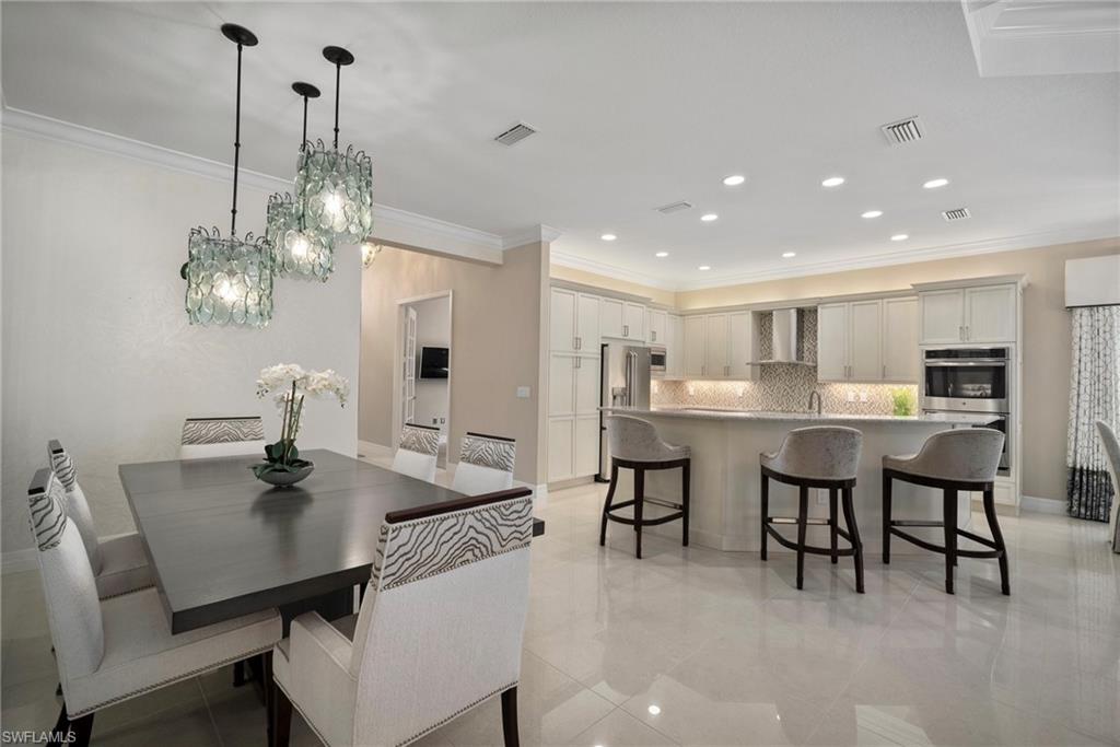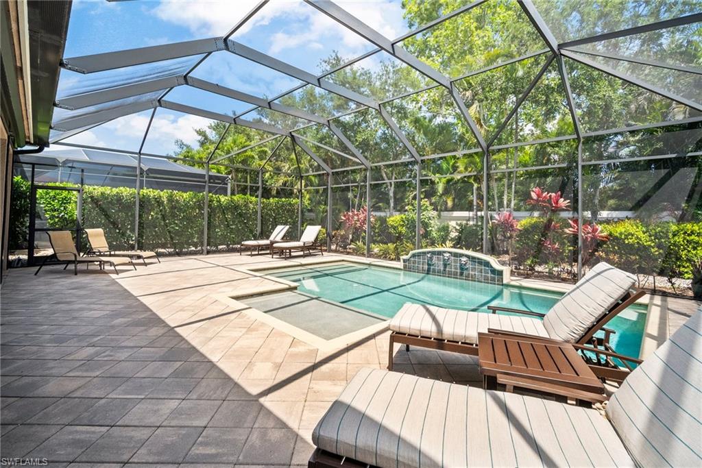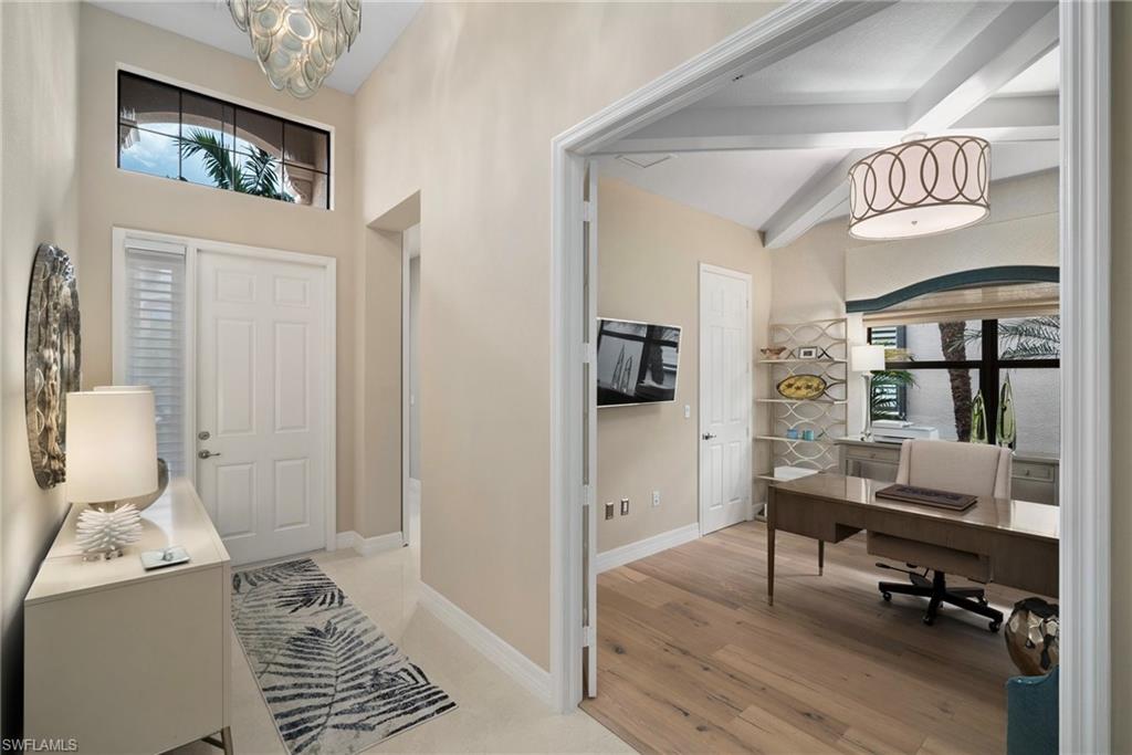 Professionally curated by Design West with over $300,000 in upgrades, this home showcases quality and style with custom coffered ceilings, elegant lighting, and premium finishes throughout. The open-concept layout blends everyday comfort with an entertainer’s flair featuring a custom media wall, and a built-in bar with wine cooler. There is meticulous attention to detail in the wall coverings, blinds and draperies which highlight the natural light and space. The kitchen offers quartz countertops, high-end appliances, and custom cabinetry with built-in pantry, and roll out drawers for smart, stylish storage. Every detail speaks to high end craftsmanship, from extensive woodwork around windows, doors, and mirrors, deep baseboards, crown molding, and intricate custom ceiling woodwork that elevate the entire space. All closets have been custom built as well. The owner’s suite is a true retreat with its custom ceiling and wall treatments. There are two fully built-out closets and a spacious spa-inspired bathroom that invites relaxation. Each guest suite enjoys its own private bath and wing for privacy. Throughout the home, custom window treatments—including silhouette shades and elegant drapery add warmth and privacy. All the bedrooms have remote powered blackout blinds. Step outside to a serene oasis with lush landscaping, a saltwater pool with a tranquil fountain, and a spacious covered lanai—perfect for year-round dining and entertaining. A whole house generator with 500 gallon propane tank, impact-rated windows and StormSmart hurricane screens provide peace of mind, while the epoxy-coated garage floor with built-in storage completes this one-of-a-kind offering. Marbella Isles offers world-class amenities and is conveniently located in the heart of Naples, in a great school district, just minutes from beaches, shopping, and downtown. Amenities include active pickleball & tennis programs, bocce courts, a resort-style pool, separate pool & play area for kids, world-class clubhouse with a fitness center, half-court basketball, & kitchen and games rooms. The community is meticulously maintained, has a solid HOA board and strong cash reserves.