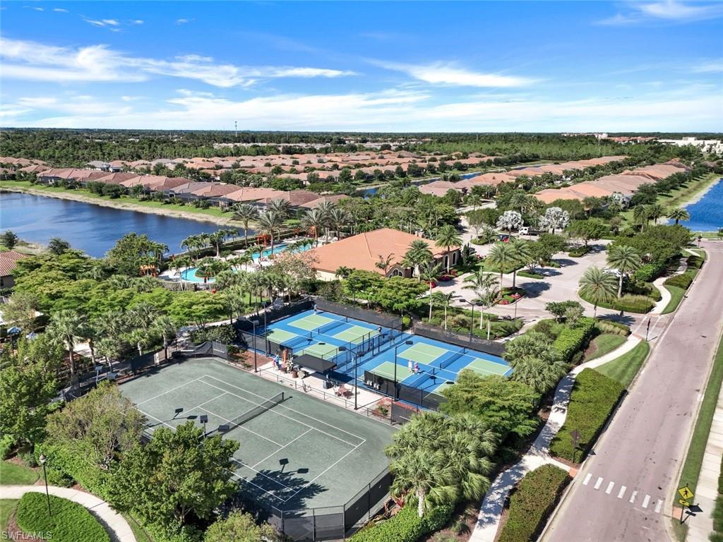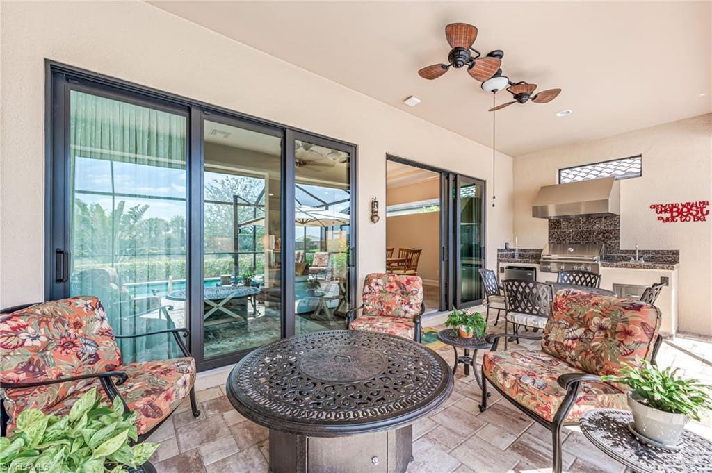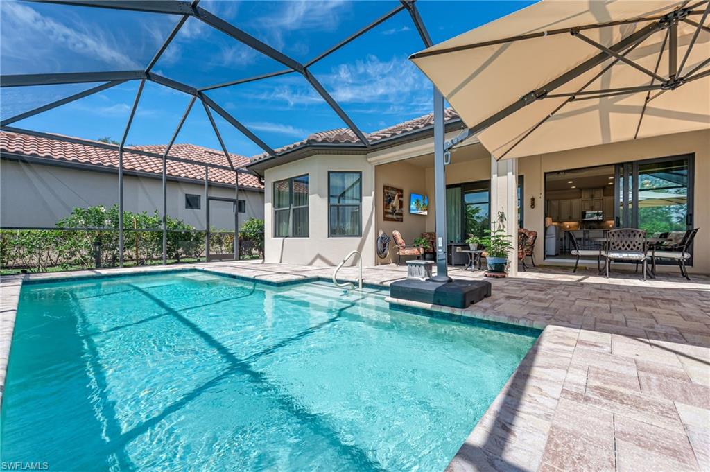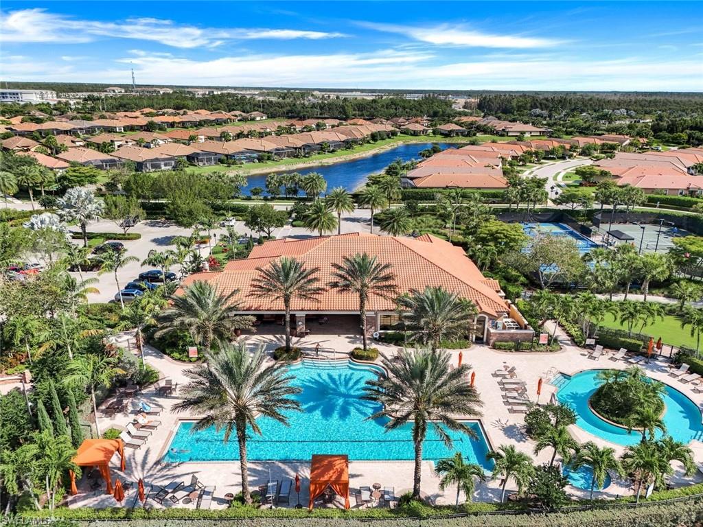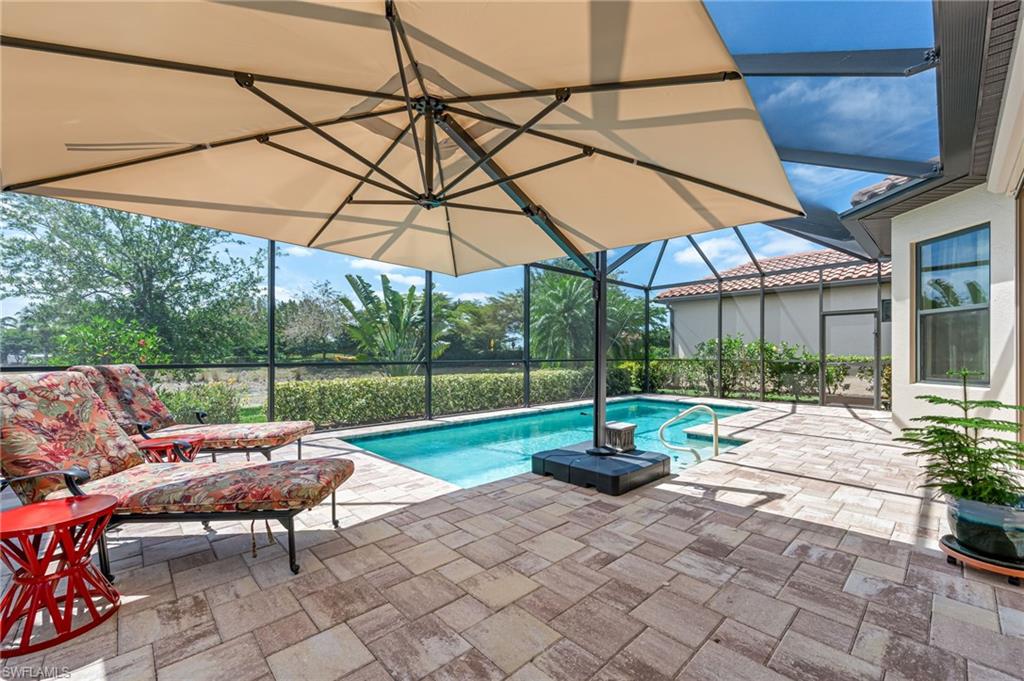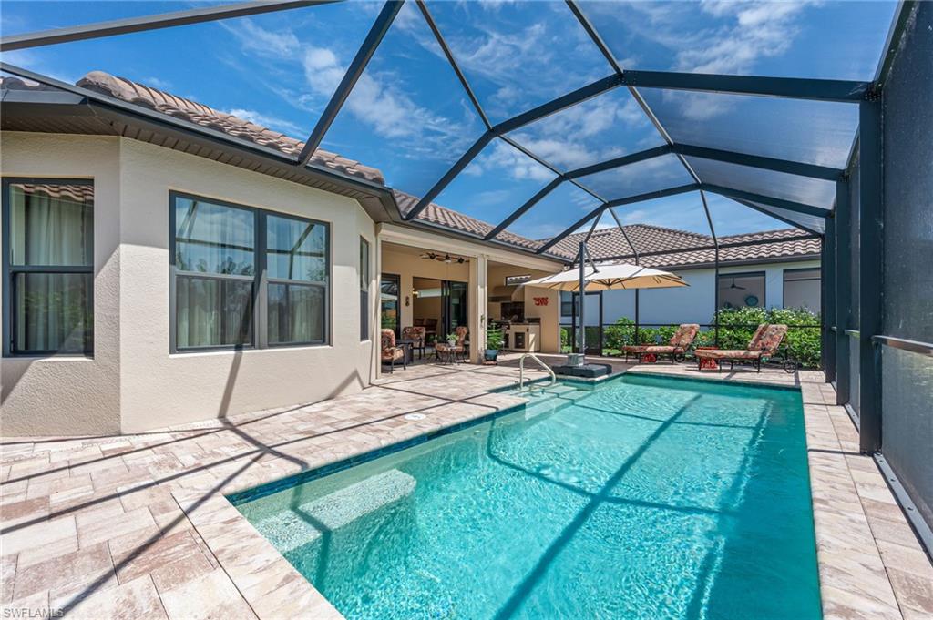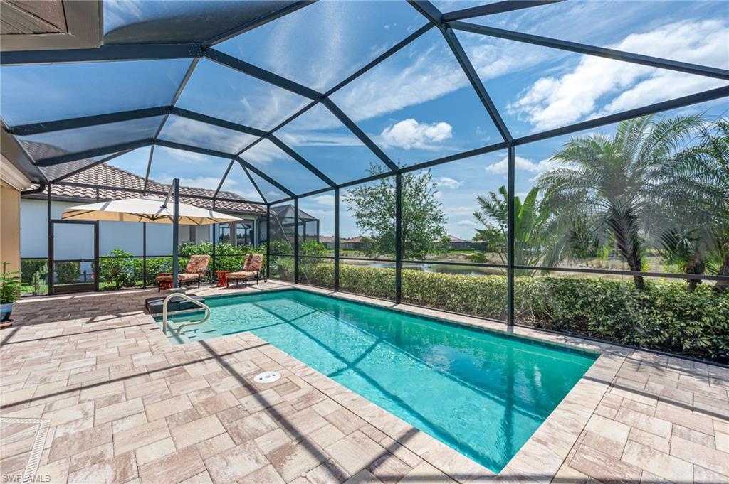 Move-in ready beautiful 2 Bed Plus Den, 2 Full Baths, 2 car garage with Furnishings Negotiable! Steps from the Clubhouse! The large outdoor extended lanai area includes an outdoor kitchen for entertaining, saltwater gas heated pool and a south eastern water view with added lush landscaping! Open great room and gourmet kitchen with quartz tops and wine cooler with natural gas cooking. The large primary suite has two walk-in closets and a large bathroom with glass shower and dual sinks. The guest bedroom is set apart from the primary suite for privacy. Large laundry room with laundry sink and plenty of cabinetry. Impact doors and windows and storm smart shutters! Tile on the diagonal throughout, tray ceilings and crown molding, tankless water heater, whole home surge protection and an electric car plug in. Esplanade at Hacienda Lakes resort style community with low HOA fees and close proximity to Marco Island and Downtown Naples beaches, dining and shopping. The clubhouse includes a lifestyle director with a fitness center, tennis and pickleball courts, pool and hot tub, gathering social room with catering kitchen and a dog park.
