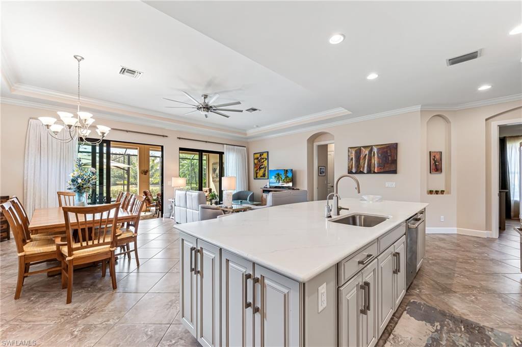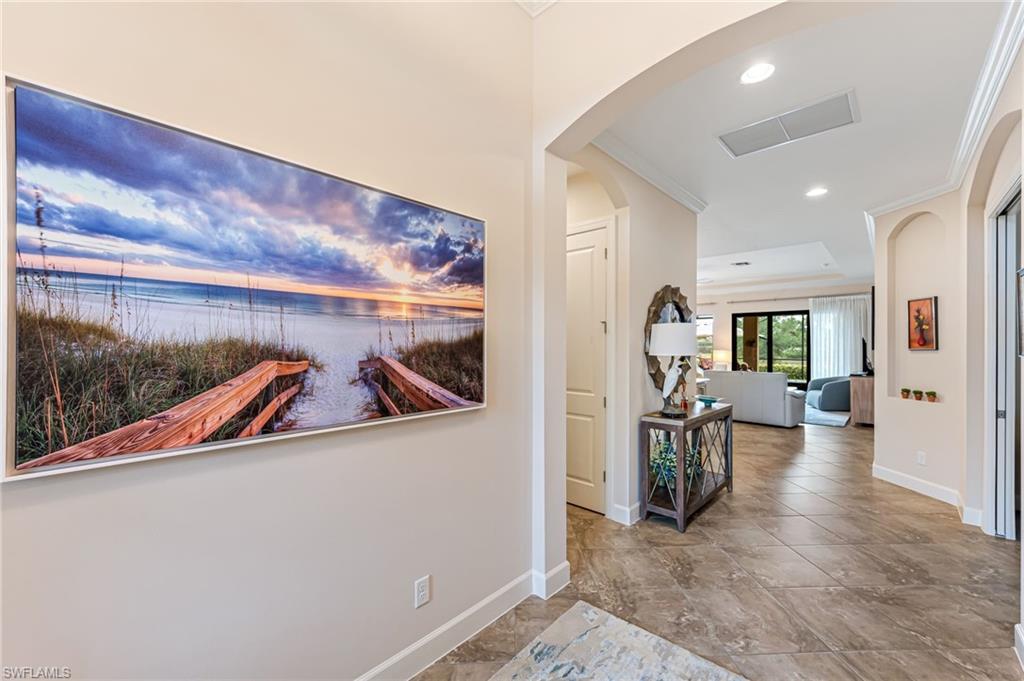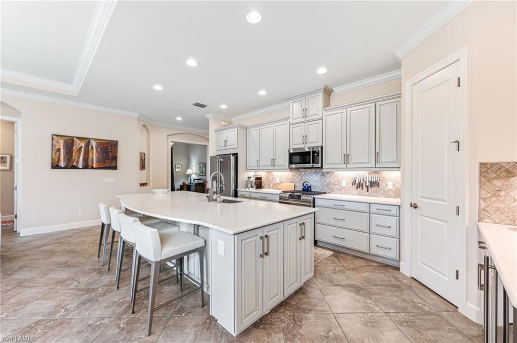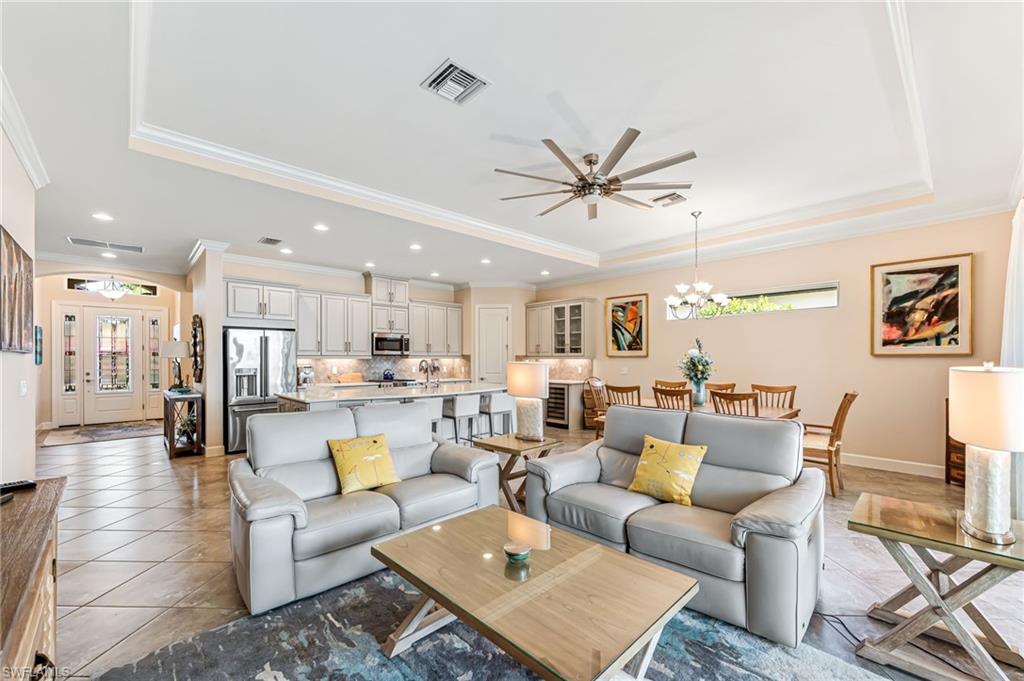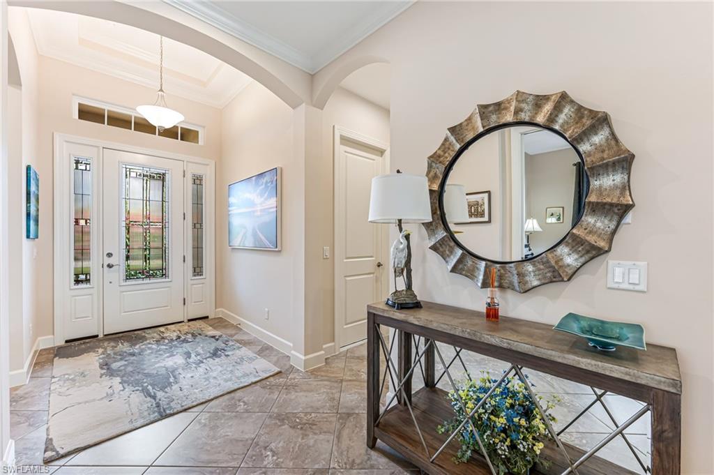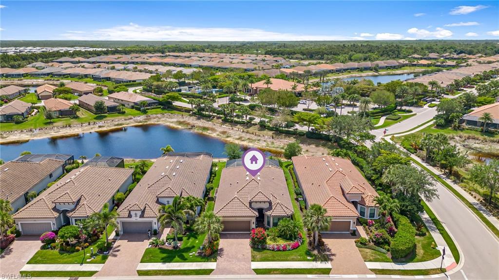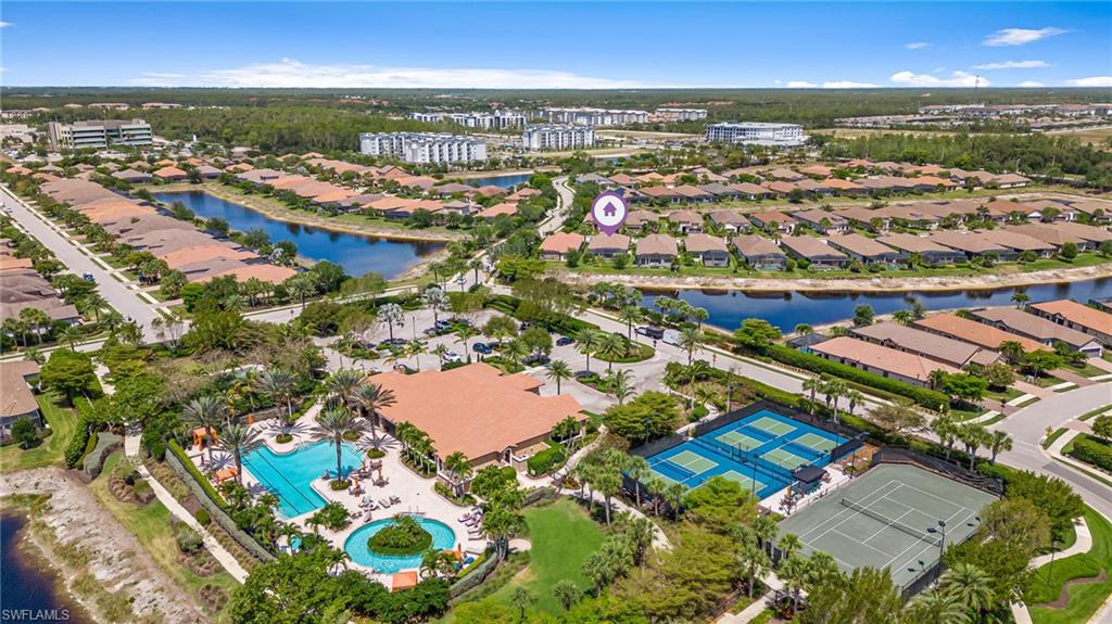 Move-in ready beautiful 2 Bed Plus Den, 2 Full Baths, 2 car garage with Furnishings Negotiable! Steps from the Clubhouse! The large outdoor extended lanai area includes an outdoor kitchen for entertaining, saltwater gas heated pool and a south eastern water view with added lush landscaping! Open great room and gourmet kitchen with quartz tops and wine cooler with natural gas cooking. The large primary suite has two walk-in closets and a large bathroom with glass shower and dual sinks. The guest bedroom is set apart from the primary suite for privacy. Large laundry room with laundry sink and plenty of cabinetry. Impact doors and windows and storm smart shutters! Tile on the diagonal throughout, tray ceilings and crown molding, tankless water heater, whole home surge protection and an electric car plug in. Esplanade at Hacienda Lakes resort style community with low HOA fees and close proximity to Marco Island and Downtown Naples beaches, dining and shopping. The clubhouse includes a lifestyle director with a fitness center, tennis and pickleball courts, pool and hot tub, gathering social room with catering kitchen and a dog park.