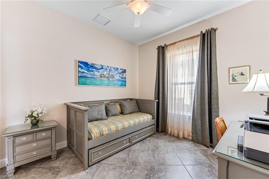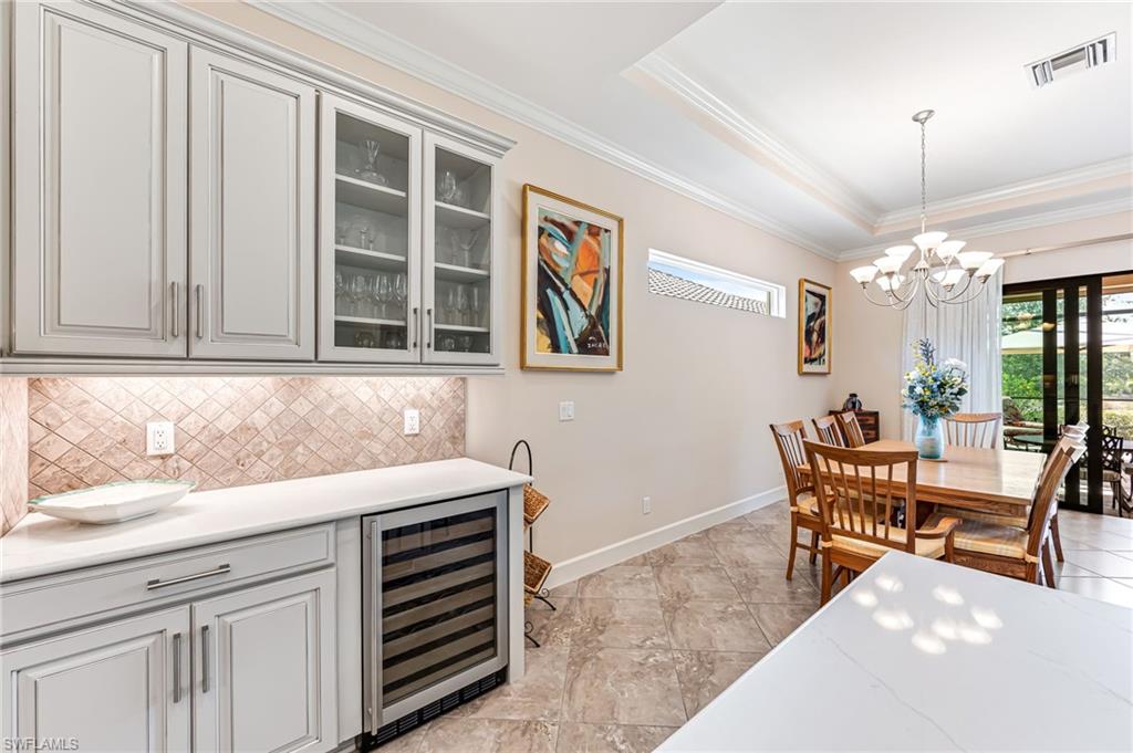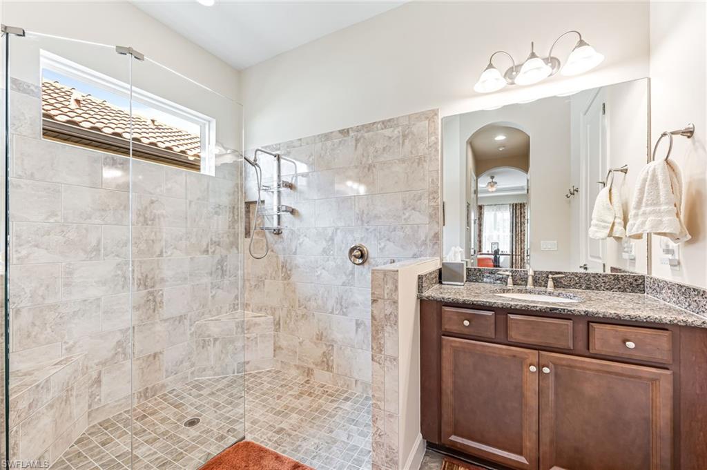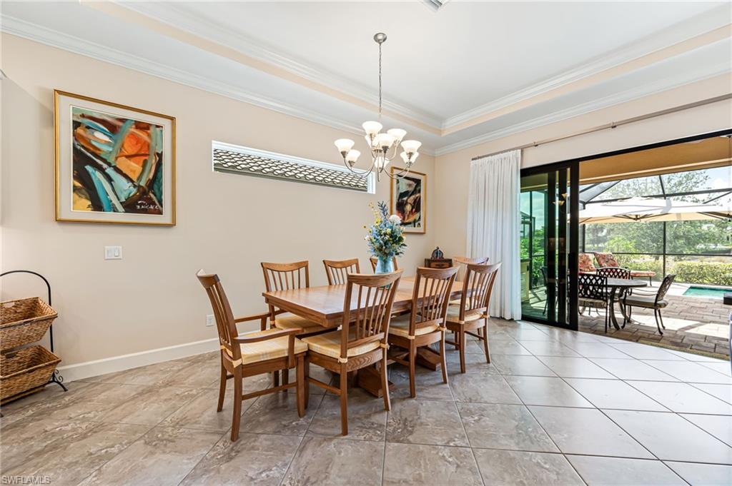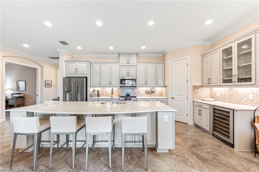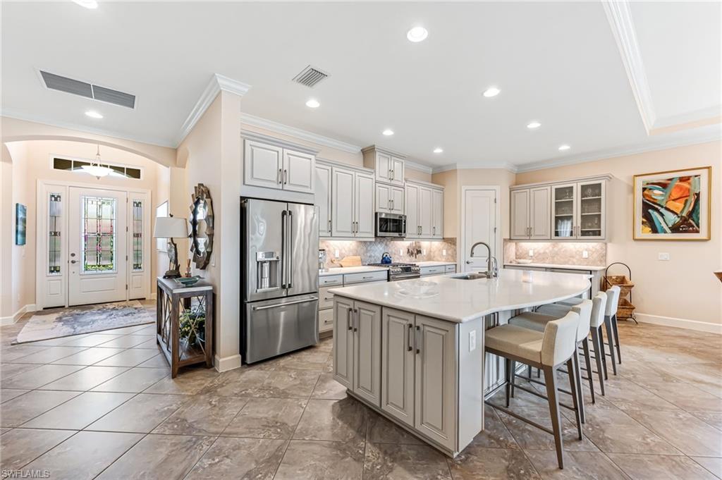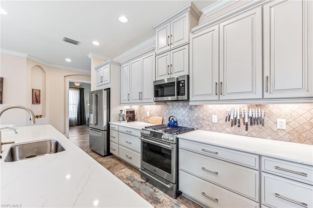 Move-in ready beautiful 2 Bed Plus Den, 2 Full Baths, 2 car garage with Furnishings Negotiable! Steps from the Clubhouse! The large outdoor extended lanai area includes an outdoor kitchen for entertaining, saltwater gas heated pool and a south eastern water view with added lush landscaping! Open great room and gourmet kitchen with quartz tops and wine cooler with natural gas cooking. The large primary suite has two walk-in closets and a large bathroom with glass shower and dual sinks. The guest bedroom is set apart from the primary suite for privacy. Large laundry room with laundry sink and plenty of cabinetry. Impact doors and windows and storm smart shutters! Tile on the diagonal throughout, tray ceilings and crown molding, tankless water heater, whole home surge protection and an electric car plug in. Esplanade at Hacienda Lakes resort style community with low HOA fees and close proximity to Marco Island and Downtown Naples beaches, dining and shopping. The clubhouse includes a lifestyle director with a fitness center, tennis and pickleball courts, pool and hot tub, gathering social room with catering kitchen and a dog park.