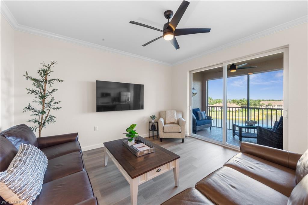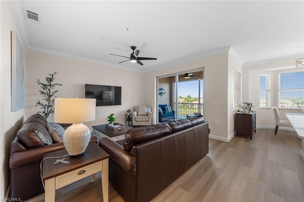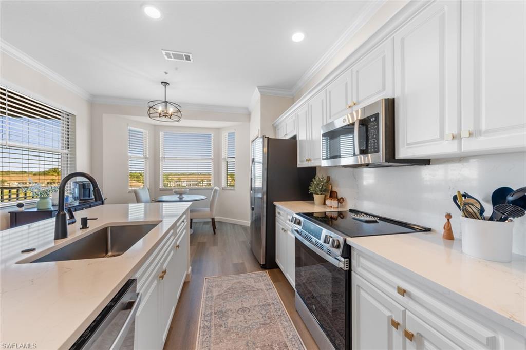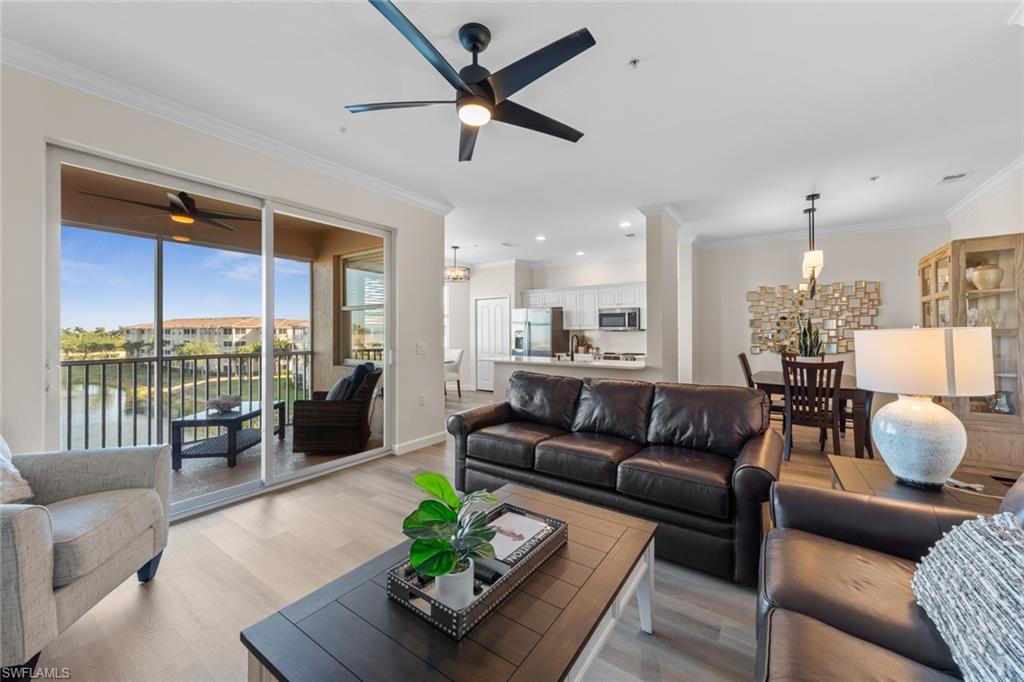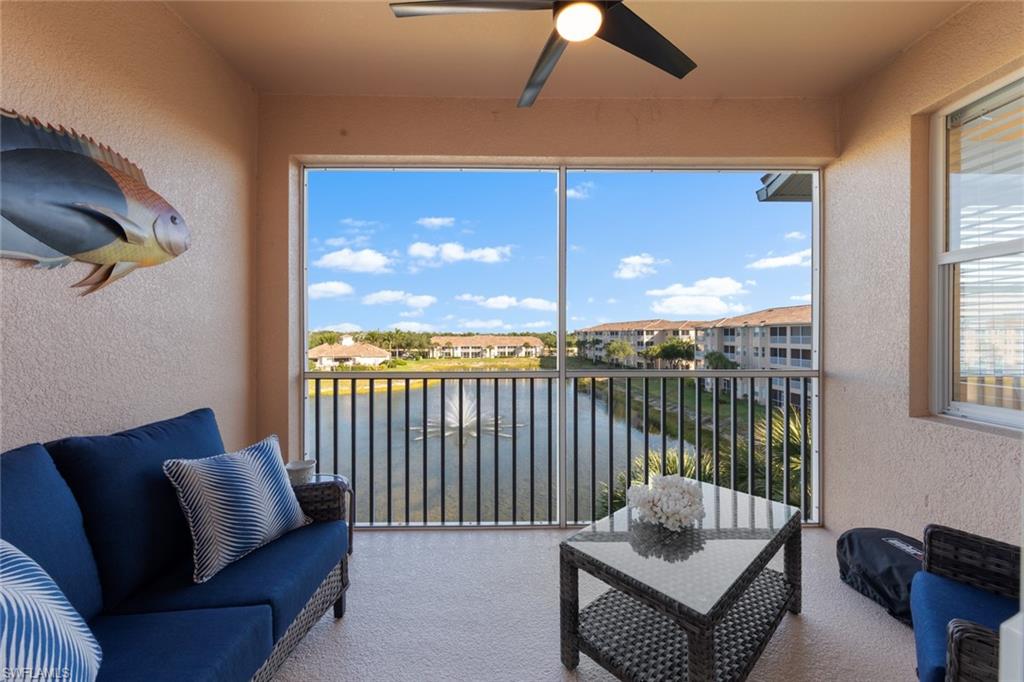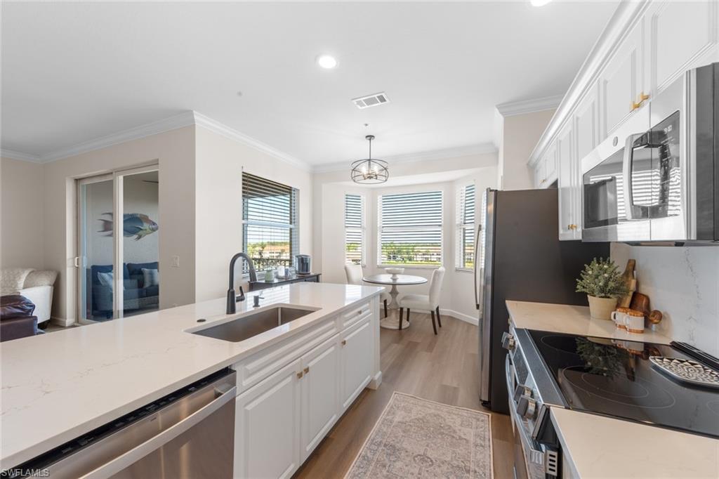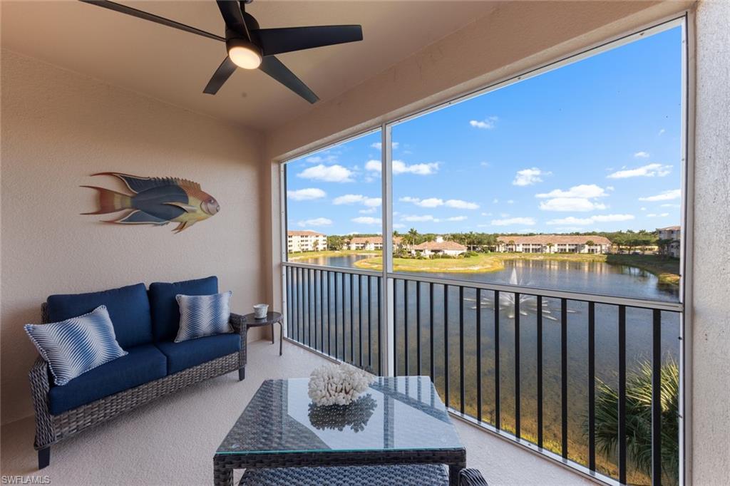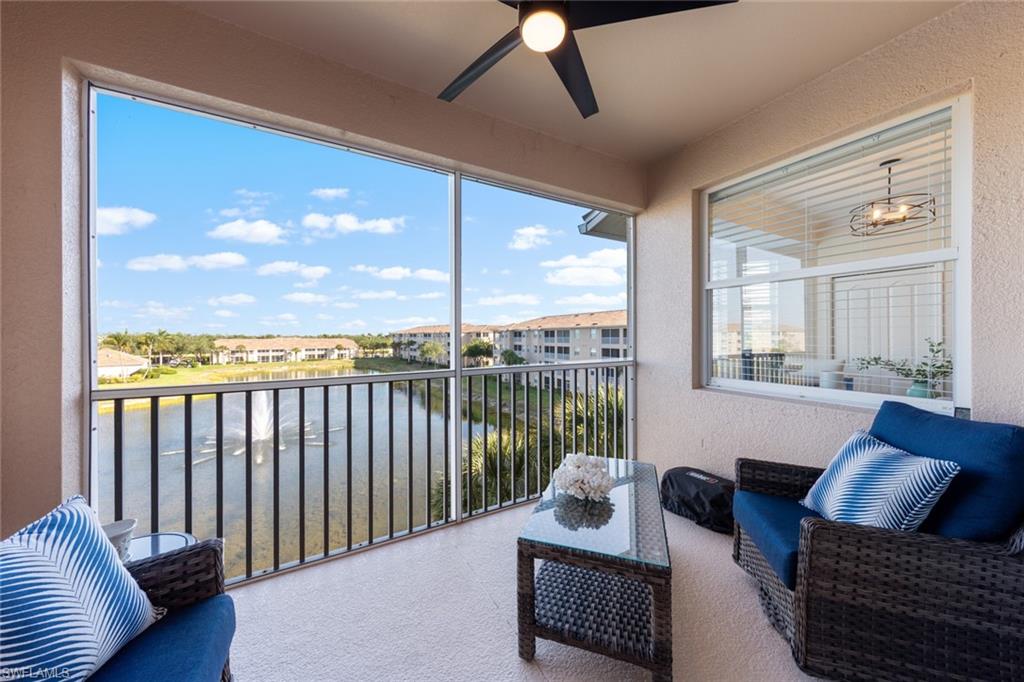 Fully remodeled and move-in ready "Brookside" floor plan, this 4th-floor lakefront residence offers stunning long lake views overlooking the clubhouse, pool, and amenities, with convenient elevator access. Renovated in October 2024 with high-end finishes throughout, this great room floor plan is perfect for entertaining. Luxury vinyl plank flooring flows seamlessly throughout the home, accented by new oversized baseboards, dimmer switches in the kitchen and dining areas, premium ceiling fans with remotes, and new LED lighting. The beautifully updated kitchen features quartz countertops with a full quartz backsplash, stainless steel appliances, and upgraded faucets and lighting. Freshly painted walls, ceilings, and trim, along with new electrical plugs, bring a crisp, modern feel. TV wall mounts with behind-the-wall wiring are installed in both the living room and primary bedroom for a clean, streamlined look. A new washer and dryer were installed in 2024, and upgraded cordless blinds provide effortless light control. The digital keypad front entry adds both security and convenience. The primary bathroom was fully remodeled with a modified walk-in shower featuring a cut-down pony wall, full-height custom wall tile, coordinating shower floor, a thick upgraded glass insert by My Shower Door, a new vanity with quartz counter, and upgraded light fixtures, mirror, and faucet. The guest bathroom was also updated with a new vanity, quartz countertop, light fixture, mirror, and faucet, offering a cohesive design throughout. Relax and take in the serene lake views from the freshly painted lanai, complete with a new remote-controlled ceiling fan. A private storage unit is conveniently located next to the elevator. New carport is being added. Community-wide repainting of buildings, stairwells, and walkways is nearly complete, enhancing the fresh, updated feel throughout Osprey Cove. Osprey Cove amenities include a clubhouse with a fitness center and billiards room, plus a large heated community pool. Ideally located close to shopping, dining, I-75, beaches, FGCU, and RSW Airport, with Coconut Point Mall, Miromar Outlets, and Gulf Coast Town Center all within 15 minutes!