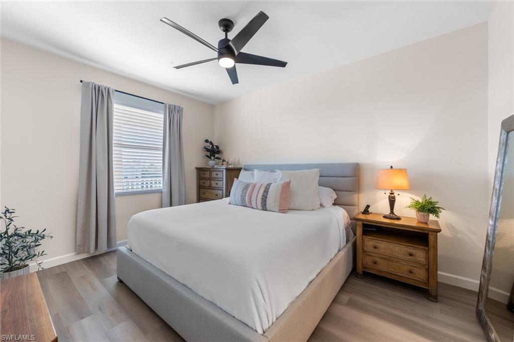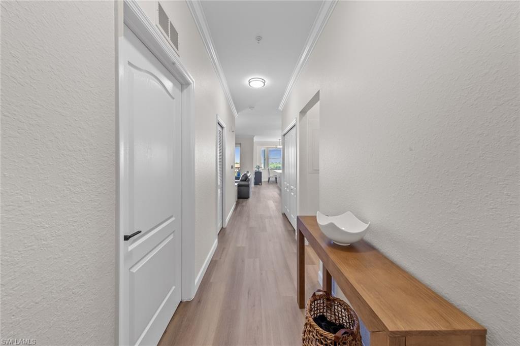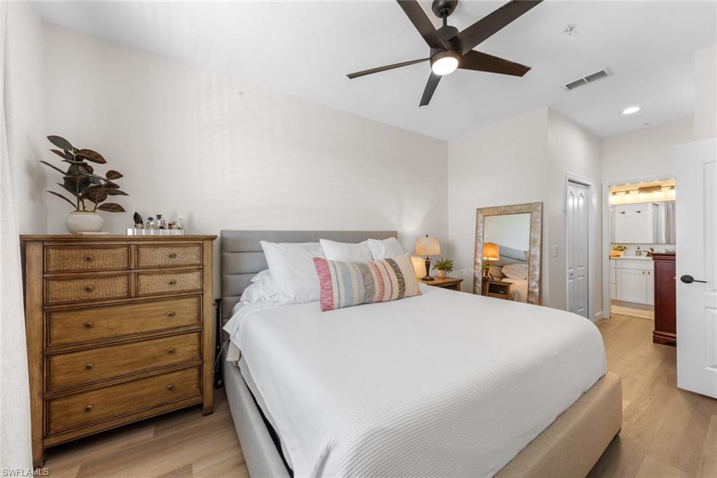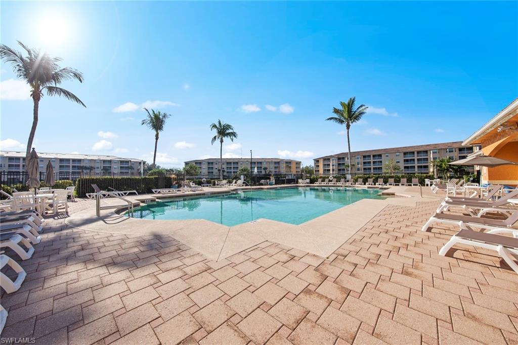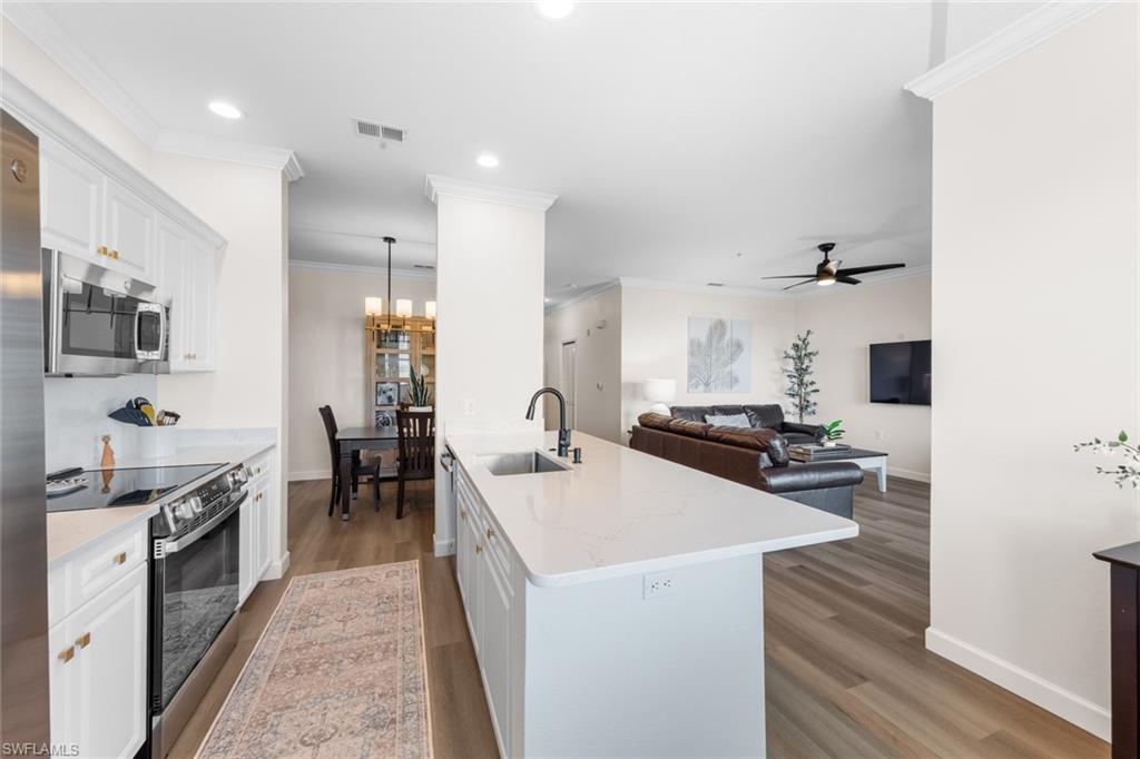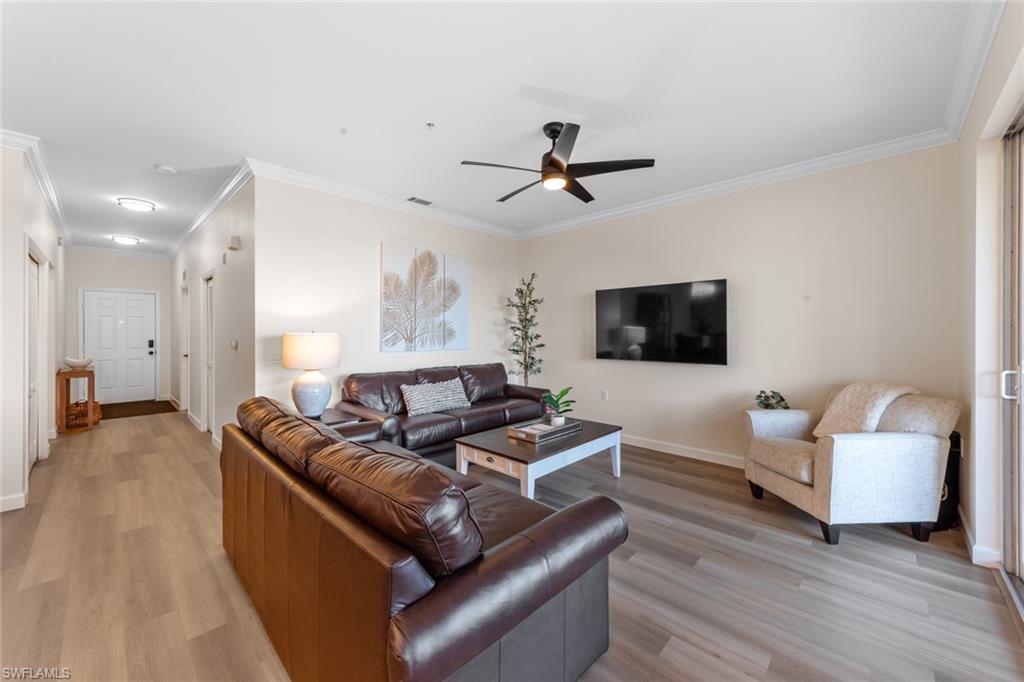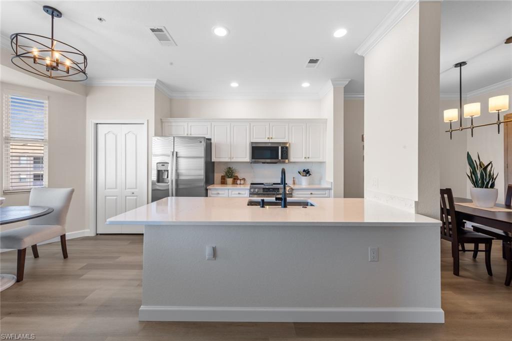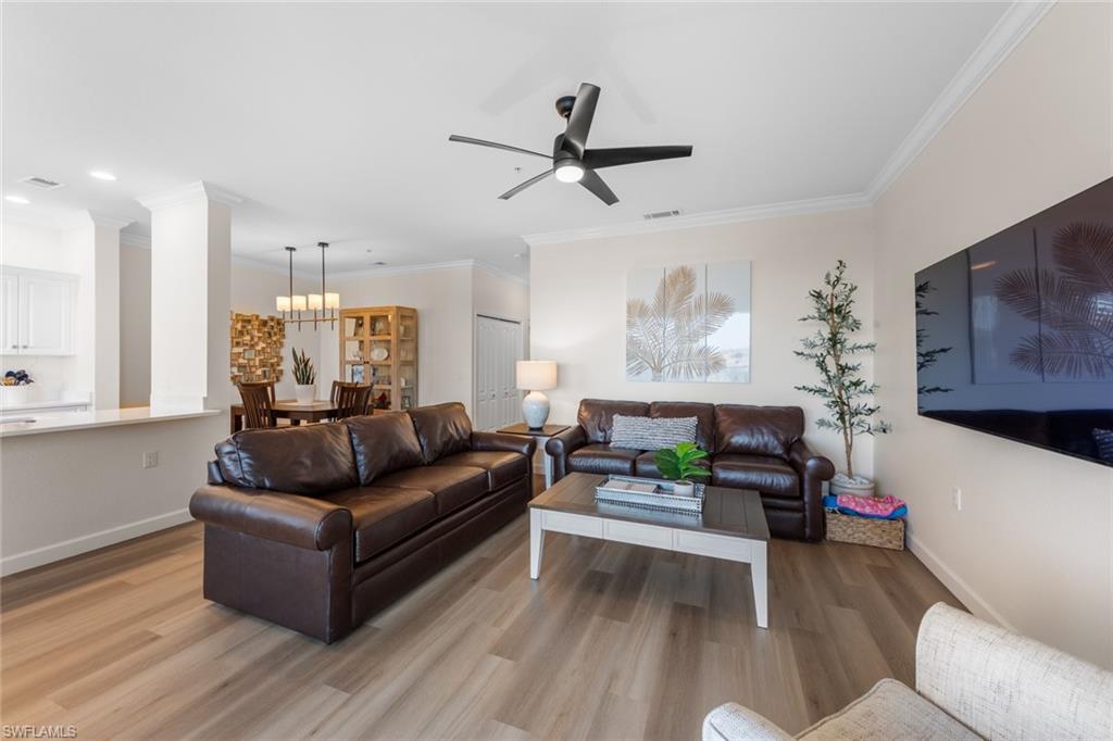 Fully remodeled and move-in ready "Brookside" floor plan, this 4th-floor lakefront residence offers stunning long lake views overlooking the clubhouse, pool, and amenities, with convenient elevator access. Renovated in October 2024 with high-end finishes throughout, this great room floor plan is perfect for entertaining. Luxury vinyl plank flooring flows seamlessly throughout the home, accented by new oversized baseboards, dimmer switches in the kitchen and dining areas, premium ceiling fans with remotes, and new LED lighting. The beautifully updated kitchen features quartz countertops with a full quartz backsplash, stainless steel appliances, and upgraded faucets and lighting. Freshly painted walls, ceilings, and trim, along with new electrical plugs, bring a crisp, modern feel. TV wall mounts with behind-the-wall wiring are installed in both the living room and primary bedroom for a clean, streamlined look. A new washer and dryer were installed in 2024, and upgraded cordless blinds provide effortless light control. The digital keypad front entry adds both security and convenience. The primary bathroom was fully remodeled with a modified walk-in shower featuring a cut-down pony wall, full-height custom wall tile, coordinating shower floor, a thick upgraded glass insert by My Shower Door, a new vanity with quartz counter, and upgraded light fixtures, mirror, and faucet. The guest bathroom was also updated with a new vanity, quartz countertop, light fixture, mirror, and faucet, offering a cohesive design throughout. Relax and take in the serene lake views from the freshly painted lanai, complete with a new remote-controlled ceiling fan. A private storage unit is conveniently located next to the elevator. New carport is being added. Community-wide repainting of buildings, stairwells, and walkways is nearly complete, enhancing the fresh, updated feel throughout Osprey Cove. Osprey Cove amenities include a clubhouse with a fitness center and billiards room, plus a large heated community pool. Ideally located close to shopping, dining, I-75, beaches, FGCU, and RSW Airport, with Coconut Point Mall, Miromar Outlets, and Gulf Coast Town Center all within 15 minutes!