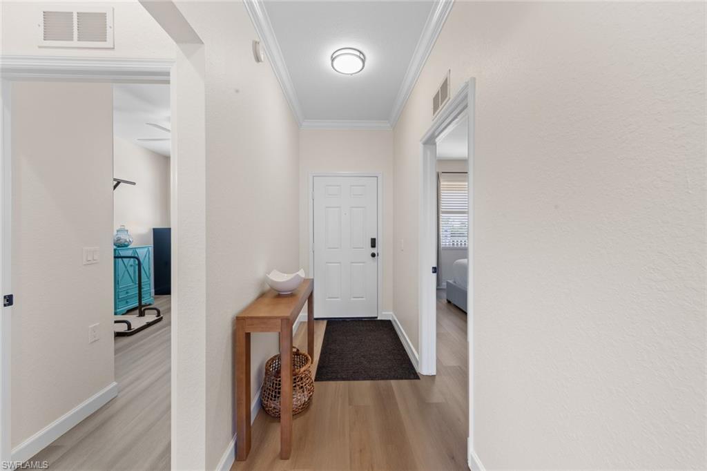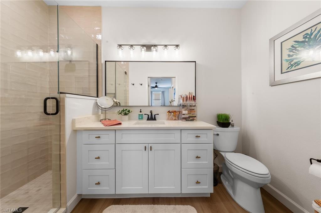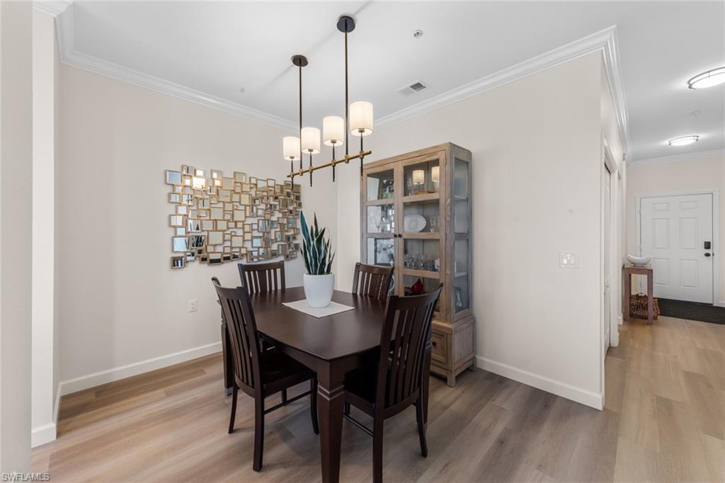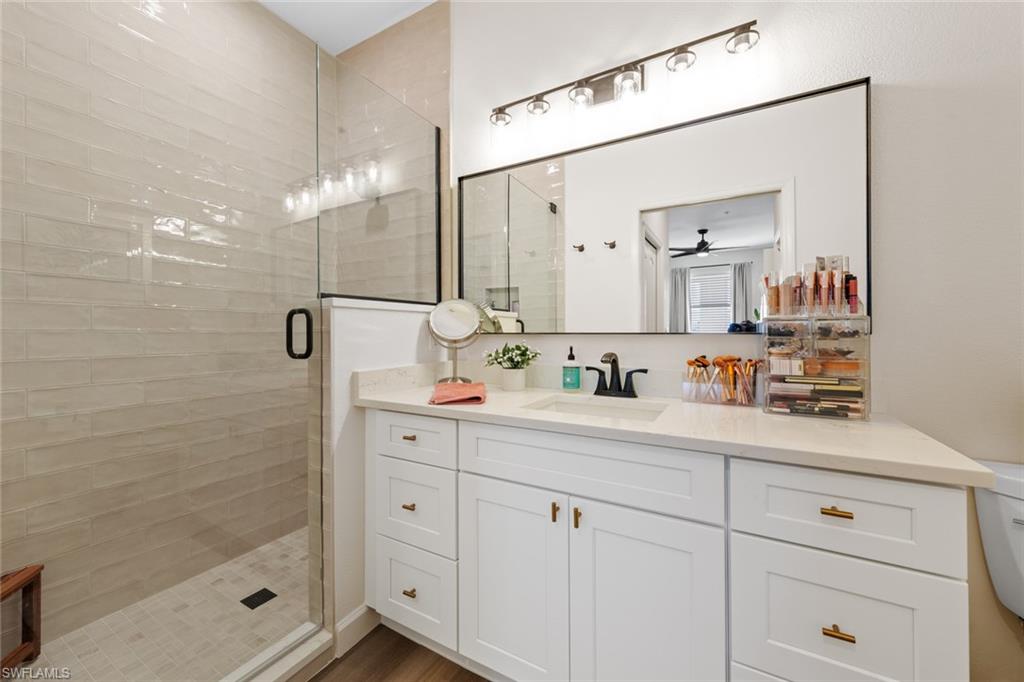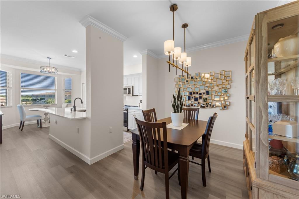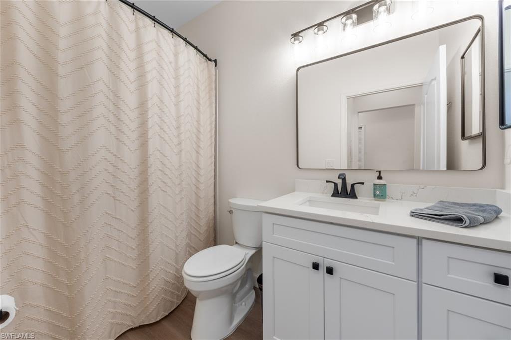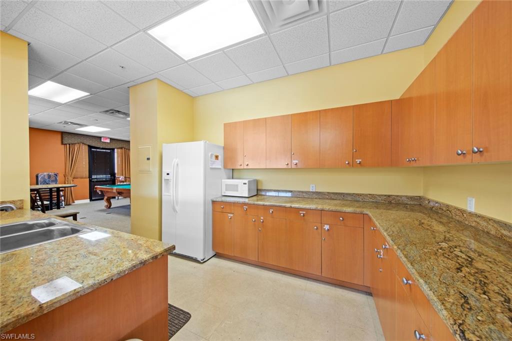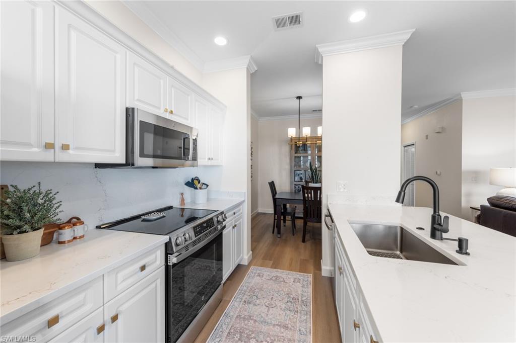 Fully remodeled and move-in ready "Brookside" floor plan, this 4th-floor lakefront residence offers stunning long lake views overlooking the clubhouse, pool, and amenities, with convenient elevator access. Renovated in October 2024 with high-end finishes throughout, this great room floor plan is perfect for entertaining. Luxury vinyl plank flooring flows seamlessly throughout the home, accented by new oversized baseboards, dimmer switches in the kitchen and dining areas, premium ceiling fans with remotes, and new LED lighting. The beautifully updated kitchen features quartz countertops with a full quartz backsplash, stainless steel appliances, and upgraded faucets and lighting. Freshly painted walls, ceilings, and trim, along with new electrical plugs, bring a crisp, modern feel. TV wall mounts with behind-the-wall wiring are installed in both the living room and primary bedroom for a clean, streamlined look. A new washer and dryer were installed in 2024, and upgraded cordless blinds provide effortless light control. The digital keypad front entry adds both security and convenience. The primary bathroom was fully remodeled with a modified walk-in shower featuring a cut-down pony wall, full-height custom wall tile, coordinating shower floor, a thick upgraded glass insert by My Shower Door, a new vanity with quartz counter, and upgraded light fixtures, mirror, and faucet. The guest bathroom was also updated with a new vanity, quartz countertop, light fixture, mirror, and faucet, offering a cohesive design throughout. Relax and take in the serene lake views from the freshly painted lanai, complete with a new remote-controlled ceiling fan. A private storage unit is conveniently located next to the elevator. New carport is being added. Community-wide repainting of buildings, stairwells, and walkways is nearly complete, enhancing the fresh, updated feel throughout Osprey Cove. Osprey Cove amenities include a clubhouse with a fitness center and billiards room, plus a large heated community pool. Ideally located close to shopping, dining, I-75, beaches, FGCU, and RSW Airport, with Coconut Point Mall, Miromar Outlets, and Gulf Coast Town Center all within 15 minutes!