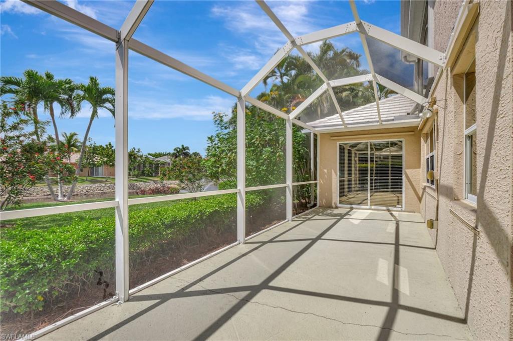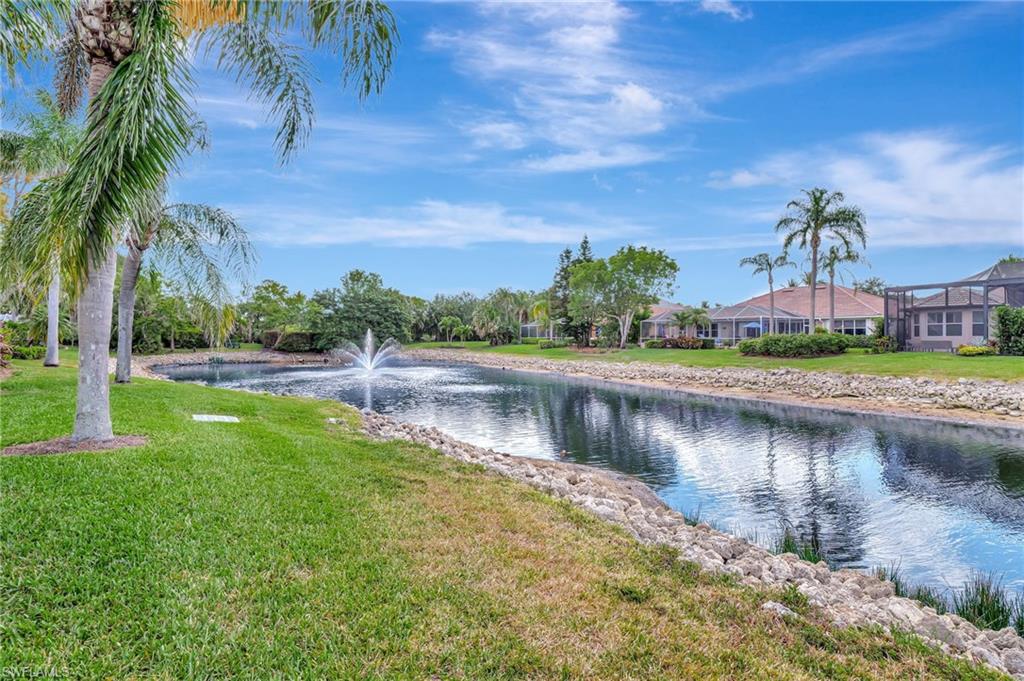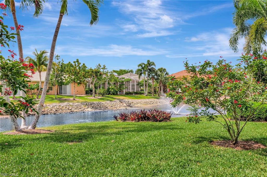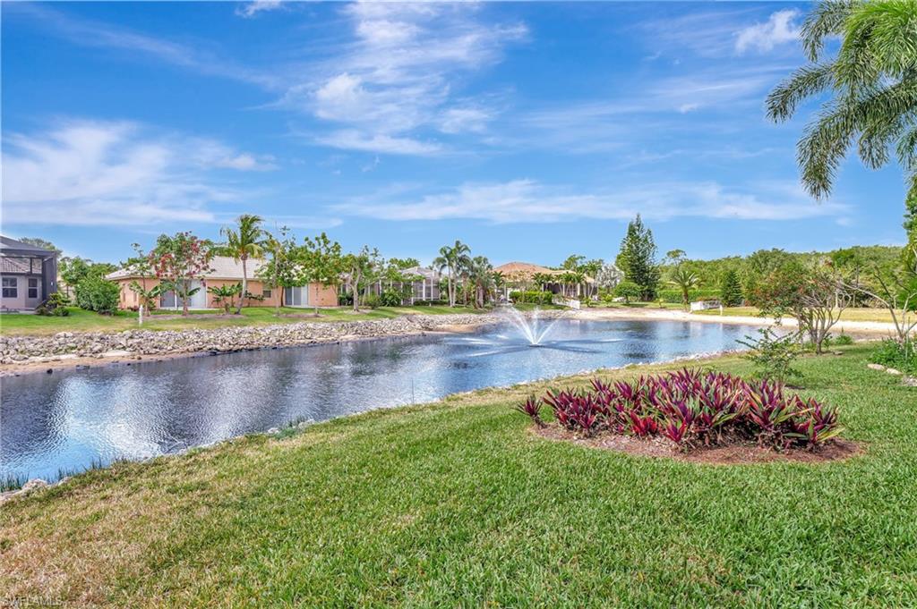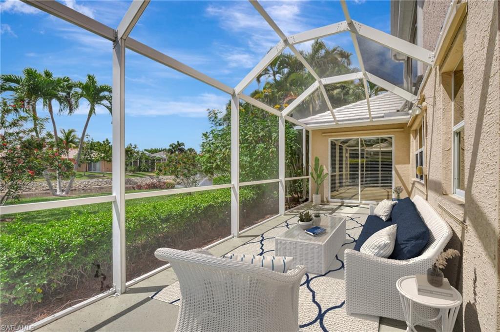 Think: Peace. As you enter the open foyer, listen to the calming fountain spray. This listing offers an amazing opportunity to purchase a lakefront, single-family home in Sterling Oaks. This very desirable sun-filled “Bougainvillea” property is rarely offered. Within a five-minute walk to 12 tennis courts and 5 pickleball courts, this lovely home boasts an open floor plan including a generous 3rd bedroom/den. Meticulously cared for; owners have updated this home with several improvements, including: master and guest bath renovations, hurricane protection, new driveway/patio pavers, roof, A/C, and water heater. Newly painted throughout, this home invites a fresh start for a vacation retreat or family home. Vaulted ceilings abound, the extra-large kitchen with island and glass front cabinets is sun-filled, and is ready for tranquil hospitality. A lovely wrap-around lanai faces the lake and could be enlarged to accommodate the pool of your dreams. This scenic, outdoor living area is private and embraced by beautifully maintained, mature plantings. This is the place for entertaining, relaxing, and enjoying the view from the privacy of your own home. Sterling Oaks is a vibrant, gated resort, tennis-optional community with state-of-the-art, lighted tennis courts, pickleball courts, bocce, a full-service Clubhouse with dining, fitness center, and a Jr. Olympic-sized pool with a cabana bar. Come see for yourself why this beautiful sanctuary is priced to sell and promises to fly off the market before you can say Namaste! Some photos in this listing have been virtually staged.