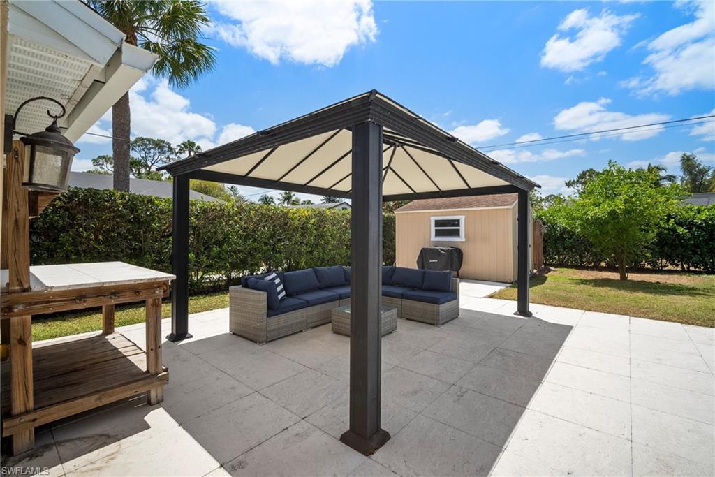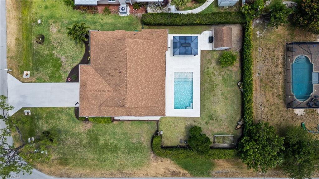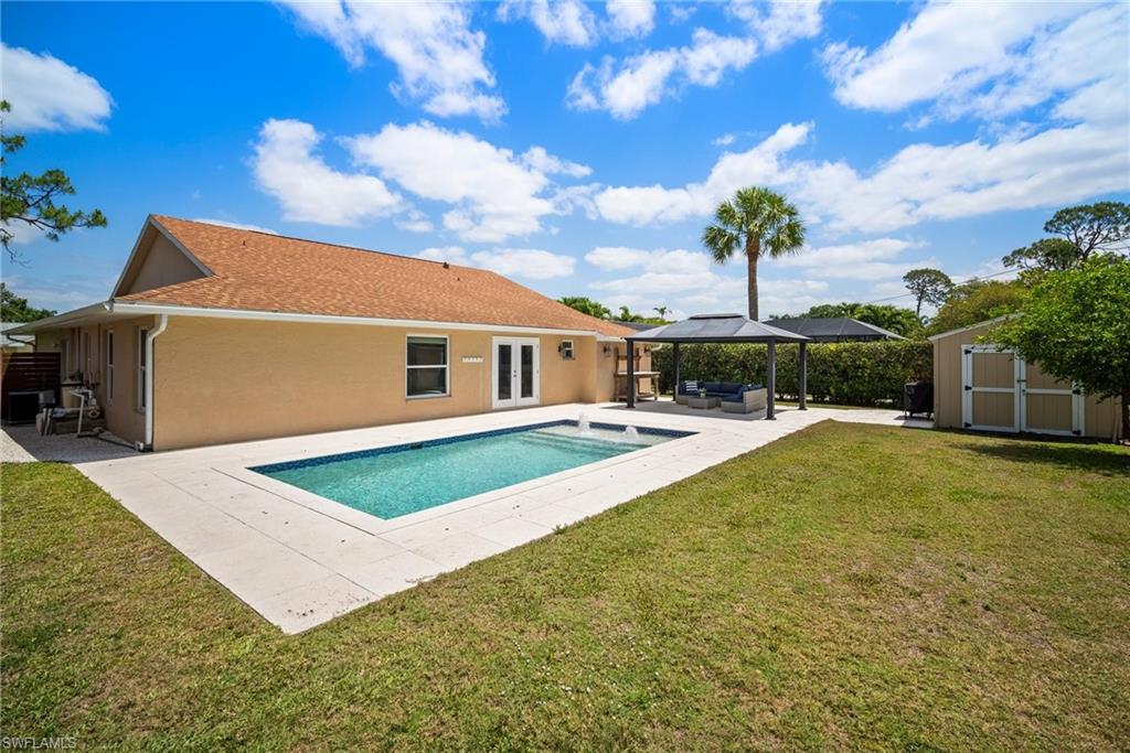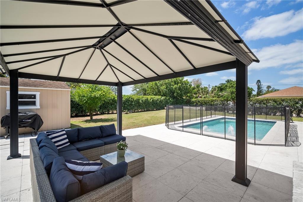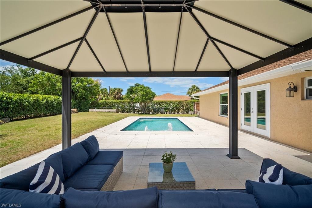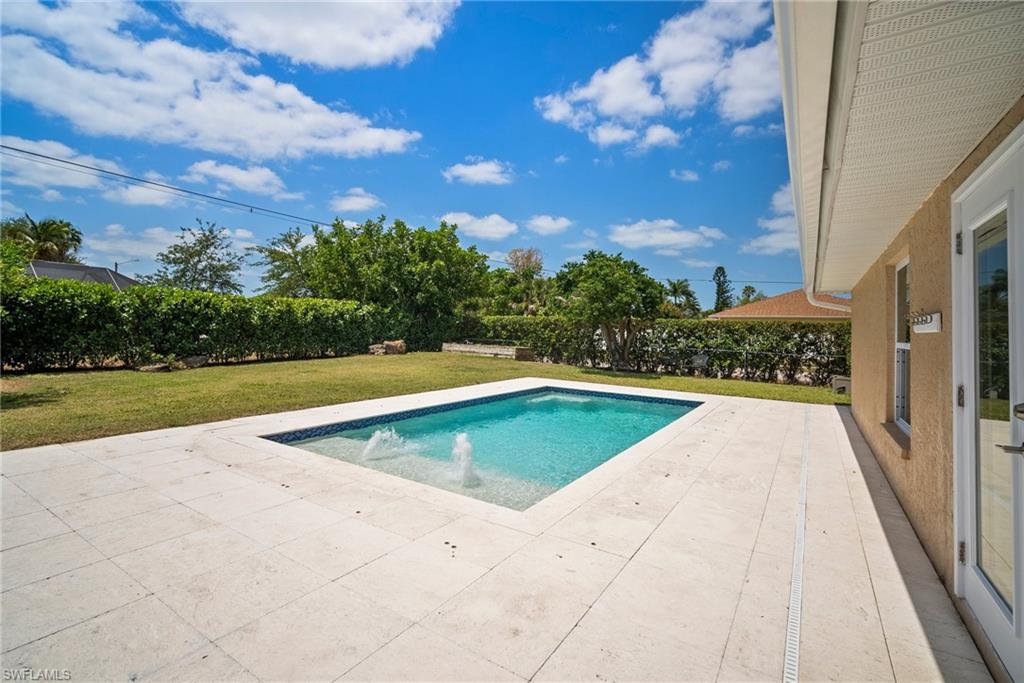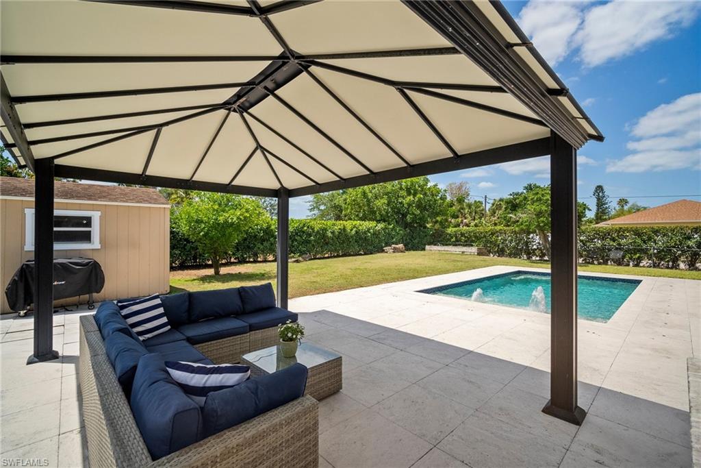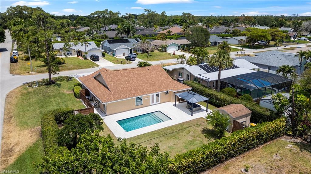 Come see this beautifully renovated 4 Bedroom, 3 full bathroom, pool home in North Naples. Located on a corner lot in Willoughby Acres. Enjoy no HOA fees and sought after A rated schools! The bedrooms are thoughtfully positioned to offer privacy for everyone! Two bedrooms and a full bath are located in one corner of the home, while another bedroom is set in a different corner next to a full bath. A pocket door can close off this area of the home to make it even more private (great for guests!). The master bedroom w/ master bath is in another corner of the home for even more seclusion. Enjoy a chef’s kitchen featuring white custom wood cabinets and stainless-steel appliances with quartz counter tops and tile backsplash while looking at your modern saltwater pool (New pump August 2024 and New Salinator 2025) w/ sun shelf surrounded by a shell stone deck. Relax under an all-weather pergola (screens included) and enjoy the privacy of your completely fenced yard. Underground conduits are installed for gas and electric for future outdoor kitchen. The generous side yard has ample space to store your boat or use for extra parking. Storage shed in back yard is great for hanging kayaks, paddle boards, and extra storage. The oversized garage includes wall to wall custom cabinets and epoxy flooring. Other upgrades include surround sound, impact windows, extra insulation in attic, New AC installed in 2022 and all new duct work installed in 2024. This house is complete and move in ready! Close to shopping, beaches, and I-75!
