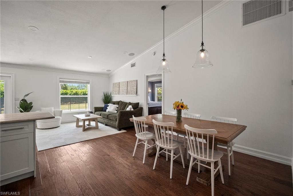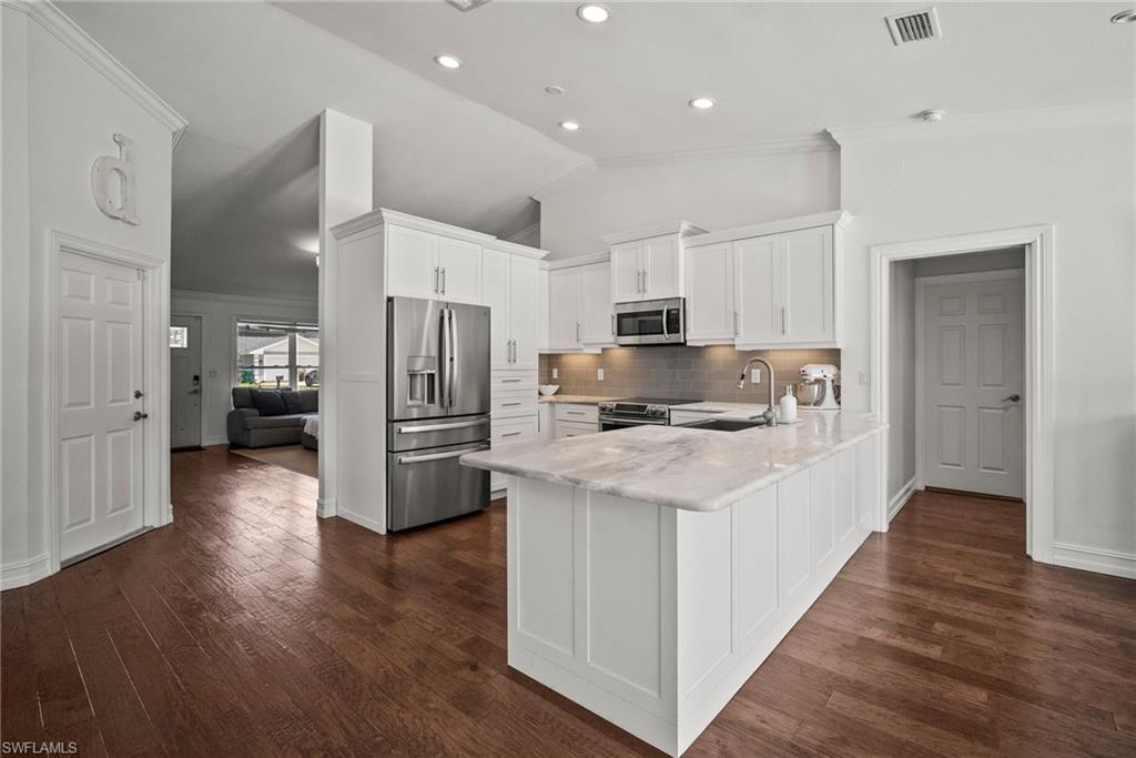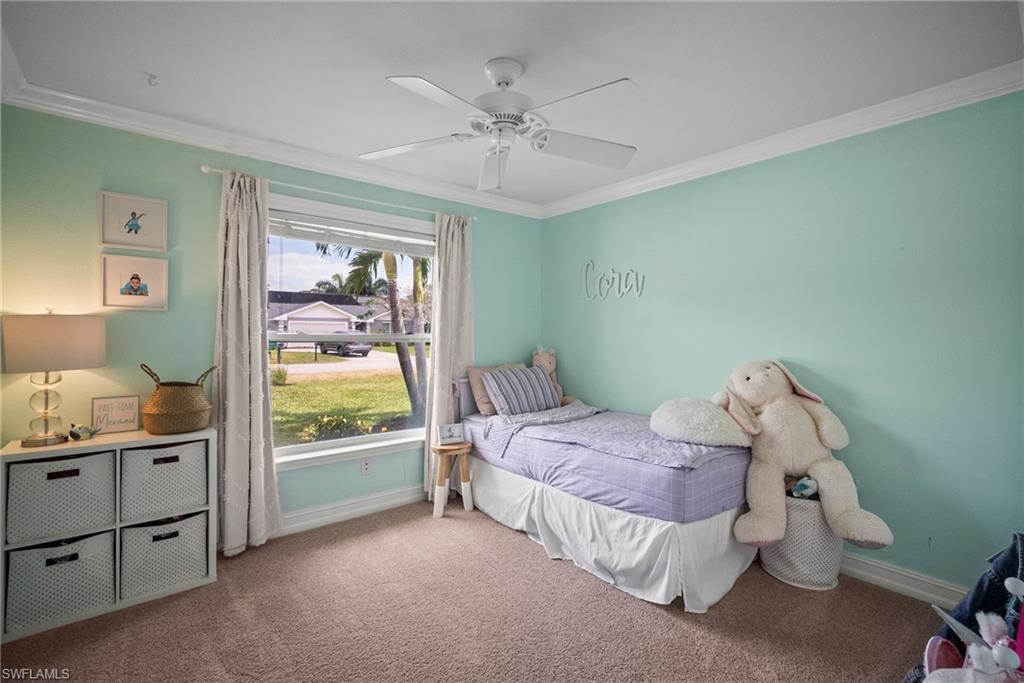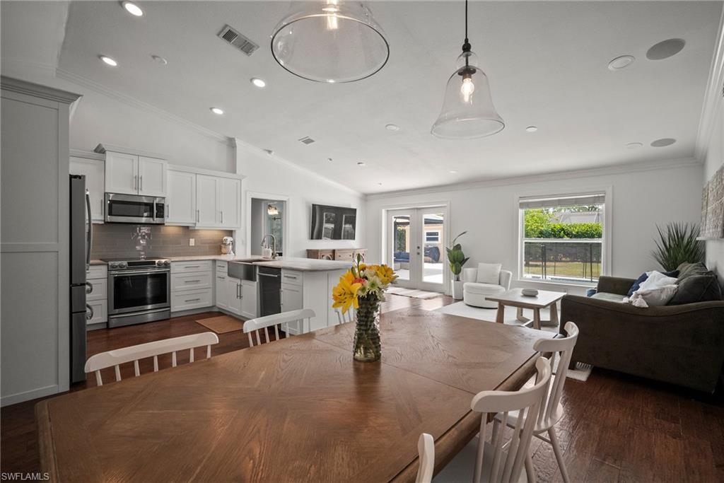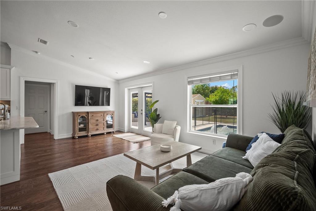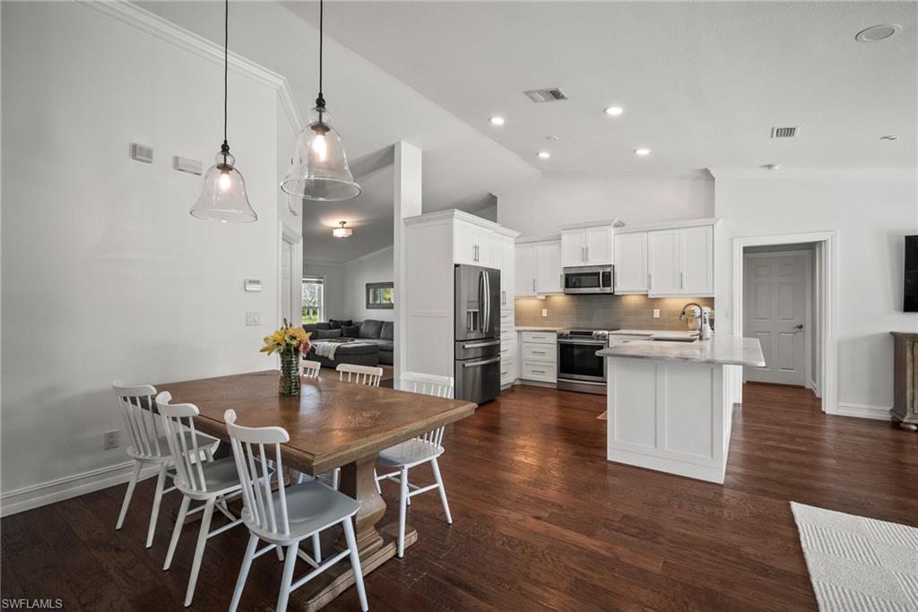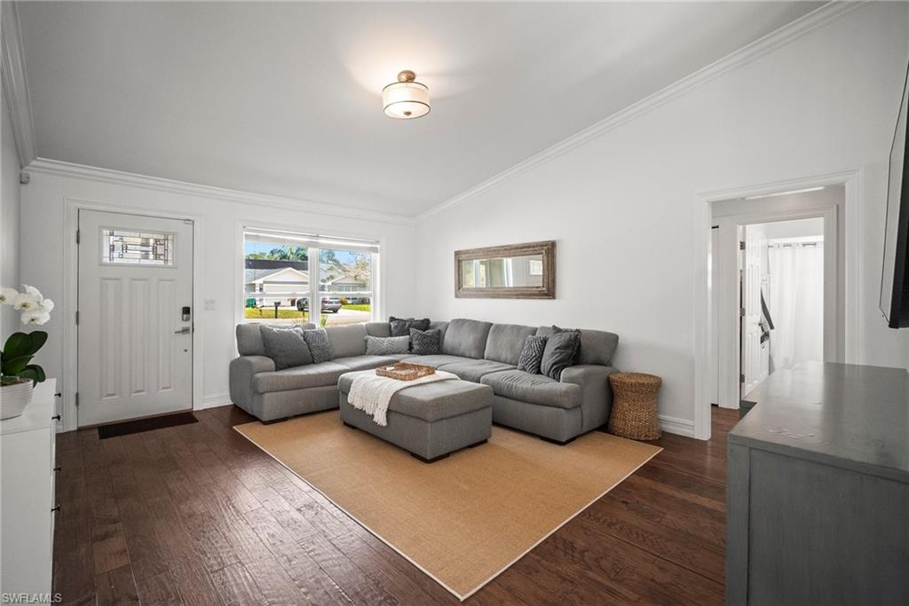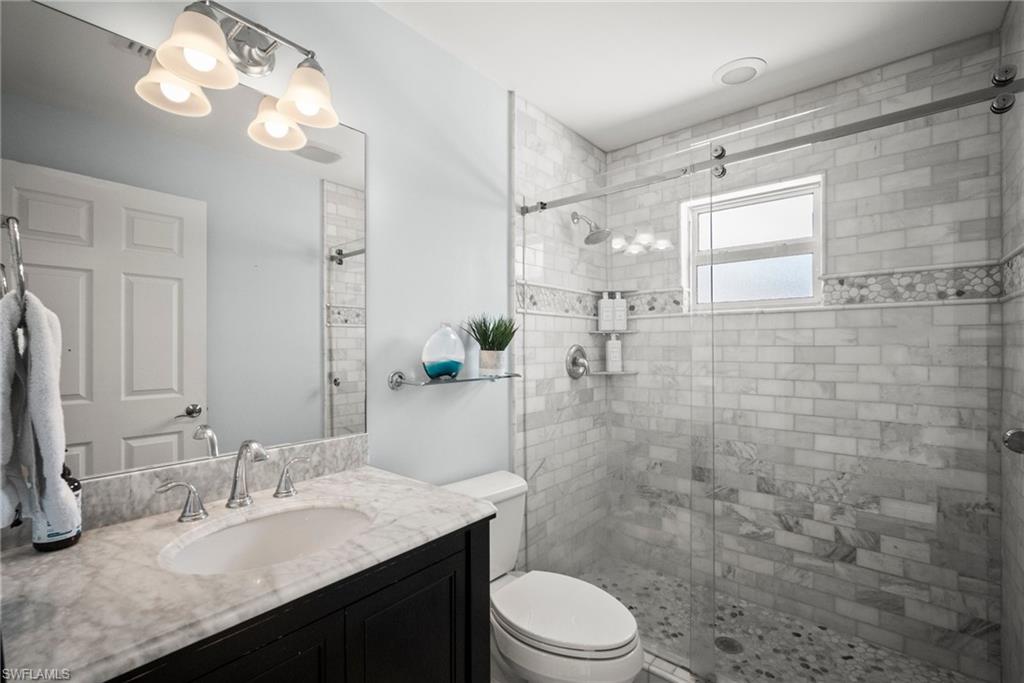 Come see this beautifully renovated 4 Bedroom, 3 full bathroom, pool home in North Naples. Located on a corner lot in Willoughby Acres. Enjoy no HOA fees and sought after A rated schools! The bedrooms are thoughtfully positioned to offer privacy for everyone! Two bedrooms and a full bath are located in one corner of the home, while another bedroom is set in a different corner next to a full bath. A pocket door can close off this area of the home to make it even more private (great for guests!). The master bedroom w/ master bath is in another corner of the home for even more seclusion. Enjoy a chef’s kitchen featuring white custom wood cabinets and stainless-steel appliances with quartz counter tops and tile backsplash while looking at your modern saltwater pool (New pump August 2024 and New Salinator 2025) w/ sun shelf surrounded by a shell stone deck. Relax under an all-weather pergola (screens included) and enjoy the privacy of your completely fenced yard. Underground conduits are installed for gas and electric for future outdoor kitchen. The generous side yard has ample space to store your boat or use for extra parking. Storage shed in back yard is great for hanging kayaks, paddle boards, and extra storage. The oversized garage includes wall to wall custom cabinets and epoxy flooring. Other upgrades include surround sound, impact windows, extra insulation in attic, New AC installed in 2022 and all new duct work installed in 2024. This house is complete and move in ready! Close to shopping, beaches, and I-75!