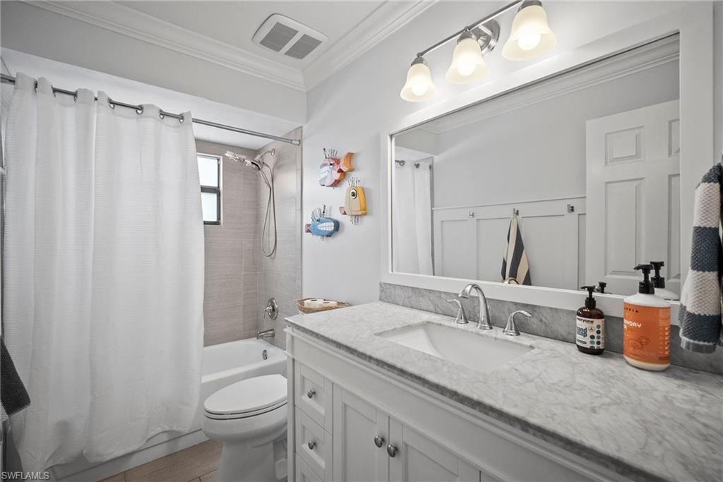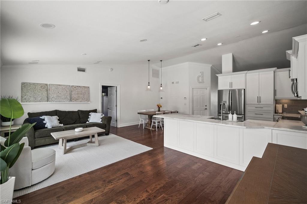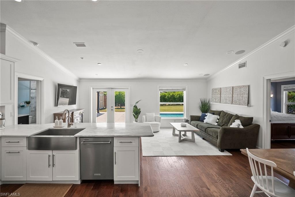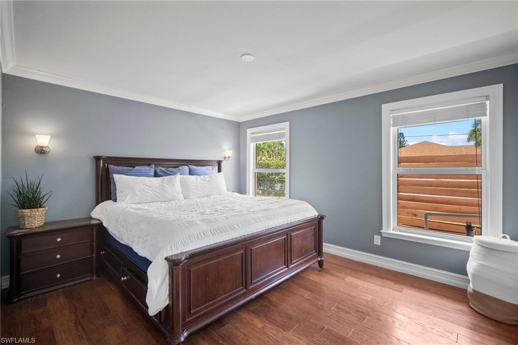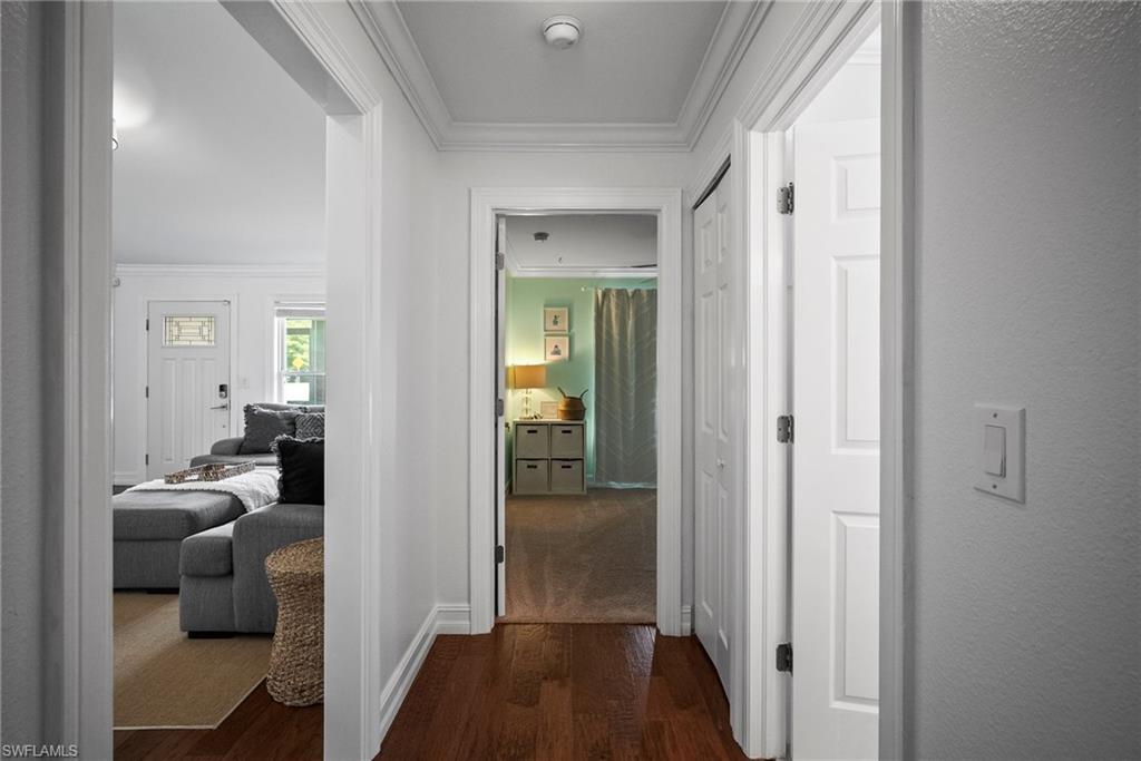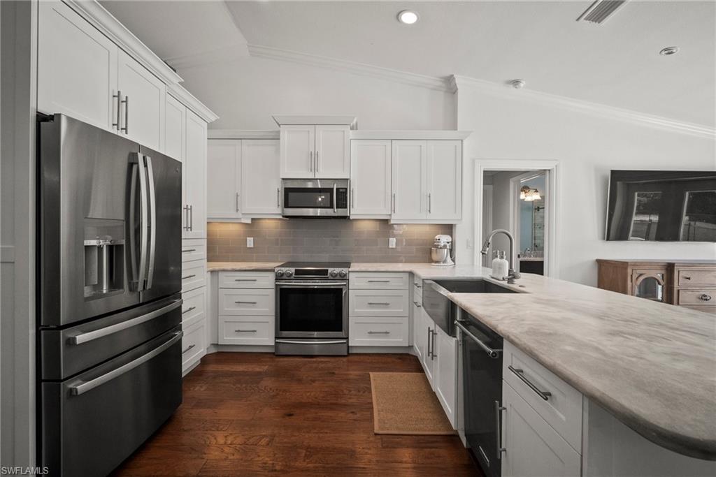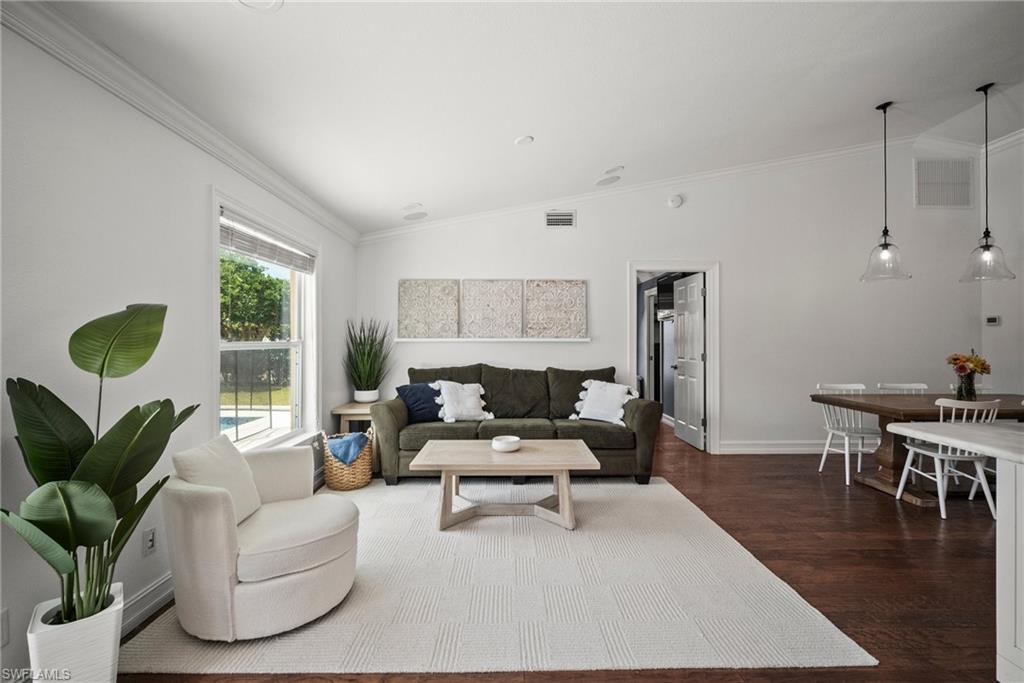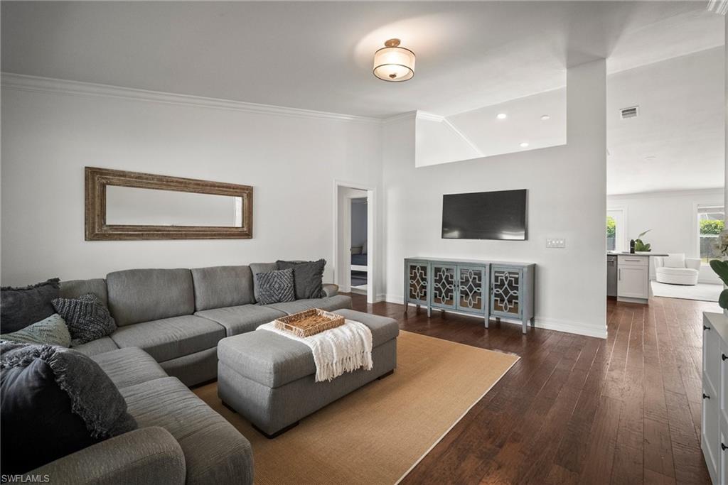 Come see this beautifully renovated 4 Bedroom, 3 full bathroom, pool home in North Naples. Located on a corner lot in Willoughby Acres. Enjoy no HOA fees and sought after A rated schools! The bedrooms are thoughtfully positioned to offer privacy for everyone! Two bedrooms and a full bath are located in one corner of the home, while another bedroom is set in a different corner next to a full bath. A pocket door can close off this area of the home to make it even more private (great for guests!). The master bedroom w/ master bath is in another corner of the home for even more seclusion. Enjoy a chef’s kitchen featuring white custom wood cabinets and stainless-steel appliances with quartz counter tops and tile backsplash while looking at your modern saltwater pool (New pump August 2024 and New Salinator 2025) w/ sun shelf surrounded by a shell stone deck. Relax under an all-weather pergola (screens included) and enjoy the privacy of your completely fenced yard. Underground conduits are installed for gas and electric for future outdoor kitchen. The generous side yard has ample space to store your boat or use for extra parking. Storage shed in back yard is great for hanging kayaks, paddle boards, and extra storage. The oversized garage includes wall to wall custom cabinets and epoxy flooring. Other upgrades include surround sound, impact windows, extra insulation in attic, New AC installed in 2022 and all new duct work installed in 2024. This house is complete and move in ready! Close to shopping, beaches, and I-75!