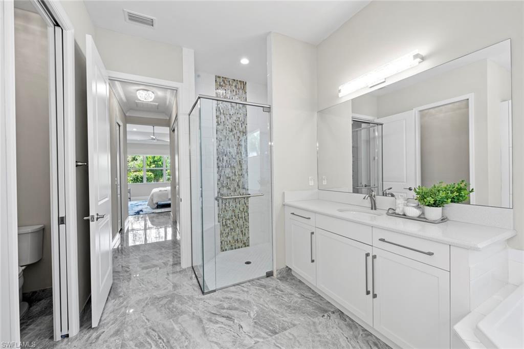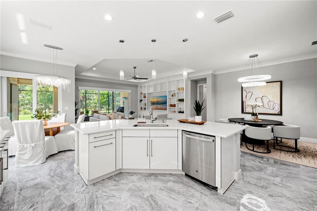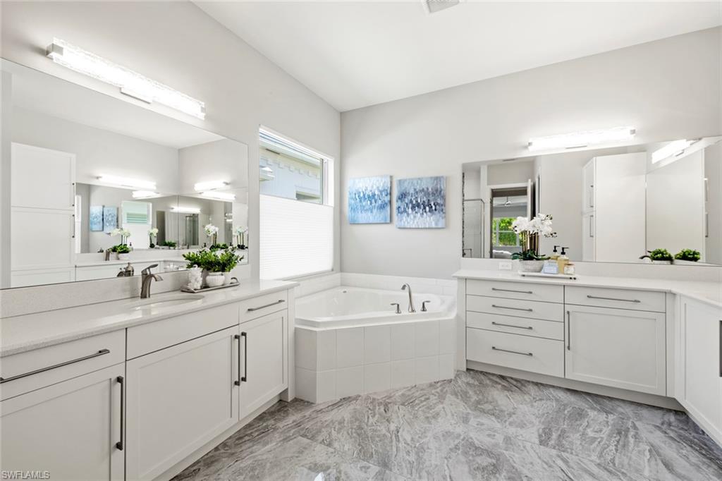 Welcome to 16521 Calistoga Dr, a stunning residence located in the prestigious 55+ gated community of Valencia Bonita. This highly sought-after Chandon floorplan offers just under 2,500 square feet of beautifully designed living space, with 4 bedrooms and 3 full bathrooms crafted for elegance, comfort, and functionality. From the moment you enter, you’re greeted by a light-filled open layout adorned with expansive 24"x24" porcelain tile flooring, exuding both sophistication and ease of maintenance. The gourmet kitchen is a chef’s dream, featuring quartz countertops, upgraded cabinetry with custom roll-out shelves, a natural gas cooktop, stainless steel appliances, and a large walk-in pantry. Whether entertaining or enjoying a quiet evening, the open flow to multiple dining and living spaces creating the perfect setting. The spacious living area showcases a custom built-in entertainment center, adding both functionality and flair. Just off the main living space, the fourth bedroom, currently configured as a versatile den, also features tailored built-in cabinetry, making it ideal for a home office, creative studio, or guest suite. Next, retreat to the expansive primary suite, a true sanctuary overlooking the peaceful preserve. This luxurious space offers room for a private sitting area and features two custom walk-in closets for optimal organization. The spa-inspired en suite bathroom includes a deep soaking tub, a beautifully tiled walk-in shower, and dual vanities, creating the perfect blend of comfort and elegance. The second bedroom is thoughtfully designed with its own private en suite bathroom, providing ideal accommodations for guests or extended family. Additional features include UV antimicrobial lights installed in all ductwork, enhancing indoor air quality, and an epoxy-coated garage floor, adding durability and a sleek, finished look to the two-car garage, impact resistant doors and windows, WHOLE HOUSE GENERTATOR and a beautiful laundry room with all of the cabinetry and storage space you could ever desire. Step outside to take in the tranquil beauty of your private backyard, backing up to a lush natural preserve that offers peace, privacy, and daily wildlife sightings — all without the distraction of rear neighbors. All of this is located within Valencia Bonita, a vibrant 55+ community offering unmatched amenities including a spectacular clubhouse, resort-style pools, state-of-the-art fitness center, pickleball and tennis courts, walking trails, full-service salon, restaurant and outdoor bar, and an active calendar of social events and clubs. Don’t miss your chance to own this impeccably upgraded, move-in-ready home with one of the best views in the community. Schedule your private tour today and experience the best of Southwest Florida living!
