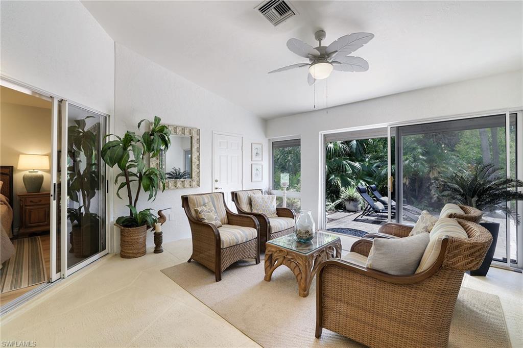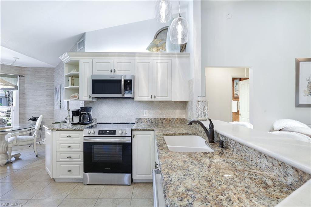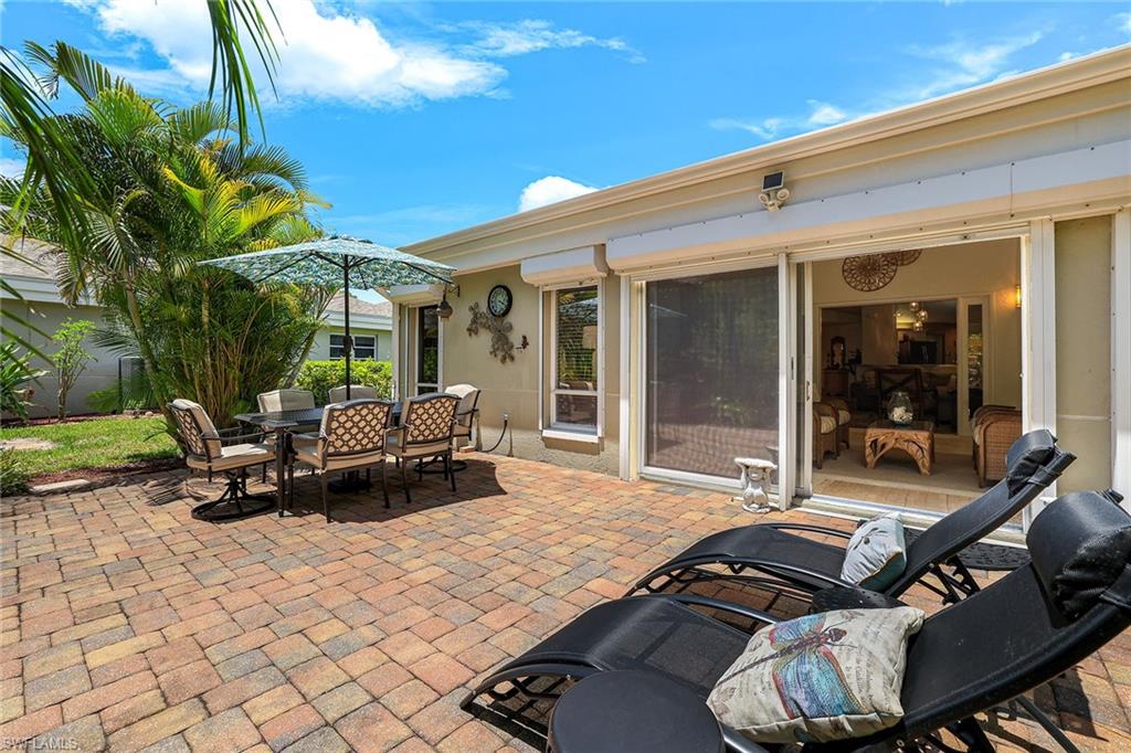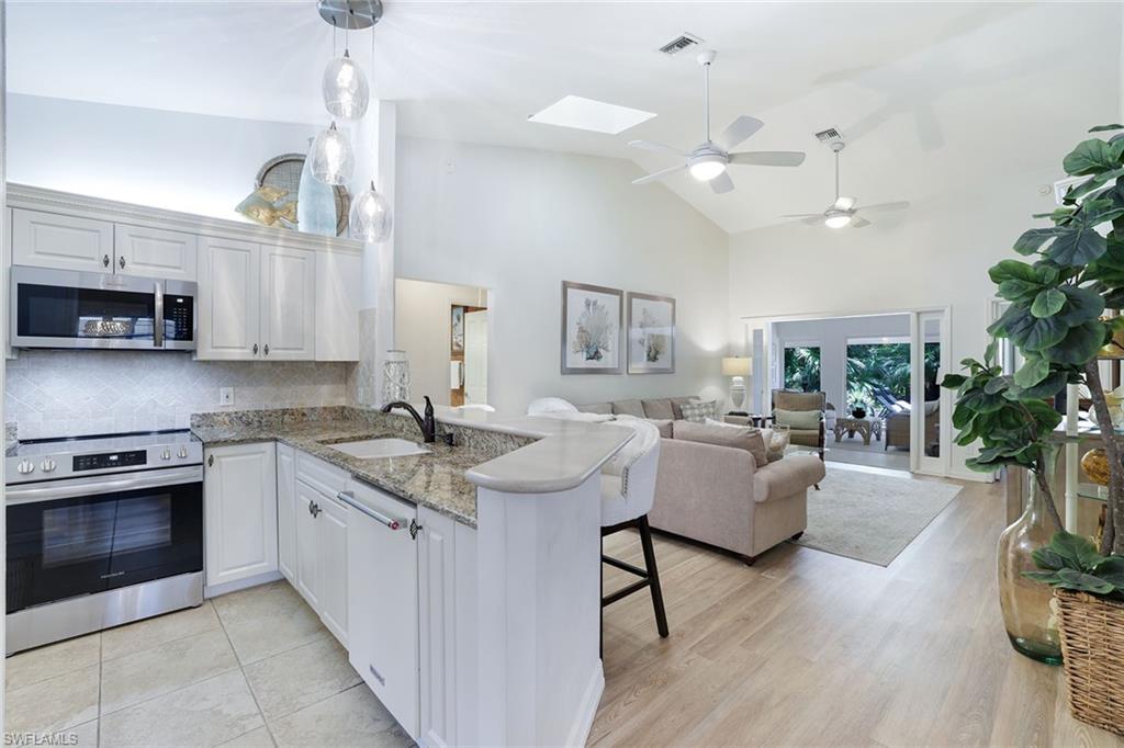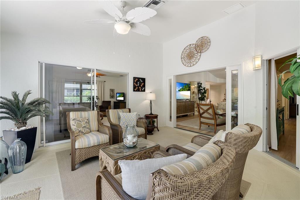 Discover a blend of privacy, comfort and convenience in this move-in-ready, turnkey three-bedroom, two-bath attached villa. Offering privacy of a single-family home with the maintenance-free lifestyle of a condominium, this 1,760-square-foot residence features an updated kitchen with granite countertops, newer appliances, a cozy breakfast nook, custom lighting, plantation shutters and tile and laminate flooring throughout. Enjoy year-round comfort and versatility in the fully air-conditioned Florida room, featuring an enclosed pantry with a convenient sink, ideally next to a spacious, paved outdoor area, ideal for entertaining guests in a peaceful and private setting. A recently replaced roof (2023) and rolldown hurricane shutters provide added security and peace of mind during storm season. This home is in the desirable Fountain Lakes community, directly across from Coconut Point Mall and just minutes from Southwest Florida's stunning beaches, dining, entertainment and airport. Residents enjoy an impressive array of amenities, including unlimited golf, a community pool, tennis courts, shuffleboard, bocce ball, billiards, pickleball, a fitness center, a community center with a library and an active social calendar. Whether you're seeking relaxation or recreation, this home offers it all. Don't miss the opportunity to make this home your next Florida dream!