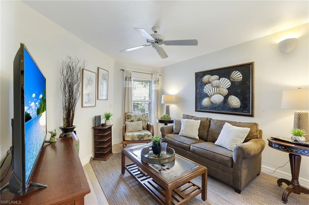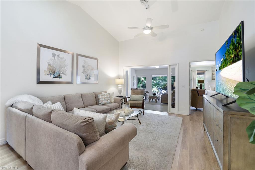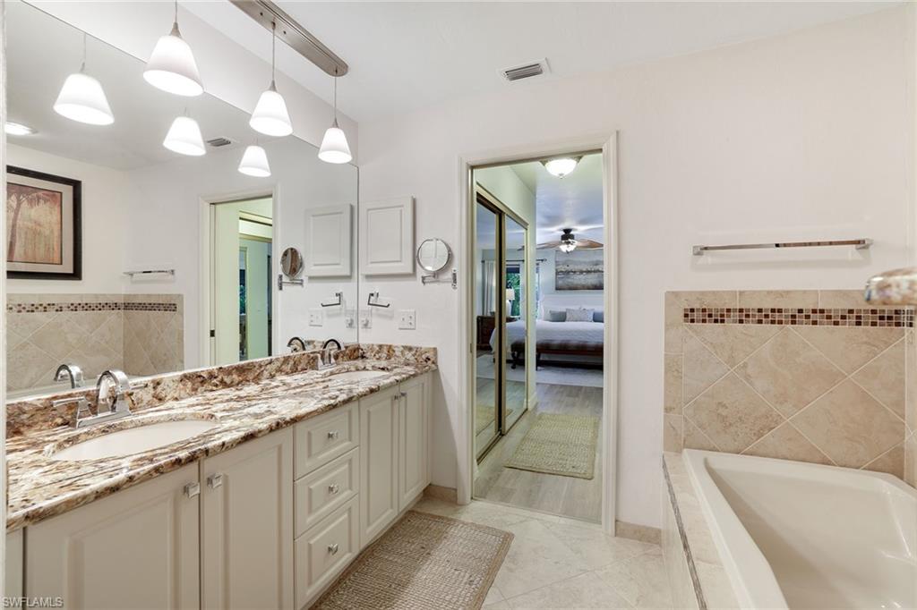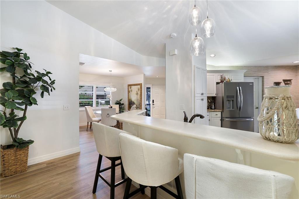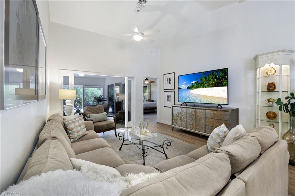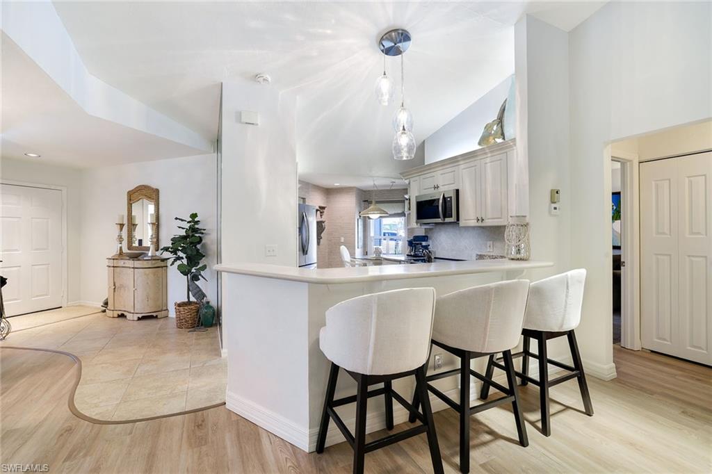 Discover a blend of privacy, comfort and convenience in this move-in-ready, turnkey three-bedroom, two-bath attached villa. Offering privacy of a single-family home with the maintenance-free lifestyle of a condominium, this 1,760-square-foot residence features an updated kitchen with granite countertops, newer appliances, a cozy breakfast nook, custom lighting, plantation shutters and tile and laminate flooring throughout. Enjoy year-round comfort and versatility in the fully air-conditioned Florida room, featuring an enclosed pantry with a convenient sink, ideally next to a spacious, paved outdoor area, ideal for entertaining guests in a peaceful and private setting. A recently replaced roof (2023) and rolldown hurricane shutters provide added security and peace of mind during storm season. This home is in the desirable Fountain Lakes community, directly across from Coconut Point Mall and just minutes from Southwest Florida's stunning beaches, dining, entertainment and airport. Residents enjoy an impressive array of amenities, including unlimited golf, a community pool, tennis courts, shuffleboard, bocce ball, billiards, pickleball, a fitness center, a community center with a library and an active social calendar. Whether you're seeking relaxation or recreation, this home offers it all. Don't miss the opportunity to make this home your next Florida dream!
