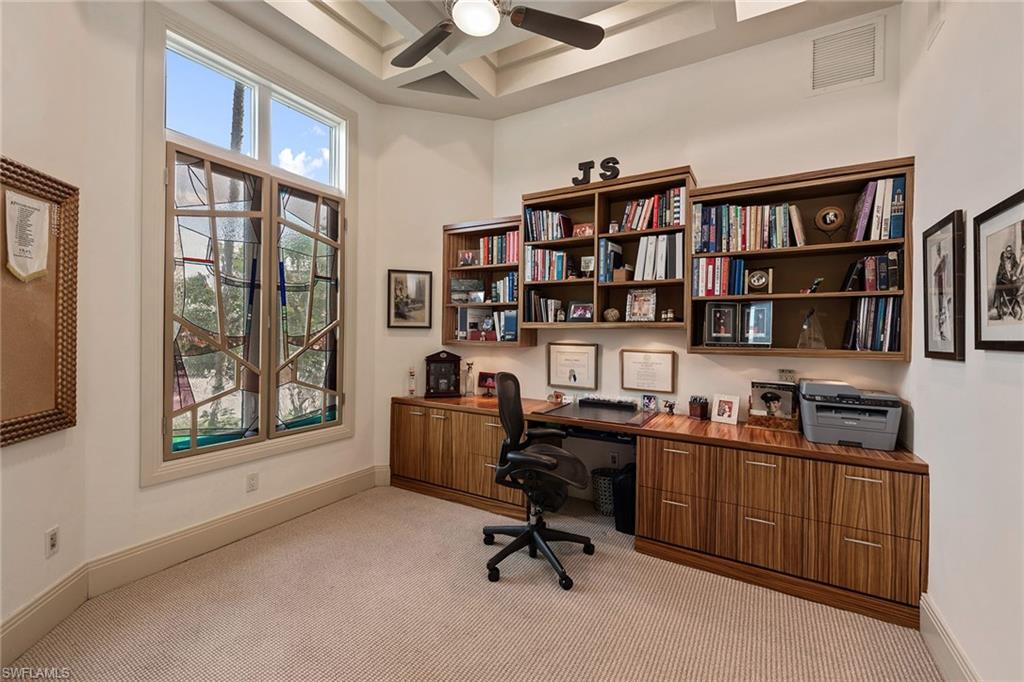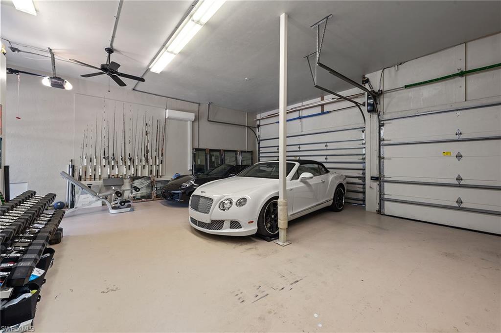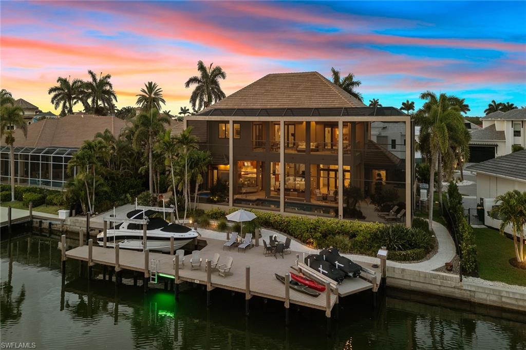 In the extremely popular River area of Marco Island, renowned for its quick, direct Gulf access via the Marco River, this stunning four-bedroom plus den, 4.5-bath custom-built residence offers over 5,100 square feet of refined living space and is a showcase of luxury and elegant coastal design. With western-facing bay views, enjoy breathtaking sunsets and expansive water vistas from nearly every room. Upon entry, you’re welcomed by a dramatic custom glass-inset stainless steel front door that opens to a grand foyer and expansive great room, complete with a gas fireplace wrapped in stone, custom built-in cabinetry, porcelain floors, backlit tray ceiling and a multi-zone audio Sonos surround sound system. The chef-inspired gourmet kitchen features quartzite countertops and backsplash, top-tier appliances including a Viking six-burner gas cooktop with pot filler and a Sub-Zero refrigerator/freezer. A large island, Viking hood, under-cabinet lighting and a dedicated coffee bar complete the space. Adjacent are the breakfast nook and formal dining area. The den offers a refined setting, with coffered ceilings, recessed lighting, built-in desk and integrated speakers. The luxurious primary suite offers French doors to the lanai, backlit tray ceiling, transom windows and integrated ceiling speakers. The spa-like primary bath includes a jetted Kohler tub overlooking the garden, quartz vanities, an oversized walk-in shower with rain and body sprayers, a private water closet with bidet and a spacious custom closet with center island. All guest bedrooms feature en-suite baths, balcony access, tray ceilings, recessed lighting and Kohler walk-in showers. Upstairs, a wet bar with beverage refrigerator and microwave adds convenience, while a recreation room above the garage brings fun with a pool table, shuffleboard, poker table, entertainment center, built-in speakers, and its stackable washer and dryer. Outdoor living is elevated with a heated pool and spa showcasing a tile waterfall, sunken bar with beverage refrigerator and stainless cabinetry, outdoor shower and LED lighting. The spacious lanai features roll-down hurricane shutters and matching paver decking that extends to the dock. Boating enthusiasts will love the 7,500-pound boat lift, 12,000-pound PWC lift platform, wide bay views, and dock space with a fish-cleaning station and water access for kayaks and paddleboards. This home is equipped with smart home technology, a full-house generator and a 1,000-gallon propane tank. Additional features include a built-in dehumidifier system for optimal indoor air quality. The home was quality-built by Slocum-Christian, known for its craftsmanship. A four-car garage with workshop, mini-split air conditioner, storage loft, ceiling fans and room for all your needs of this meticulously crafted residence. Experience premier island living!