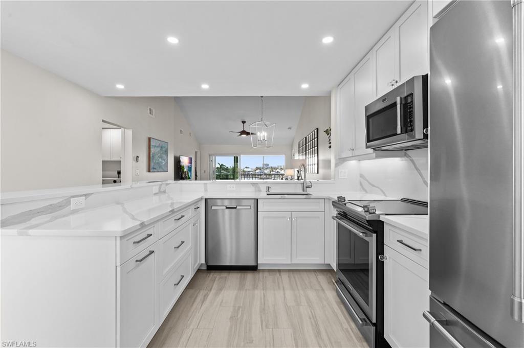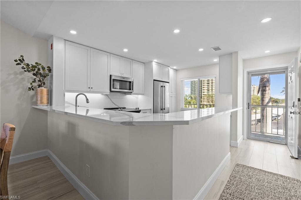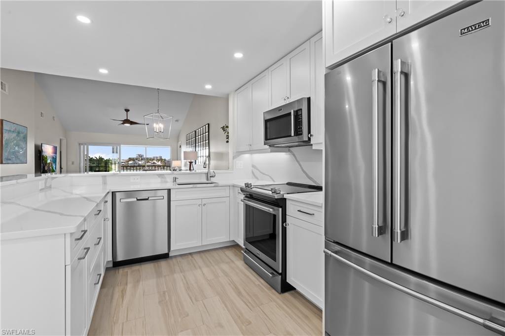 Experience coastal living at its finest in this beautifully remodeled 3-bedroom, 2-bath bayfront condo, within the gated community of Monte Carlo Club. Just steps from the sugar sand beaches of Vanderbilt Beach, every inch of this stunning residence has been thoughtfully upgraded. This serene condo features: tile flooring throughout, vaulted ceilings, spacious bedrooms with detailed window treatments, remodeled bathrooms, and a completely renovated kitchen with 42-inch cabinets and brand-new stainless steel Maytag appliances. Enjoy peace of mind and the comforts of worry-free living with Storm Smart impact windows, impact sliding doors, and impact/storm front door, new LG Washer and Dryer, plus a new AC and Water Heater. Your future beach home boasts an open concept living area that allows natural light to flow through generously, displaying the sparkling view of Vanderbilt Bay from every room. Tranquility and convenience meet with designer lighting in every room, custom closets in the primary bedroom and a spacious laundry room that offers abundant built in storage for all your beach supplies! When the Gulf isn't calling, you can unwind at the Monte Carlo pool or break a sweat at the pickleball and tennis courts! Whether you're catching the sunset from within the Monte Carlo gates or taking the 3-minute walk to The Turtle Club or La Playa, this location provides Naples finest, at your fingertips. Don't wait, schedule your private showing for this Naples Oasis today!