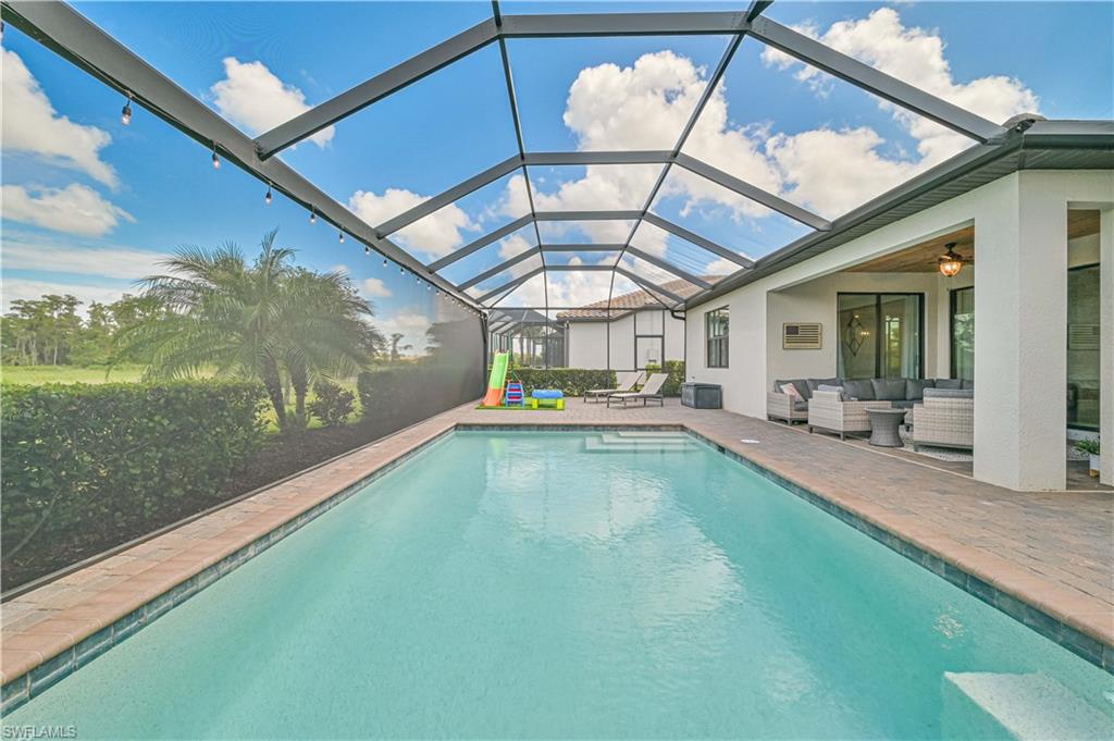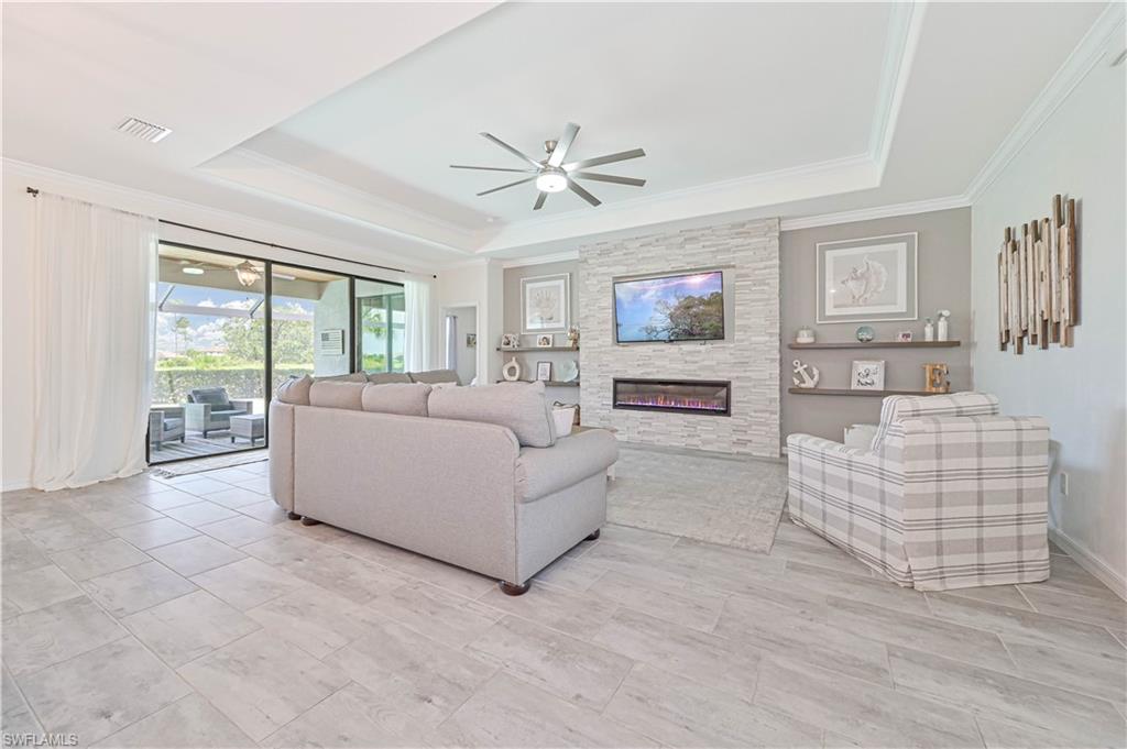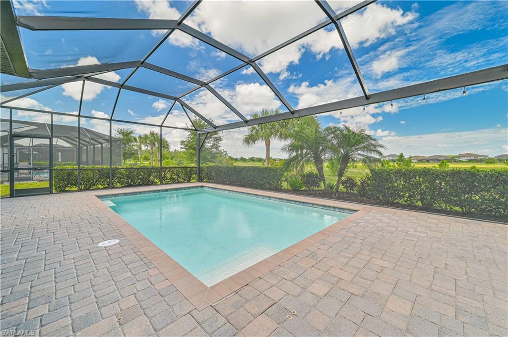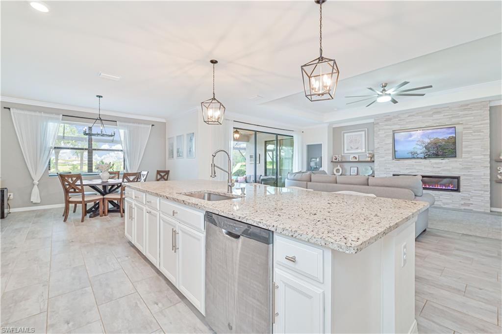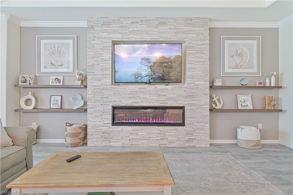 Experience luxury living at its finest in this stunning home located in The Place at Corkscrew, an exclusive resort-style community! Nestled on an oversized lot with sought-after western exposure, this 3-bedroom plus den, 3-bathroom residence offers breathtaking sunset views over a serene preserve. The outdoor oasis features a pristine saltwater pool and a panoramic lanai screen, perfectly blending indoor and outdoor living. Elegant luxury wood paneling accents the patio ceiling, adding a touch of sophistication. Inside, the chef’s kitchen impresses with a spacious island, white shaker cabinetry, stainless steel appliances, and stylish finishes — ideal for both everyday living and entertaining. The living room offers a cozy ambiance with a dramatic tile accent wall and built-in fireplace. Additional upgrades include all-tile flooring throughout, custom closets, upgraded laundry cabinetry, a generator transfer switch panel, and an AC-equipped, fully insulated 3-car garage — perfect for car enthusiasts or a home gym. This home is not located in a flood zone. Residents of The Place at Corkscrew enjoy world-class amenities including a resort-style zero-entry pool with a 100-foot waterslide, waterfalls, a fire pit, splash pad, indoor and outdoor dining, bourbon bar, café and ice cream shop, two-story fitness center, childcare center, yoga room, massage services, pickleball, tennis, basketball, bocce, playground, dog park, and so much more. Plus, a brand-new Publix plaza with nail salon, dunkin donuts, and italian restaurant is just a mile away for added convenience. Don't miss this rare opportunity — schedule your private tour today and experience the lifestyle you deserve!