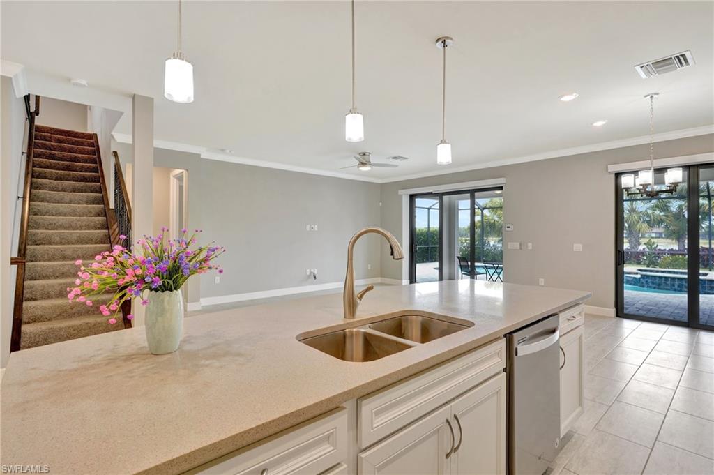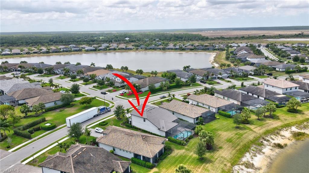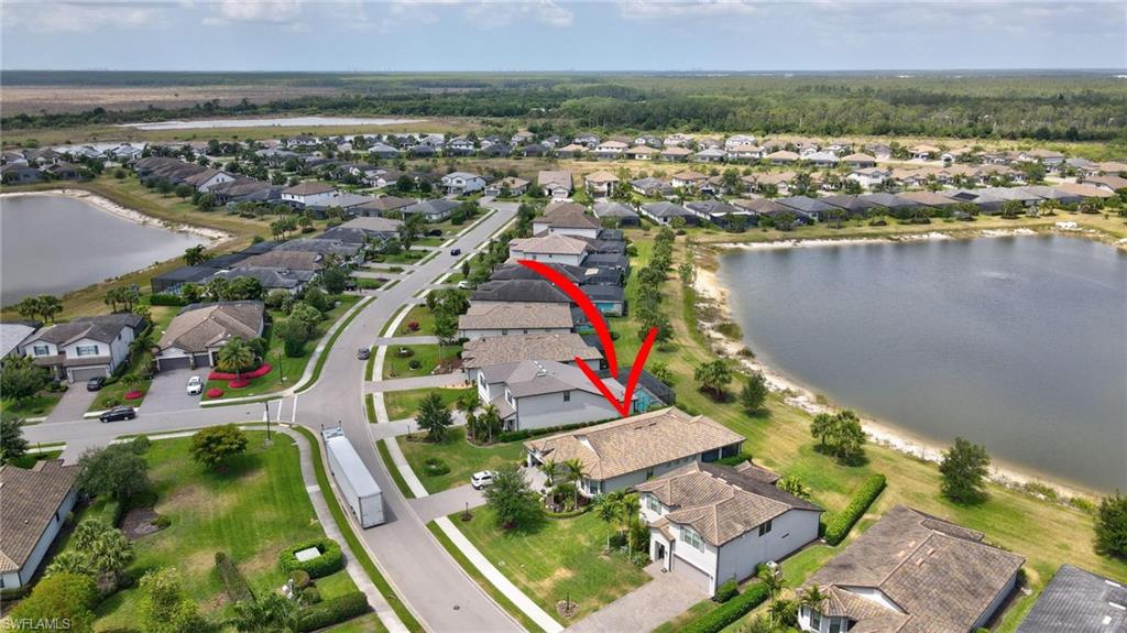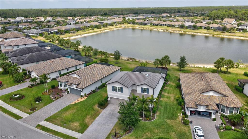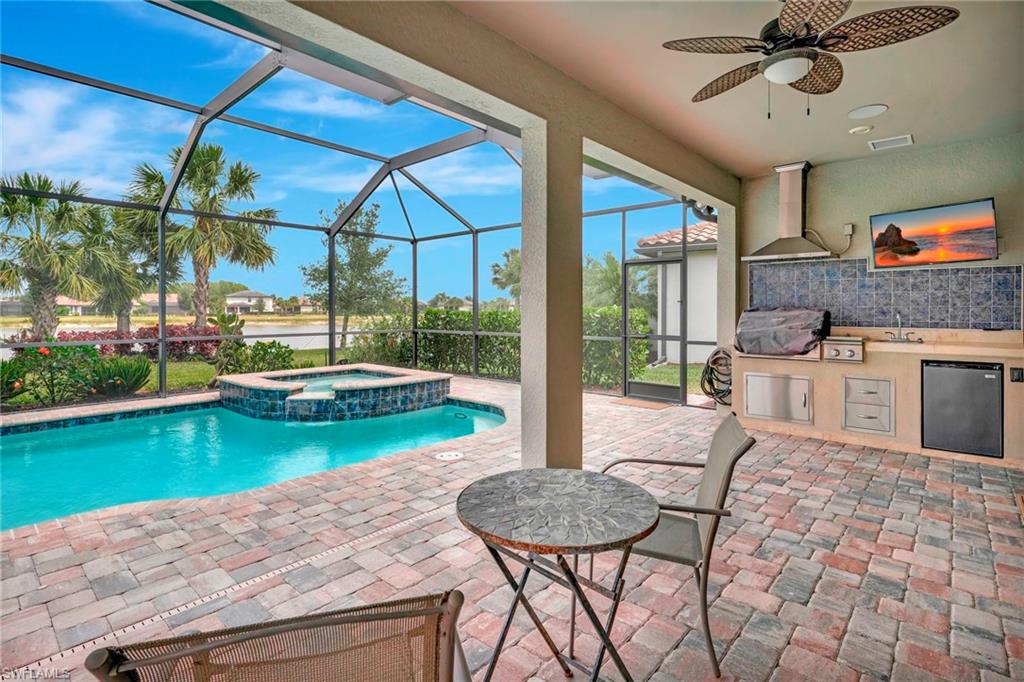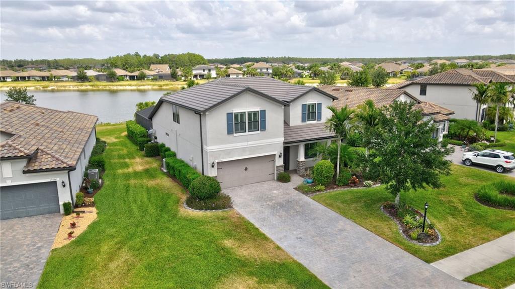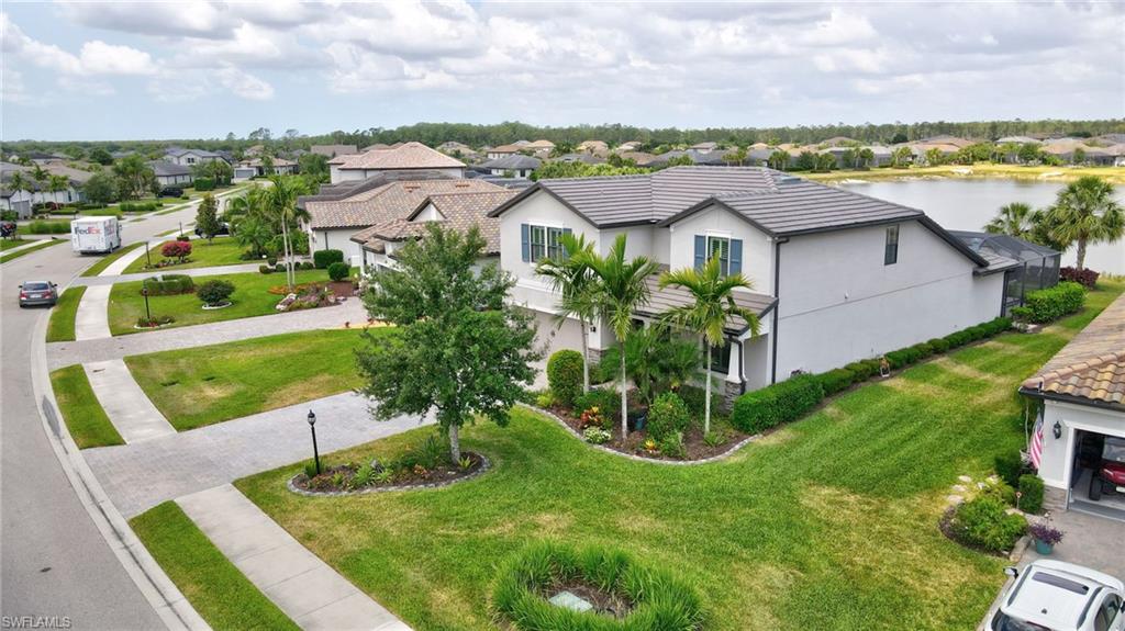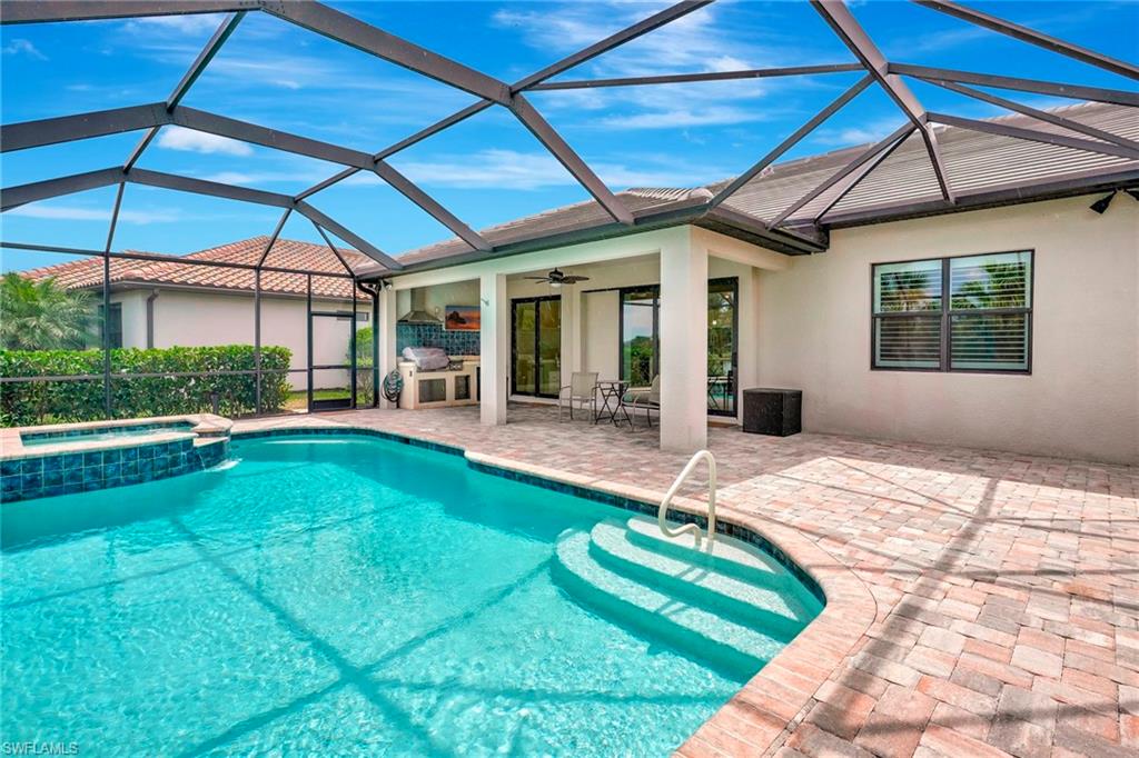 Experience luxury living in this stunning 2-story home, perfectly positioned on a premium lot with sweeping views of the tranquil lake, saltwater pool, and spa—framed by unforgettable Florida sunsets. Spanning over 2,850 square feet, this beautifully designed residence features 4 bedrooms plus a den, 2.5 bathrooms, and an expansive loft ideal for a second living space, playroom, or media area. The open-concept main floor welcomes you with elegant tile flooring throughout and an abundance of natural light streaming through wide impact-resistant glass sliding doors. These doors open seamlessly to the outdoor living area, offering the best of Florida’s indoor-outdoor lifestyle, where living begins. At the heart of the home, the gourmet kitchen boasts stainless steel appliances, a walk-in pantry, and a generous center island—perfect for both everyday meals and entertaining. The private main-floor owner’s suite offers a spacious retreat with an oversized walk-in closet, dual vanities, and a beautifully tiled walk-in shower. Upstairs, you'll find a versatile loft space, three additional bedrooms, and a full bathroom—ideal for family or guests. Step outside to your own backyard oasis, complete with a fully equipped summer kitchen featuring a built-in grill, sink, refrigerator, pavers, and a wall-mounted TV—perfect for alfresco dining and entertaining. Additional highlights include a 2-car attached garage, full hurricane impact glass for peace of mind, and access to resort-style amenities within the highly sought-after gated community of The Place at Corkscrew. Enjoy world-class facilities including a lagoon-style pool, on-site restaurant and bourbon bar, fitness center, tennis and pickleball courts, spa services, and more. All just minutes from Miromar Outlets, FGCU, Hertz Arena, I-75, and RSW International Airport—this is Southwest Florida living at its finest, where living begins.