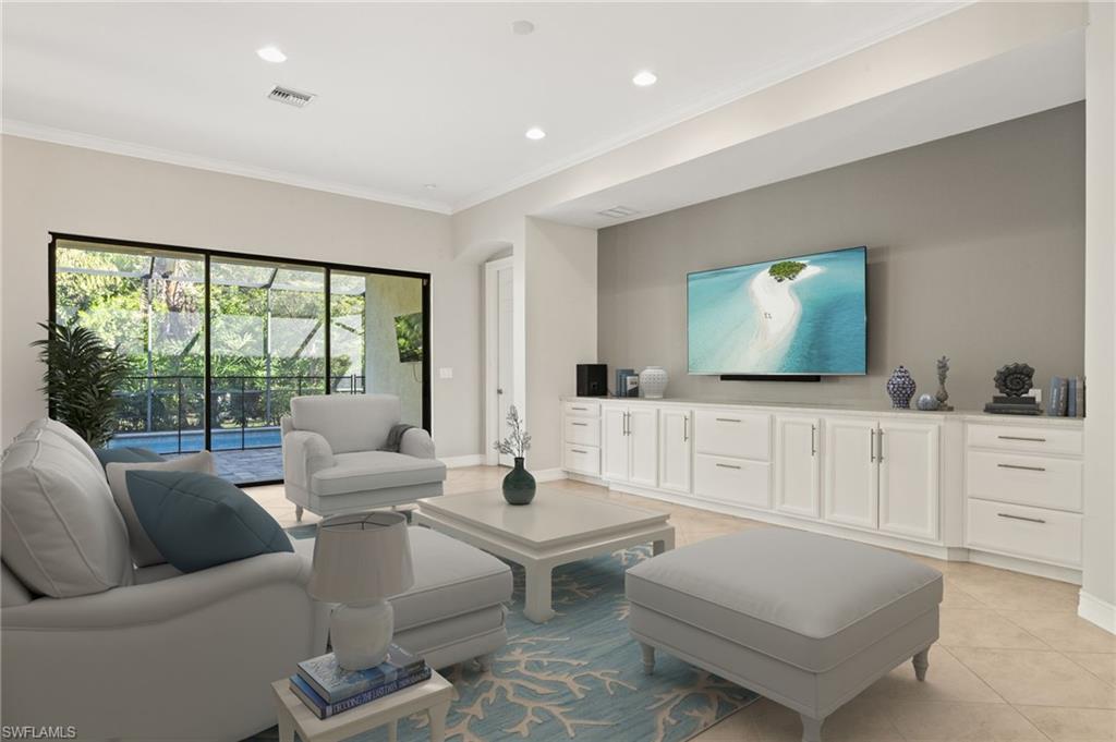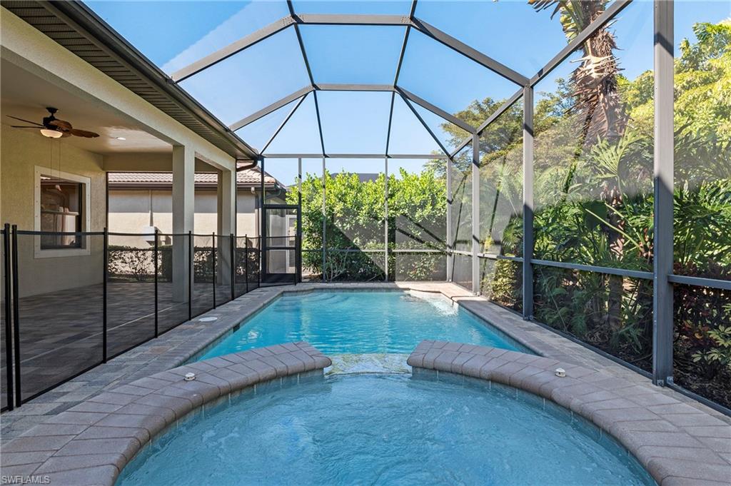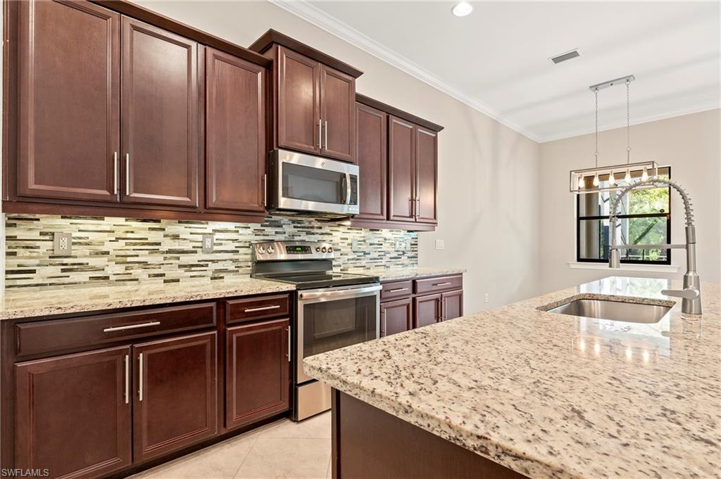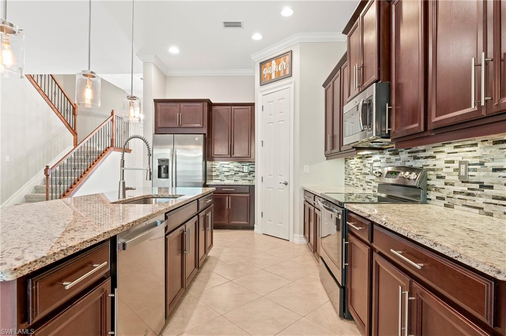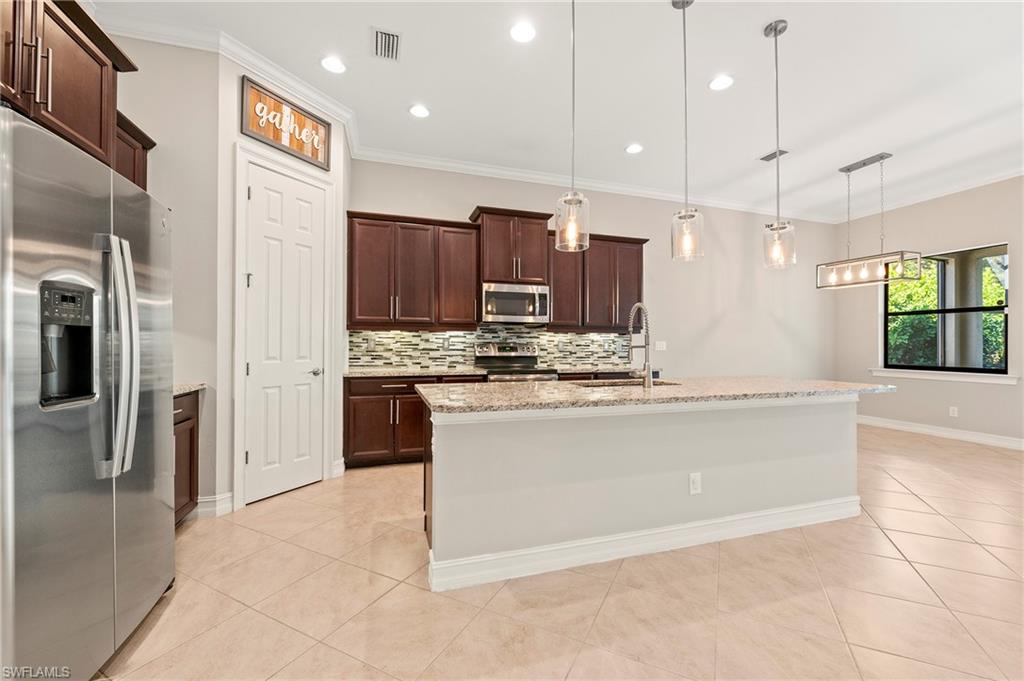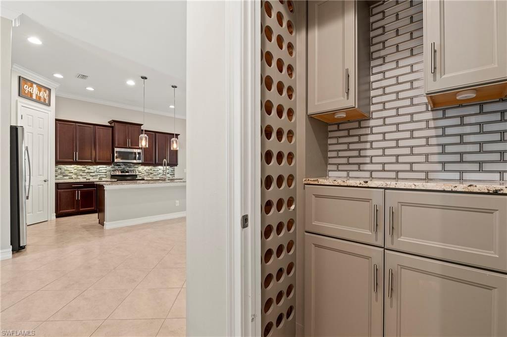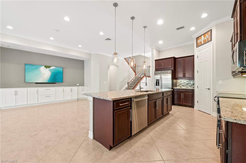 Nestled in the peaceful enclave of Tuscany Pointe in North Naples, this beautifully upgraded 3-bedroom plus den, 3-bathroom pool home offers a perfect blend of style, functionality, and modern comfort. Thoughtfully designed for easy living, the home features a spacious first-floor primary suite with new carpeting, a versatile bonus loft upstairs, and a well-appointed den ideal for a home office or additional guest space. The gourmet kitchen is a true centerpiece, showcasing elegant Cherry Bordeaux cabinetry, granite countertops, and modern appliances, including a brand-new refrigerator and dishwasher. The open-concept living area is enhanced by a custom-built 177-inch cabinet and counter system under the TV, adding both sophistication and practicality. Every closet throughout the home has been upgraded with California Closet systems, ensuring effortless organization, while the permanent shelving in the garage provides smart storage solutions. Additional highlights include an ADT security system for peace of mind and a cleverly designed dry wine closet and bar discreetly tucked into a former coat closet. Step outside to your private oasis, where a heated pool and spa, recently resurfaced for a fresh look and feel, invite relaxation year-round. The large screened-in lanai and spacious backyard provide ample space for lounging, entertaining, and enjoying the Florida sunshine. With pool service, landscaping, trash, and recycling all included in the community, this home offers low-maintenance living in a serene setting—just minutes from the best of North Naples.
