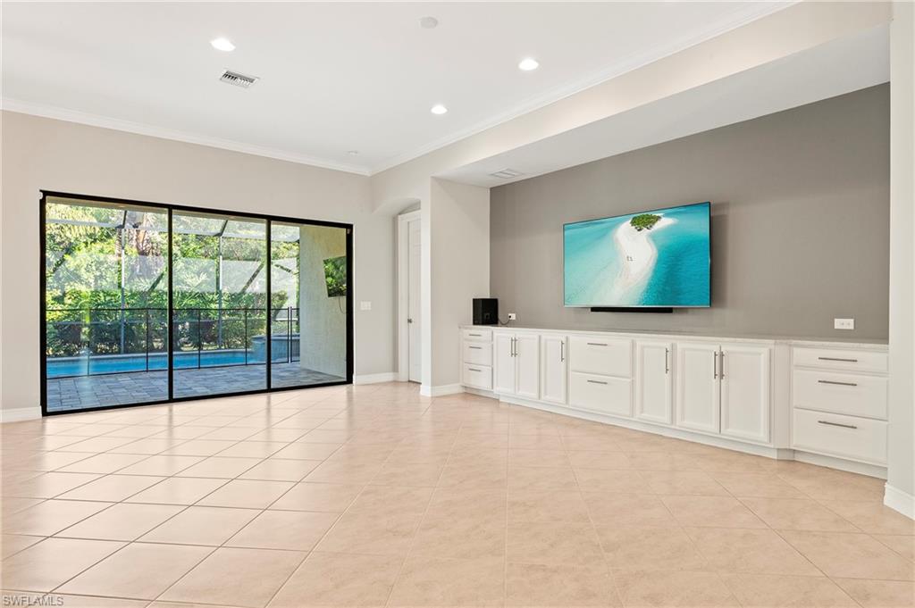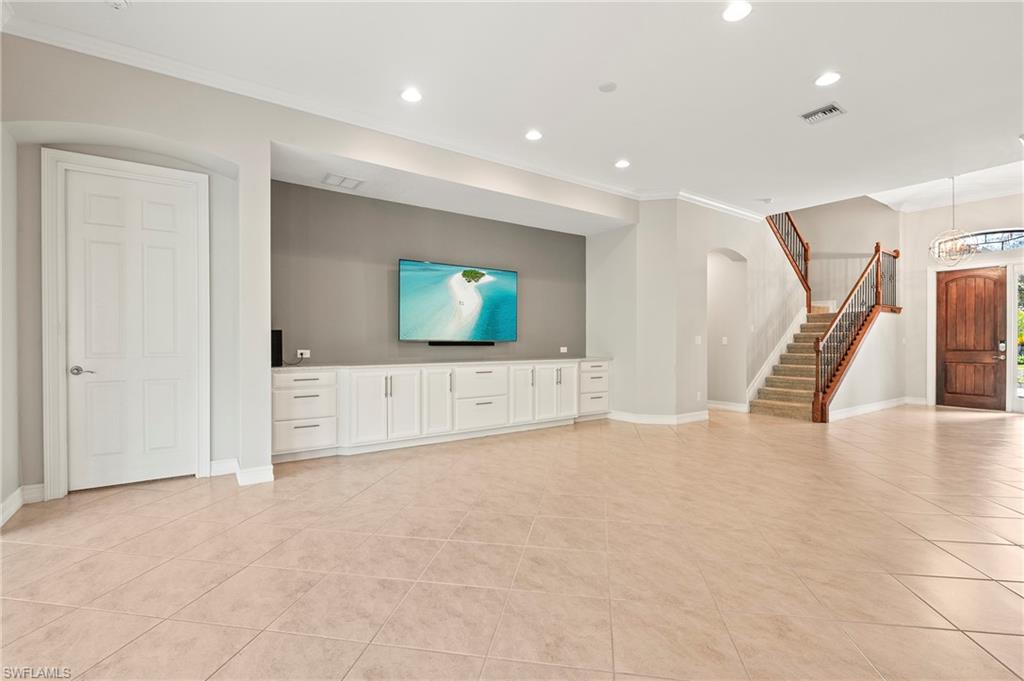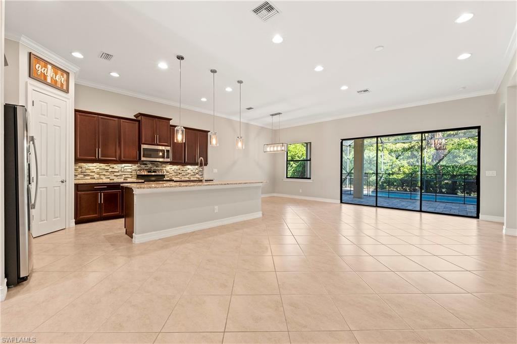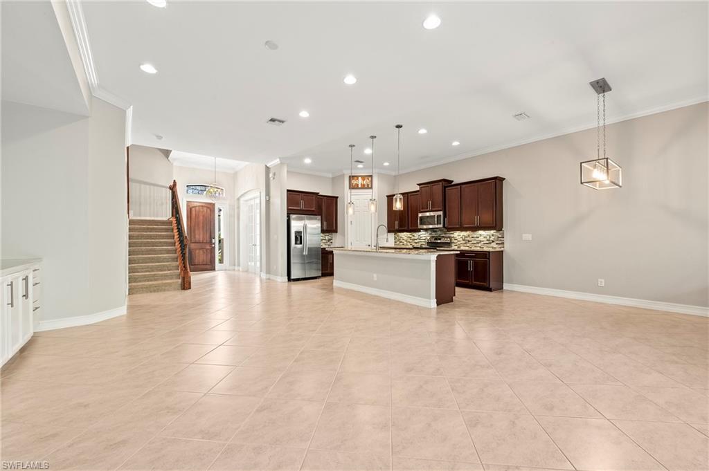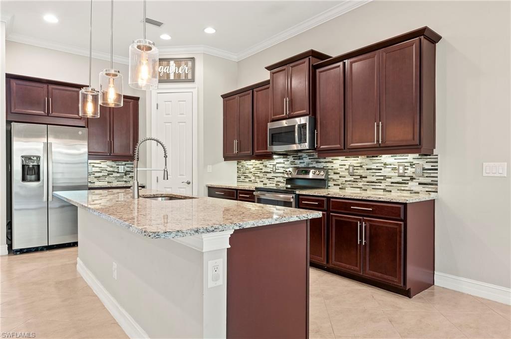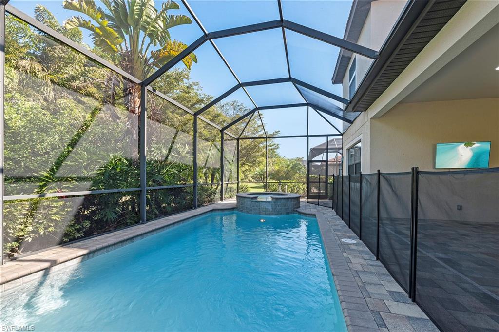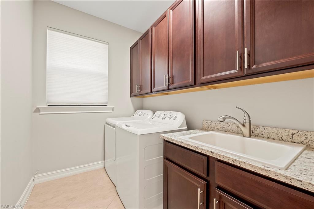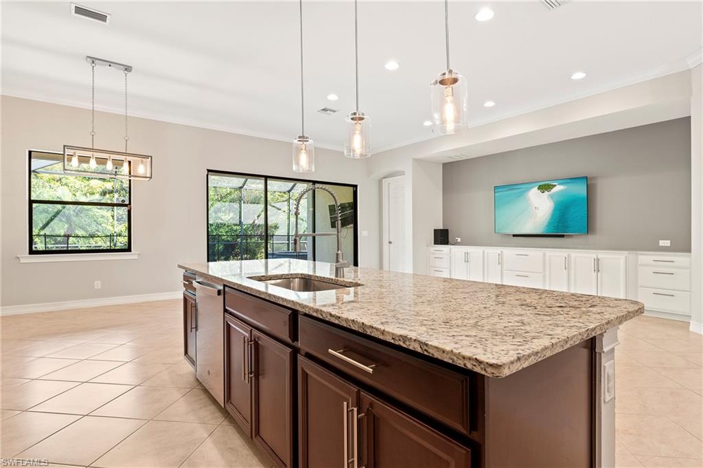 Nestled in the peaceful enclave of Tuscany Pointe in North Naples, this beautifully upgraded 3-bedroom plus den, 3-bathroom pool home offers a perfect blend of style, functionality, and modern comfort. Thoughtfully designed for easy living, the home features a spacious first-floor primary suite with new carpeting, a versatile bonus loft upstairs, and a well-appointed den ideal for a home office or additional guest space. The gourmet kitchen is a true centerpiece, showcasing elegant Cherry Bordeaux cabinetry, granite countertops, and modern appliances, including a brand-new refrigerator and dishwasher. The open-concept living area is enhanced by a custom-built 177-inch cabinet and counter system under the TV, adding both sophistication and practicality. Every closet throughout the home has been upgraded with California Closet systems, ensuring effortless organization, while the permanent shelving in the garage provides smart storage solutions. Additional highlights include an ADT security system for peace of mind and a cleverly designed dry wine closet and bar discreetly tucked into a former coat closet. Step outside to your private oasis, where a heated pool and spa, recently resurfaced for a fresh look and feel, invite relaxation year-round. The large screened-in lanai and spacious backyard provide ample space for lounging, entertaining, and enjoying the Florida sunshine. With pool service, landscaping, trash, and recycling all included in the community, this home offers low-maintenance living in a serene setting—just minutes from the best of North Naples.