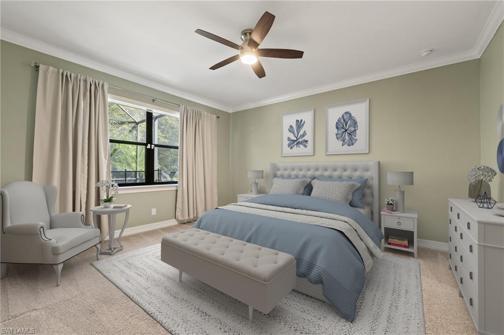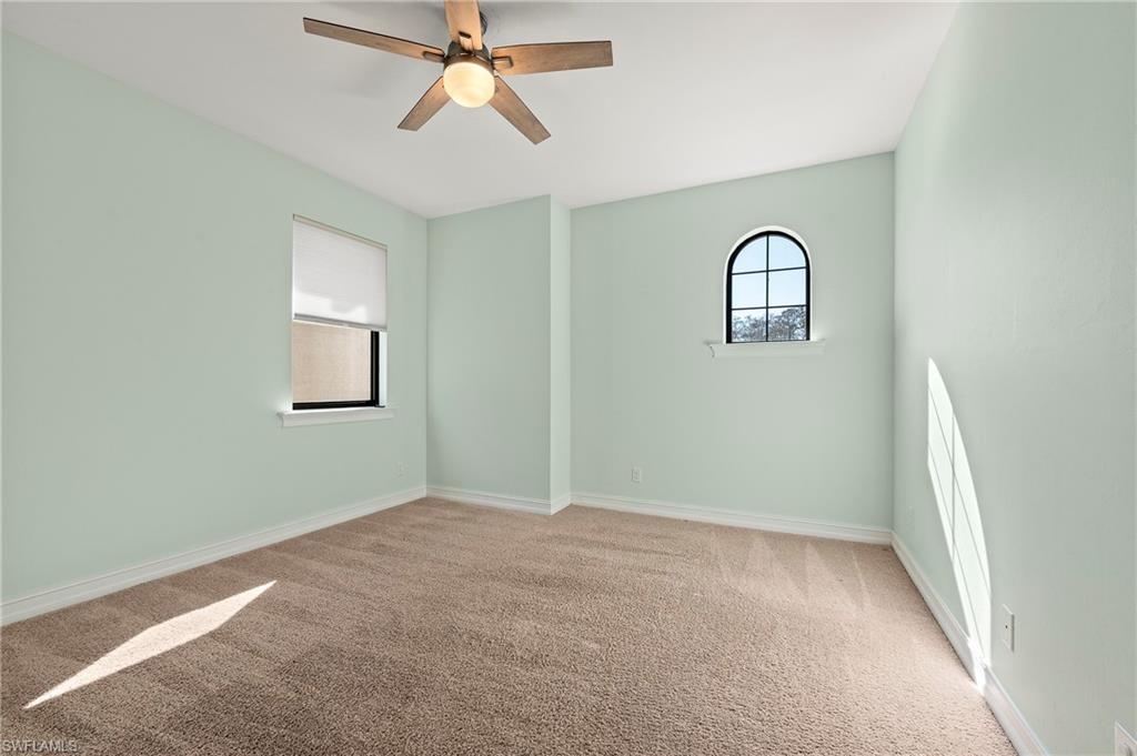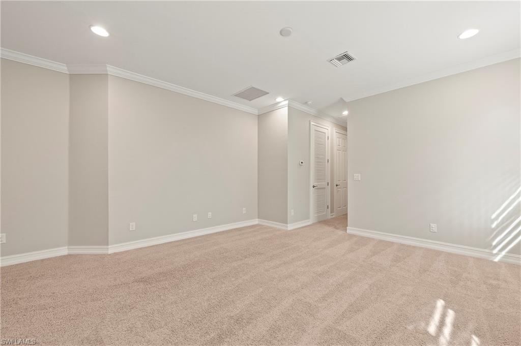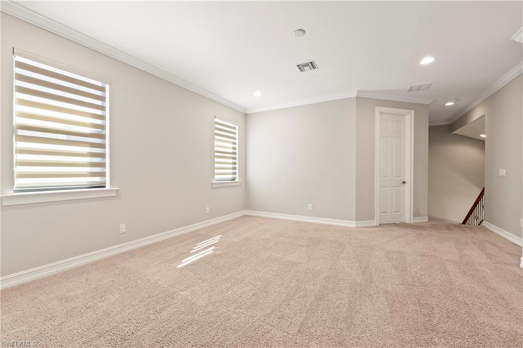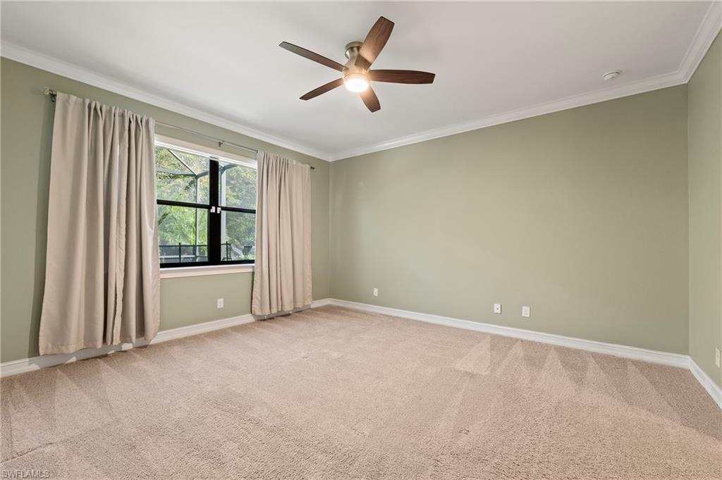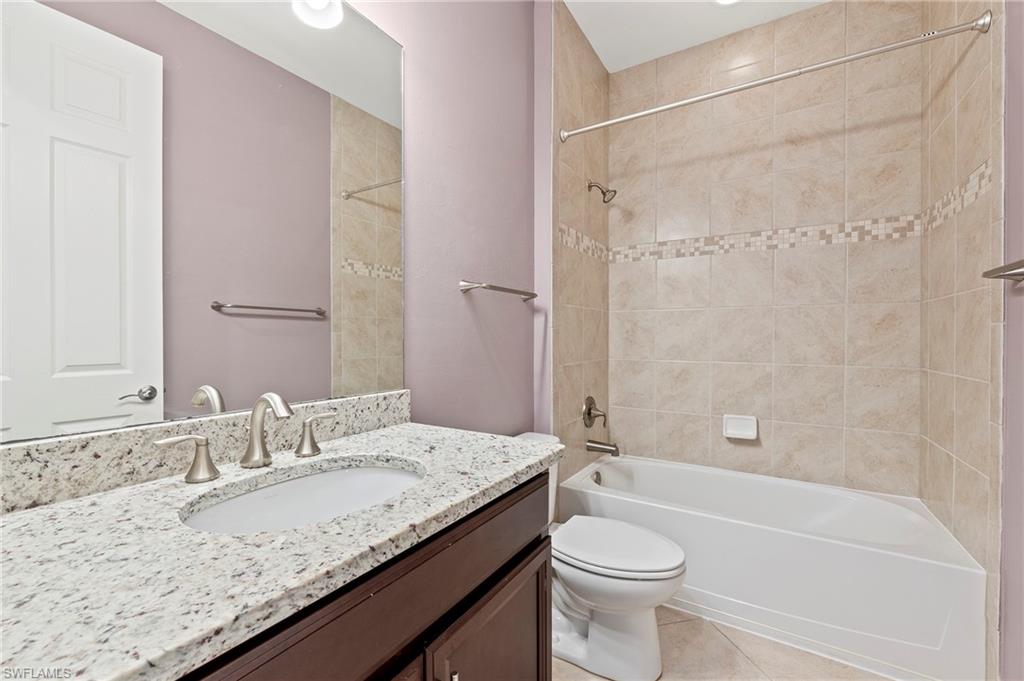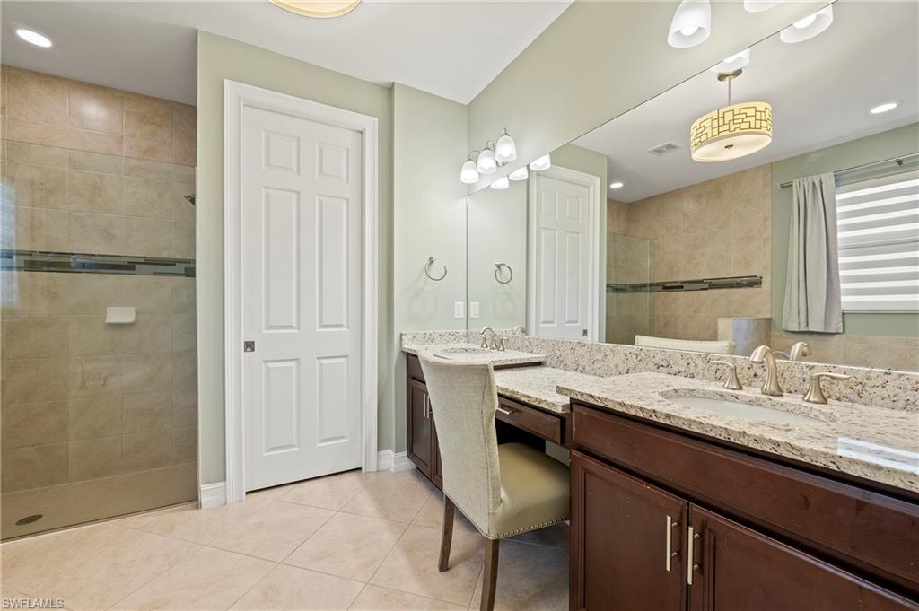 Nestled in the peaceful enclave of Tuscany Pointe in North Naples, this beautifully upgraded 3-bedroom plus den, 3-bathroom pool home offers a perfect blend of style, functionality, and modern comfort. Thoughtfully designed for easy living, the home features a spacious first-floor primary suite with new carpeting, a versatile bonus loft upstairs, and a well-appointed den ideal for a home office or additional guest space. The gourmet kitchen is a true centerpiece, showcasing elegant Cherry Bordeaux cabinetry, granite countertops, and modern appliances, including a brand-new refrigerator and dishwasher. The open-concept living area is enhanced by a custom-built 177-inch cabinet and counter system under the TV, adding both sophistication and practicality. Every closet throughout the home has been upgraded with California Closet systems, ensuring effortless organization, while the permanent shelving in the garage provides smart storage solutions. Additional highlights include an ADT security system for peace of mind and a cleverly designed dry wine closet and bar discreetly tucked into a former coat closet. Step outside to your private oasis, where a heated pool and spa, recently resurfaced for a fresh look and feel, invite relaxation year-round. The large screened-in lanai and spacious backyard provide ample space for lounging, entertaining, and enjoying the Florida sunshine. With pool service, landscaping, trash, and recycling all included in the community, this home offers low-maintenance living in a serene setting—just minutes from the best of North Naples.