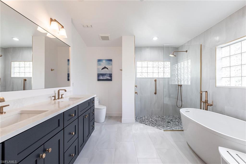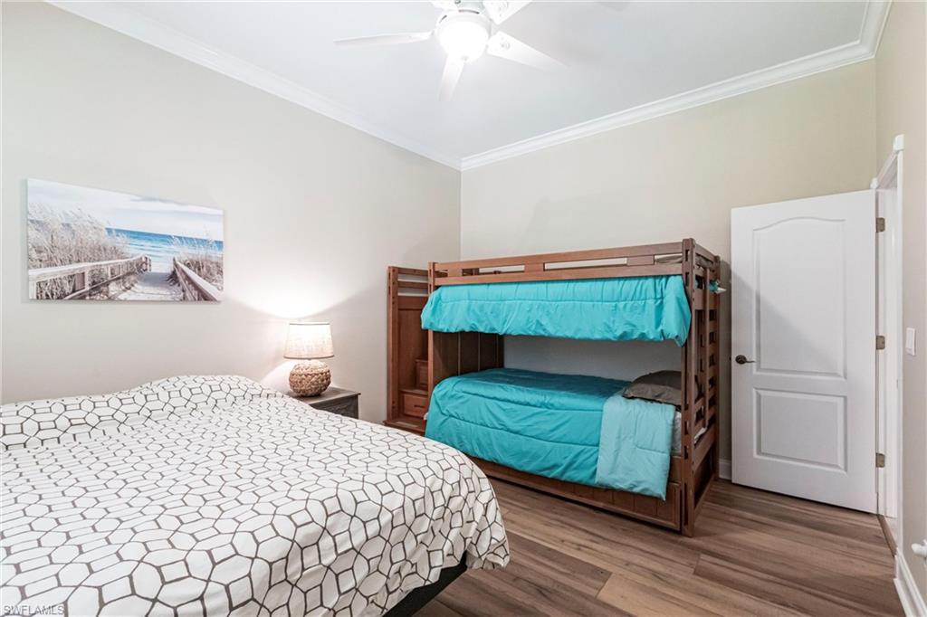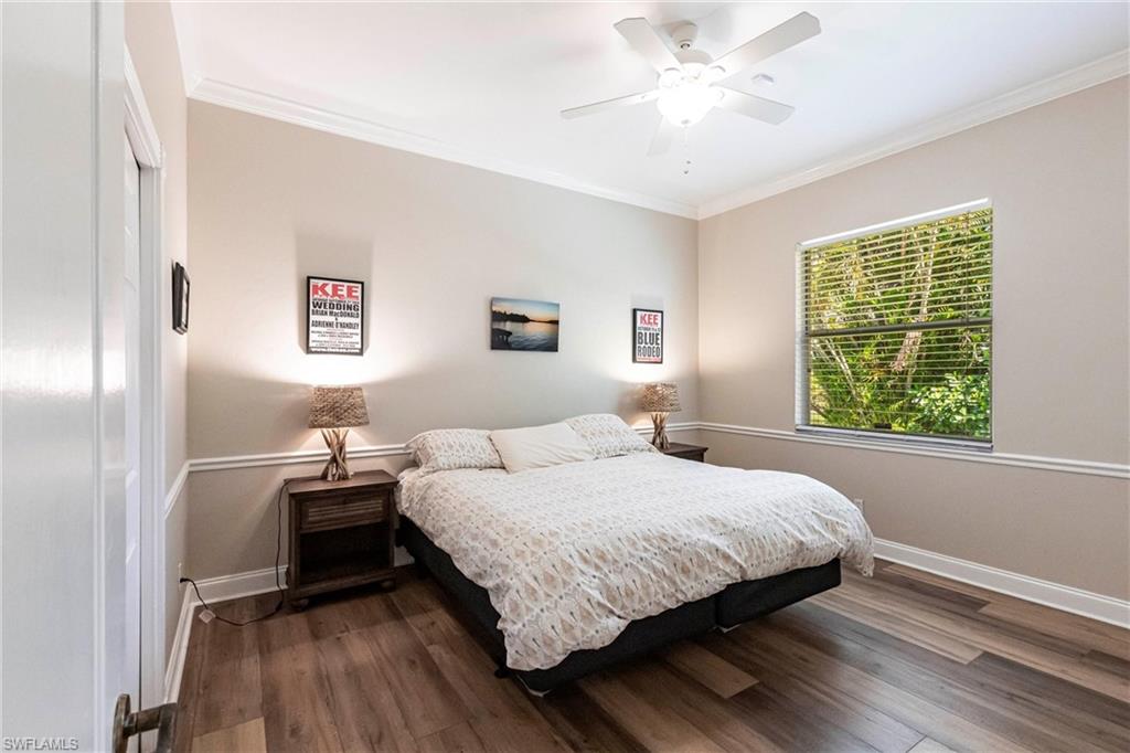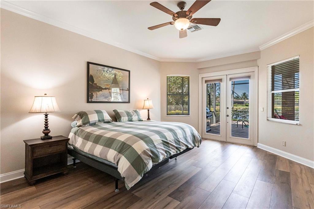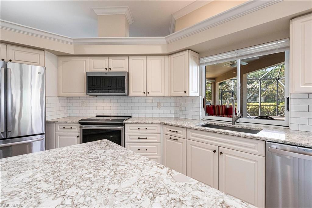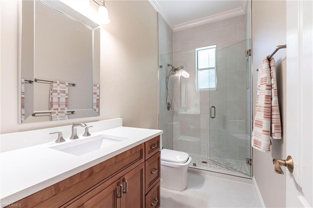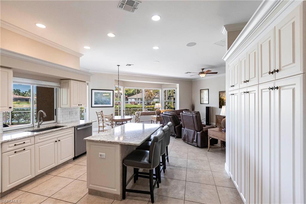 Come take a look at this fantastic lakefront home in Longshore Lake offering 3 bedrooms, den, 2.5 baths, heated pooland beautiful lakefront westerly views. This fantastic home has been renovated with new bathrooms and updated kitchen with quartz countertops and stainless appliances. Other upgrades include crown molding, all closets have custom cabinets, primary suite offers 2 closets, walk in shower and soaking tub. This is an oversized lot with lots of privacy. Longshore Lake is a premier North Naples gated community with an 88 acre lake for boating, fishing and kayaking, a clubhouse with restaurant ,bar and outdoor dining, 9 Har tru tennis courts with full time pro, pickleball, fitness center and miles of walking paths. It is also close to shopping and sugar sand beaches.Move in ready!