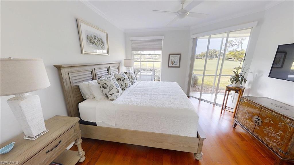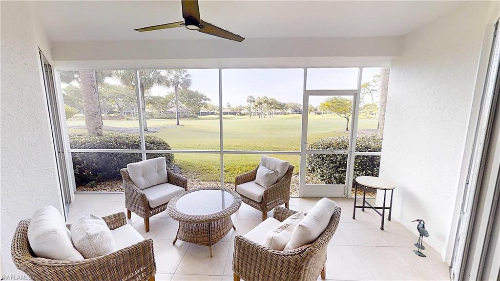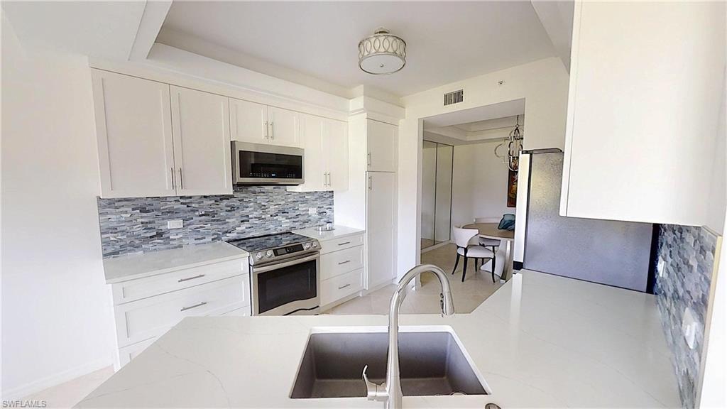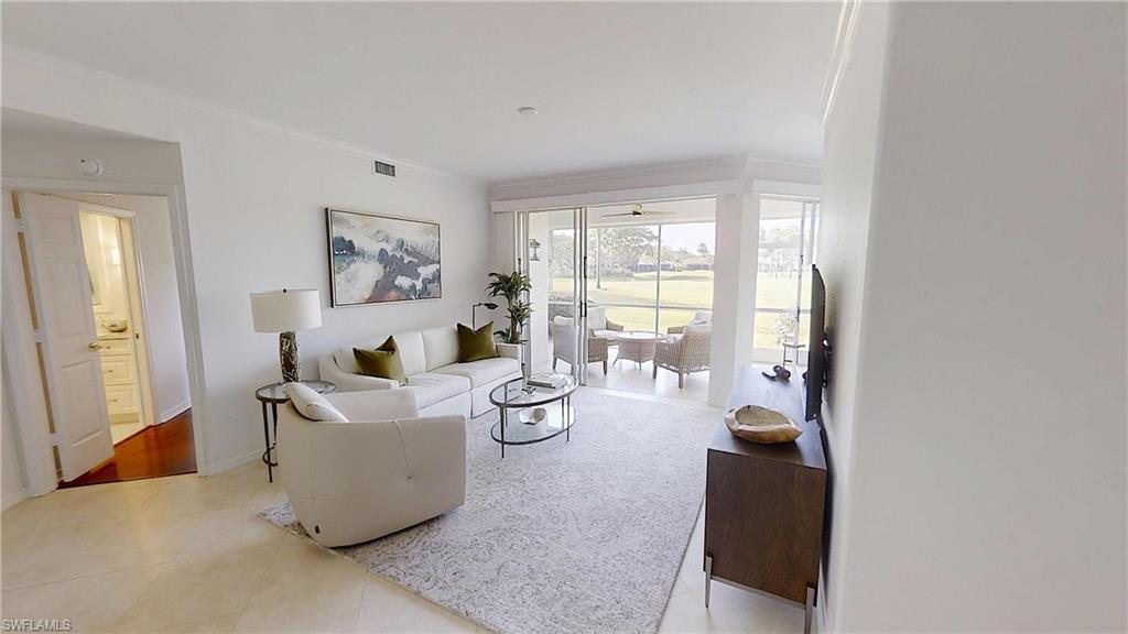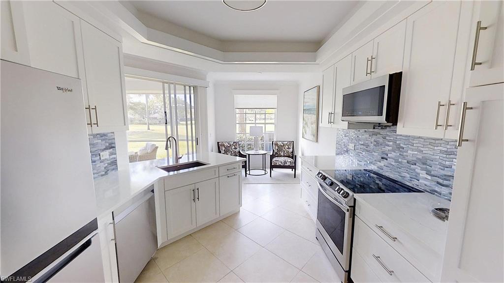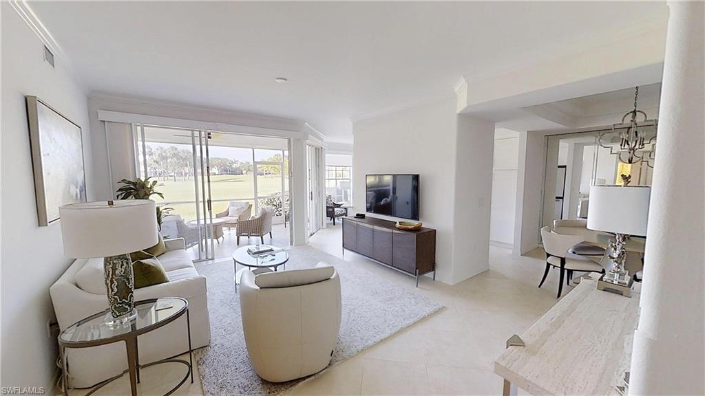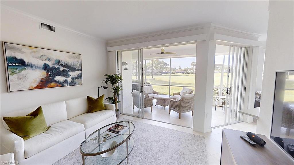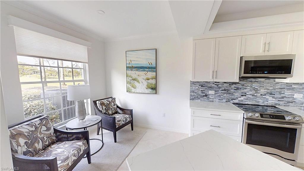 Experience light-filled luxury and spectacular golf course vistas in this beautifully renovated first-floor condo in Arielle at Pelican Marsh. This residence offers a sought-after southern exposure, featuring three bedrooms and two bathrooms, making the living spaces bright and inviting throughout the day. Highlights include: Spacious open layout with custom mirrors, tile, and wood flooring, reconfigured and renovated bathrooms for a modern touch, remodeled kitchen with quartz counters, slabbed-out breakfast bar, and new appliances: oven/stove, refrigerator, and dishwasher, one-car garage with epoxy-coated floor for durability and style, an additional den provides flexible space for a home office or guest room.