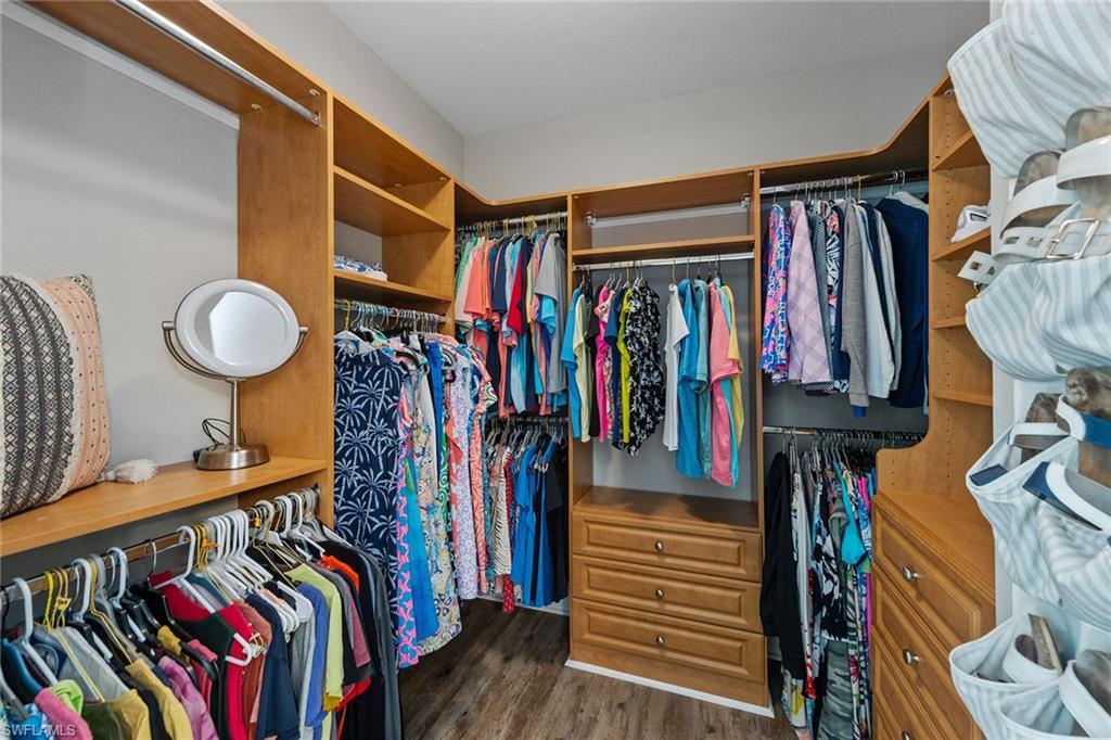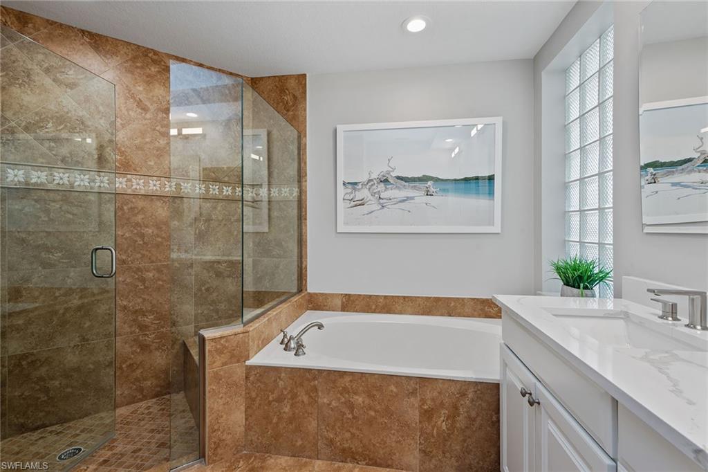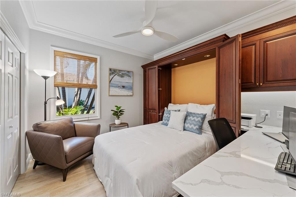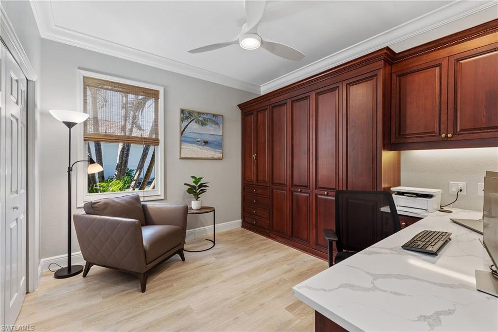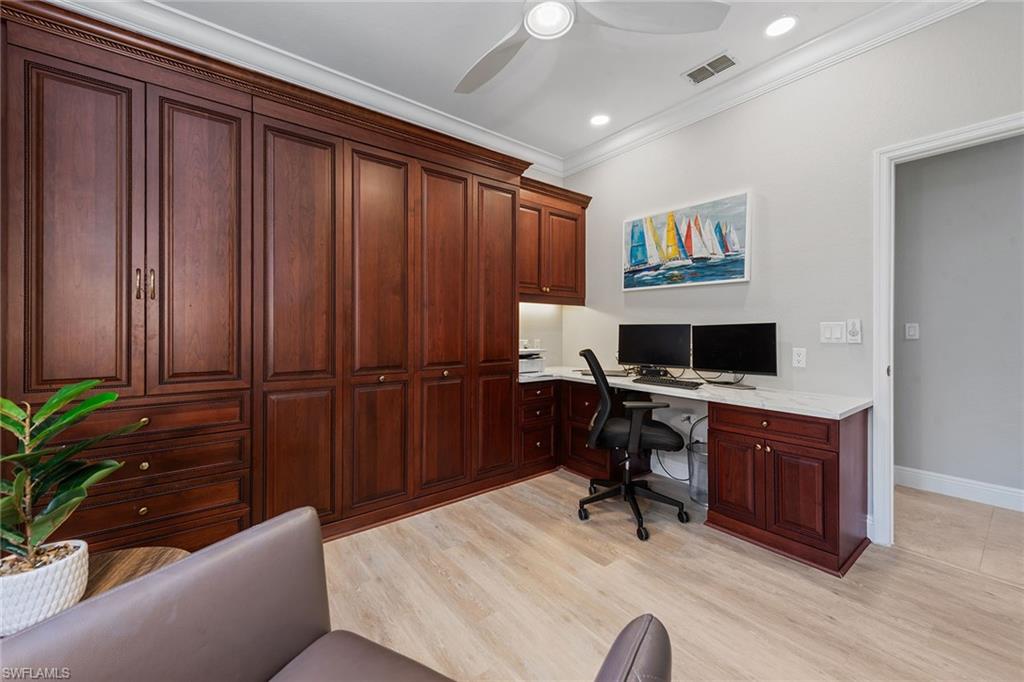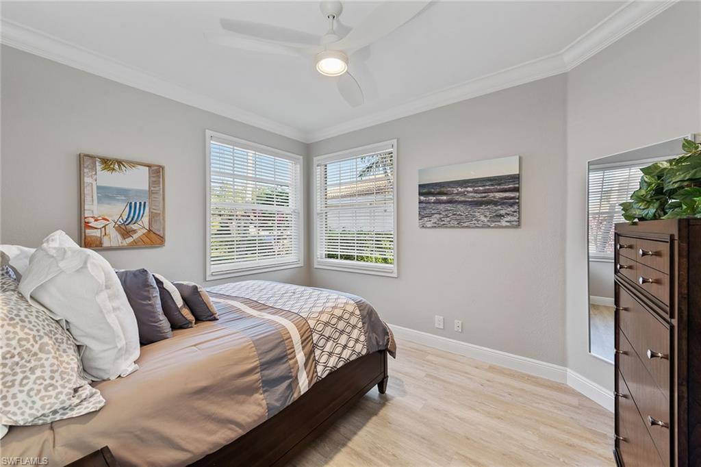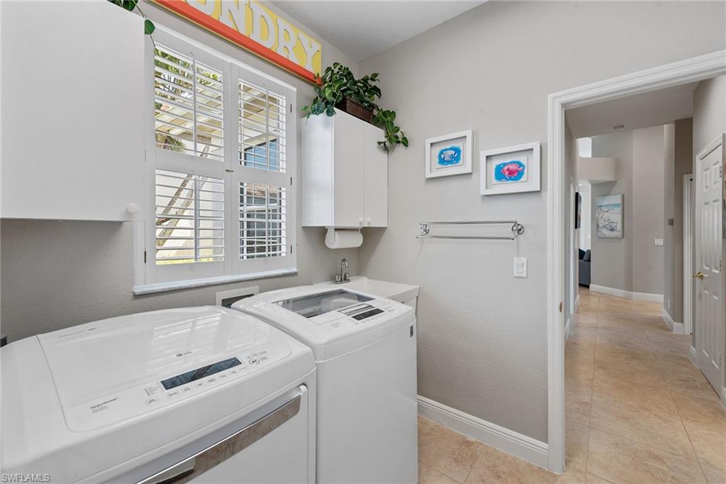 Dreaming of serene lake views, breathtaking sunrises and resort-style living? This beautifully furnished three-bedroom, two-bath home in Pepper Tree at Fiddler’s Creek offers it all, including a split-bedroom layout for privacy and a no-see-um screened lanai framing tranquil water vistas. Ideally near the award-winning Club & Spa and gatehouse, this residence combines peaceful outdoor living with refined interior finishes in one of Naples’ most prestigious communities. Quality built by Gulf Bay. The interior features diagonal tile flooring, volume ceilings, crown molding and modern ceiling fans throughout. The open kitchen is tastefully updated with white modern cabinetry, quartz countertops and backsplash, pantry, under-cabinet lighting, recessed lighting, a single-vessel undermount sink and stainless appliances, including a French-door refrigerator, range, microwave and Bosch dishwasher. A breakfast bar offers casual seating, while the adjacent dining area overlooks lush gardens through a large picture window and provides direct lanai access. Light and airy, the living room includes recessed lighting and glass sliders that open to the lanai, blending indoor and outdoor spaces. The primary suite is a tranquil retreat with lake views, double-door entry, white plantation shutters, lanai access, and custom walk-in closets with built-ins. The en-suite bath is beautifully updated and features a dual-sink quartz vanity, frameless glass walk-in shower with bench, soaking tub, privacy window and linen closet. The guest wing includes two bedrooms—one set up as a home office with built-in cabinetry and Murphy bed—plus an updated full bath with walk-in shower. The screened lanai is ideal for entertaining, offering tile flooring, an updated outdoor kitchen with stone backsplash, built-in barbecue and beverage refrigerator, counter space and wide lake views. Additional features include storm shutters, painted garage floor, newer tankless water heater, washer and dryer, and wood-look LVT flooring in all bedrooms. A new tile roof under one year old adds value and peace of mind. There’s even room to add a pool. Residents of Fiddler’s Creek enjoy a world-class lifestyle with a resort-style Club & Spa featuring indoor and poolside dining, full fitness center with classes and trainers, resort pools, spa, hot tub, sauna, steam room, bocce, tennis, pickleball and year-round events. Optional memberships are available for The Tarpon Club (beach/marina) and The Creek Golf Course with a new clubhouse and renovated course. Nearby are everyday conveniences such as Publix, salon, urgent care, and a new health café/store—plus easy access to Marco Island, downtown Naples, shopping, dining and executive airport.
