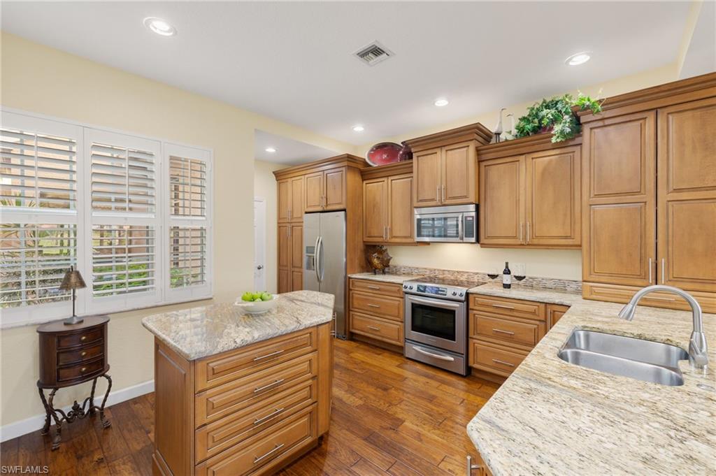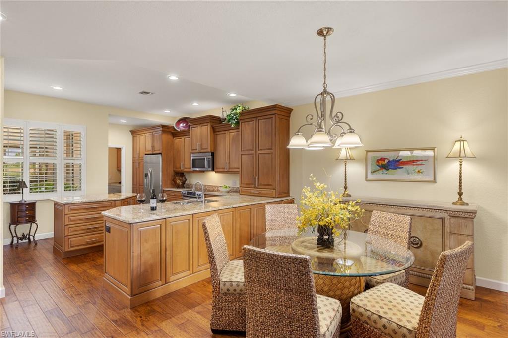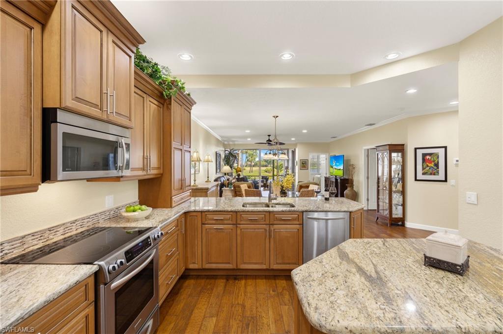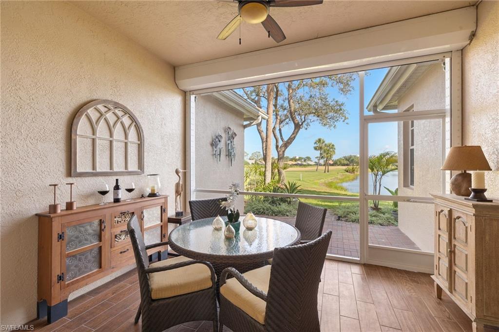 Unheard of in this sought after Mystic Ridge neighborhood, steps to the Nest Golf Club. This first floor, three bedroom, two bath, end home boats inviting views of the lake and golf course beyond, creating the perfect private paradise. The Tommy Bahama inspired renovation with wood floors set the tone for warmth and elegance throughout. The spacious great room concept flows efficiently into the updated kitchen, showcasing designer cabinets, stunning granite countertops, stainless appliances and an island ideal for the culinary enthusiasts delight. Both bathrooms redesign maintain the same theme throughout this well maintained home offering unparalleled style and comfort. Reconnect and relax - start enjoying a day on Pelican Landing's crown jewel, a 34 acre, sugar white sand, private island beach park in the Gulf of America. Additional amenities include the canoe and kayak park & sailing center that include complimentary vessels, bocce, butterfly garden, fishing, tennis center with 12 Har-Tru lighted courts and full time Pro, a pickle-ball program, a community center that offers a myriad of activities complemented by the wellness center with 4200 SF of fitness & aerobics. There are so many highlights evoking charm everywhere you look, this home has certainly proven to be the perfect choice. A must see. Schedule your appointment today.