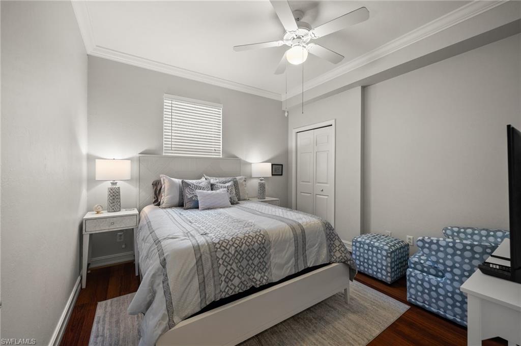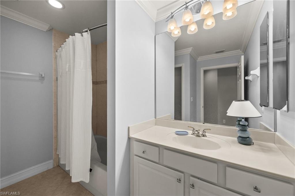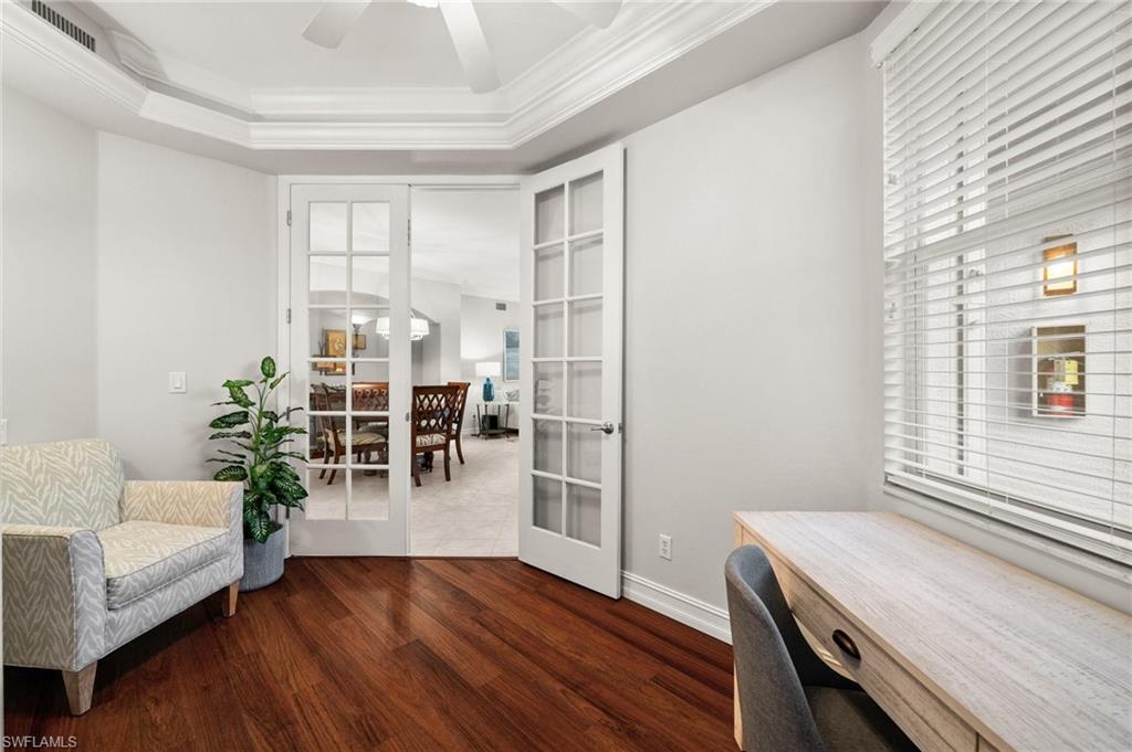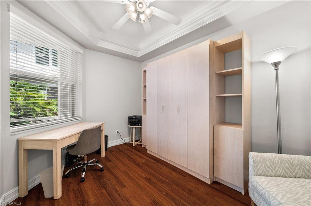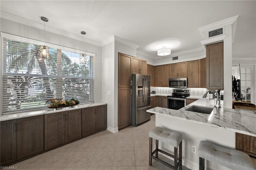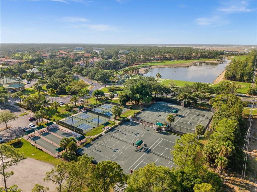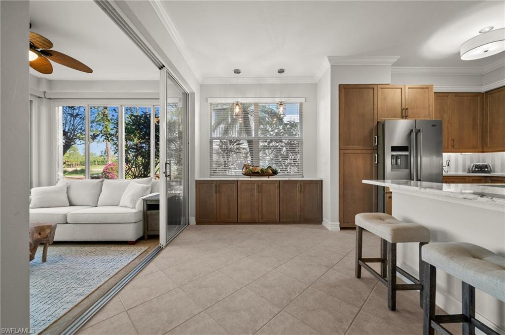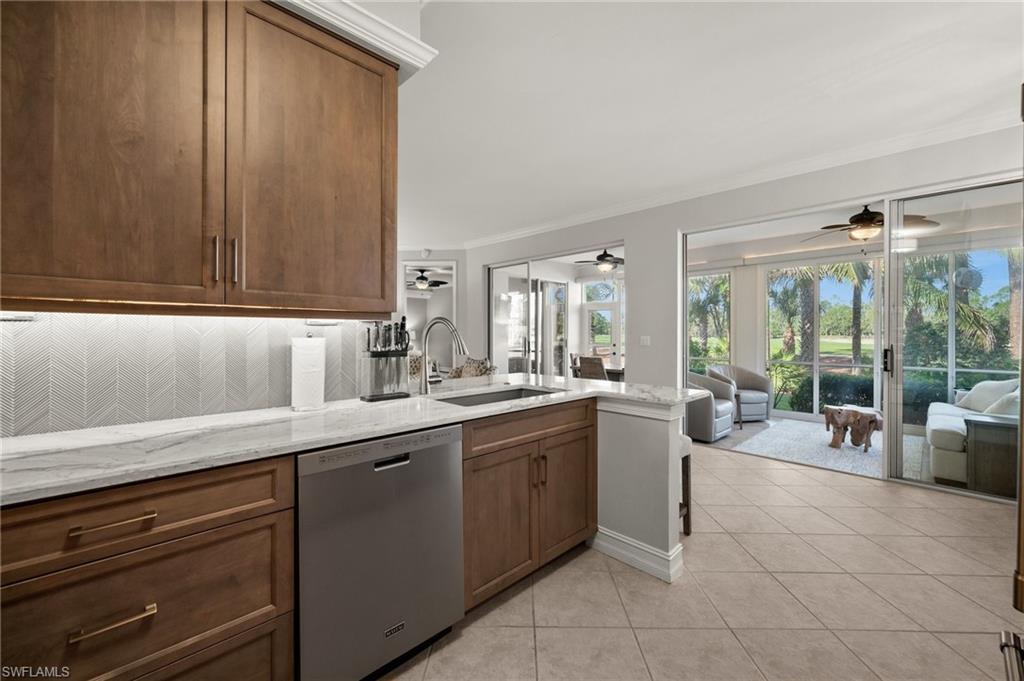 Welcome to this meticulously maintained, turnkey ground floor coach home located in Bishopwood West at Forest Glen. Rarely available and beautifully furnished, this unit includes bundled golf. A paver driveway and walkway lead you to a 1-car attached garage and a screened front entry. 1,869 square feet of thoughtfully designed living space can be found inside with diagonally laid tile in the main living area and crown molding throughout. The kitchen was completely renovated just one year ago and features gorgeous cabinetry, stainless steel appliances, and sleek marble countertops. The floor plan includes two generously sized bedrooms, plus a spacious den with French doors and a built-in Murphy bed. This flexible space works perfectly as a home office or guest room. For outdoor living, a large screened lanai offers tranquil water views and views of the 1st hole of the golf course. Additional upgrades include full hurricane shutters and a new A/C system installed in 2022. Beyond golf, residents enjoy a wide range of amenities: a clubhouse with dining, resort-style pool and spa, fitness center, tennis and pickleball courts, and miles of bike and jogging paths. Perfectly located just off Collier and Davis Blvd, you’re only minutes from I-75, 5th Avenue South, and the best of Naples' shopping, dining, and entertainment.