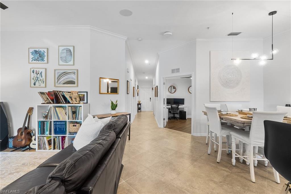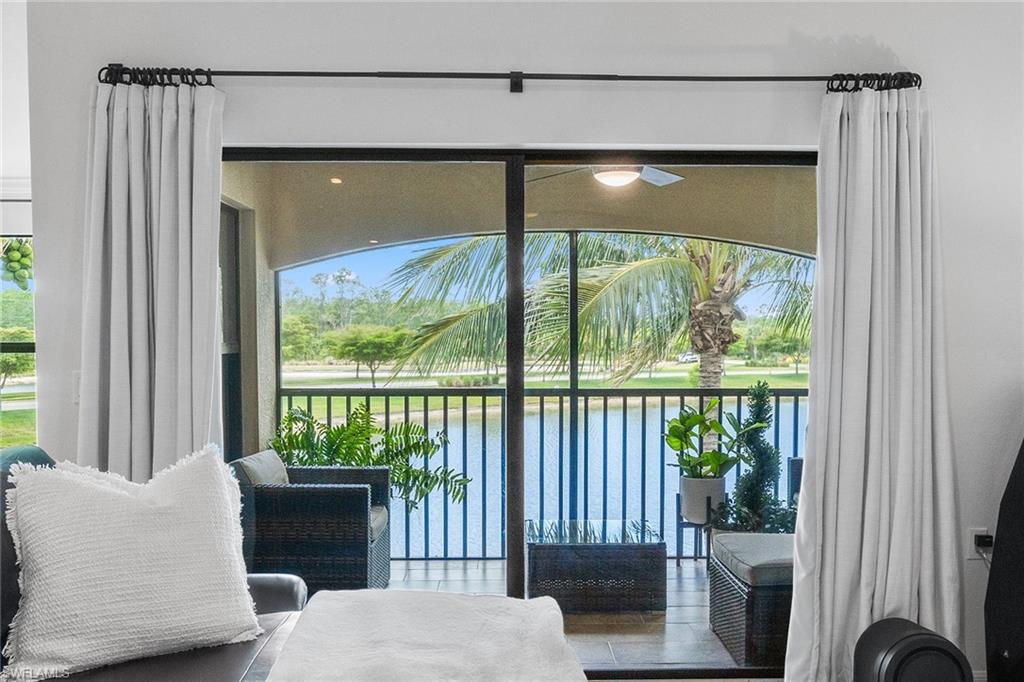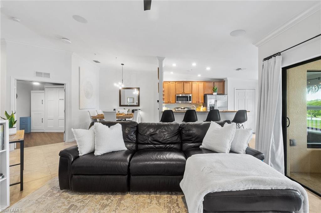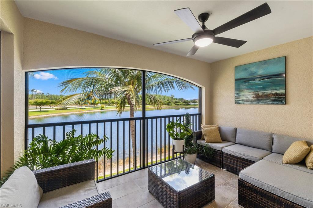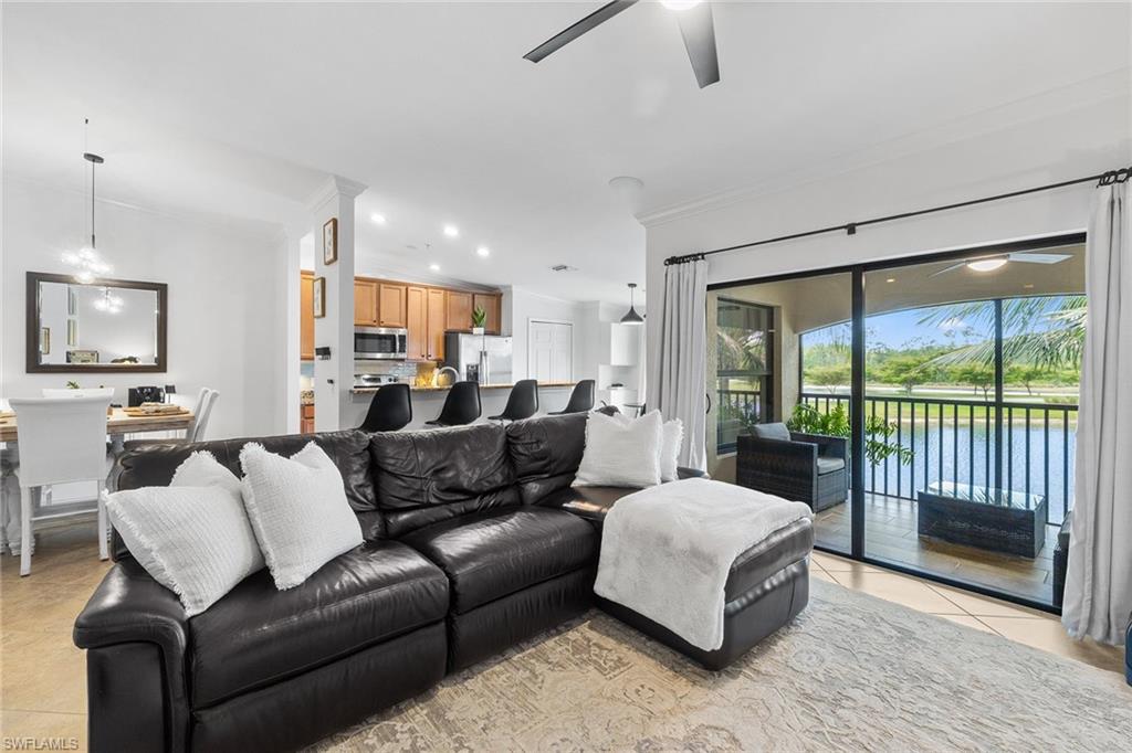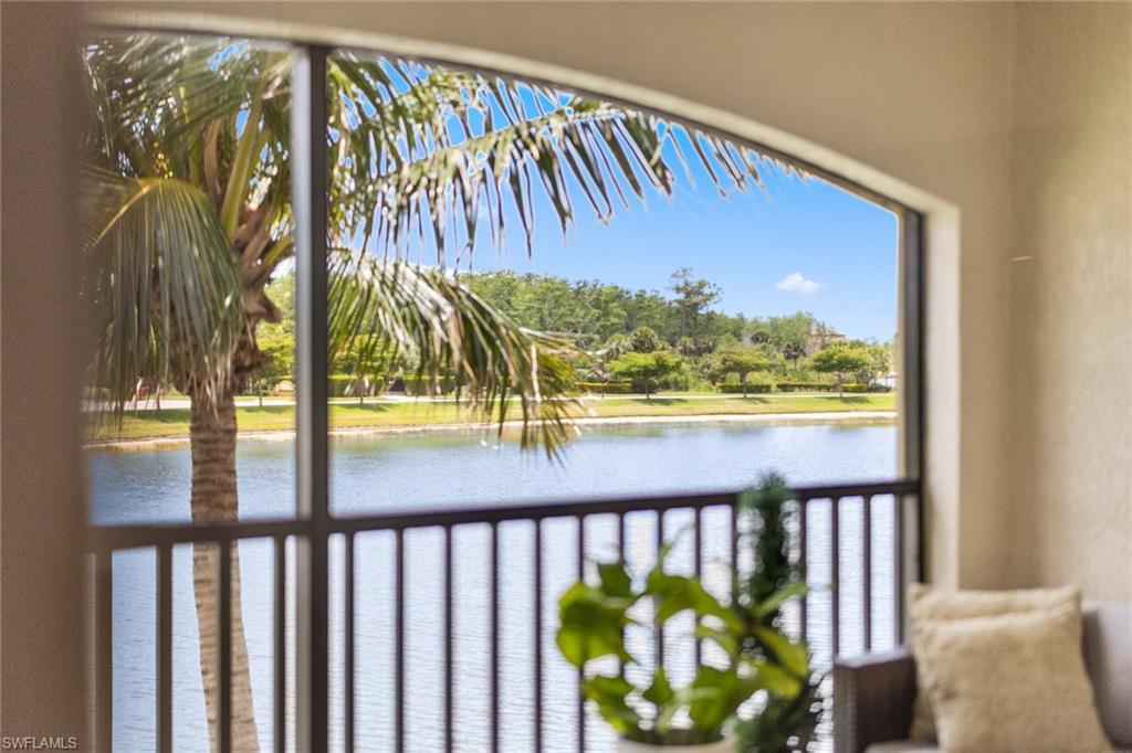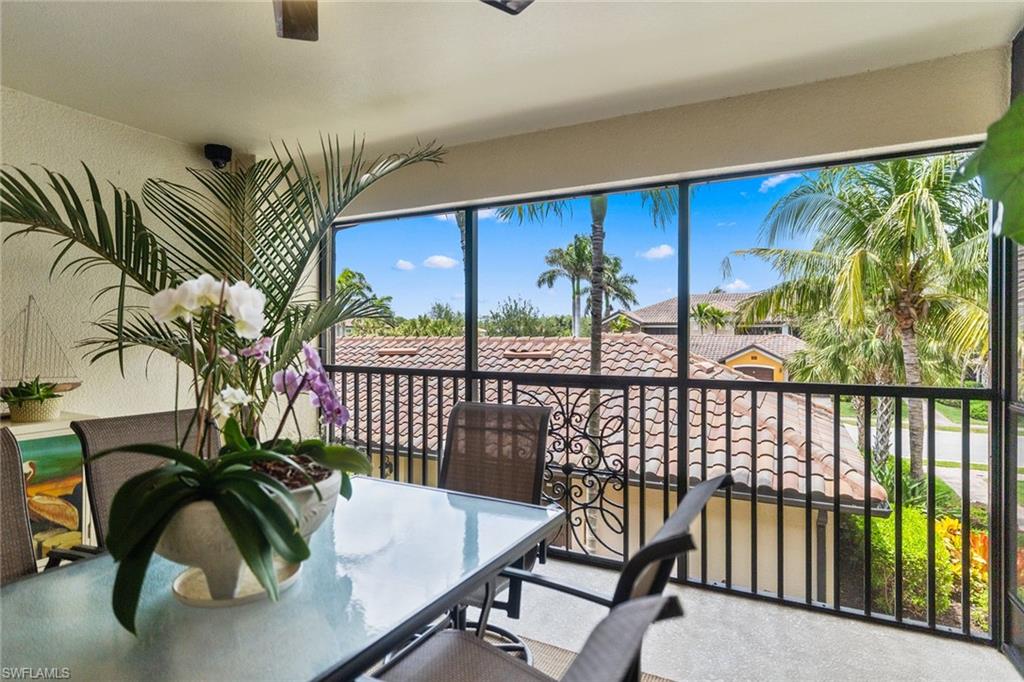 This social membership two-bedroom plus den, two bath features the Diangelo floor plan and includes an incredible and rarely available southern exposure view in the heart of Treviso Bay. Enter the top-floor residence through the spacious front screened Veranda to find extra-high ceilings and a unique blend of elegance and functionality. The wide-open floor plan of this popular model is ideal for entertaining and family living. The open concept flows from kitchen/breakfast nook to dining room and living room, creating one extra-large space. Accentuated by soaring ceilings and wide-line crown molding, it's ideal for hosting parties, movie nights and culinary adventures. Updated LED lighting fixtures and ceiling fans add a touch of contemporary style. For tech lovers, this condominium has been wired post-construction to support four rooms of in-ceiling speaker pairs and 15+ Cat6 data, security and wireless access point location drops, including the repainted and epoxy-coated detached garage. The den is a versatile space, featuring a queen-sized built-in Murphy bed with spacious storage for office supplies and linens and added crown molding, making it ideal for guests and a home office setup. Plus, enjoy the comfort of tastefully done wood-toned flooring in both bedrooms and the den. The kitchen features modern stainless steel GE appliances with a new dishwasher and tiled backsplash. The southern exposure fills the main living area with natural light all day long and the 24-by-12-inch tiled and super-screened back lanai provides a tranquil outdoor retreat where one can gaze at a pristine preserve, open skies and multiple lake water views. Don't miss your chance to own this exceptional condominium offering luxury, comfort and modern convenience in one of the sought-after Naples communities. Conveniently situated, a brief stroll leads to eight pickleball courts one way, and Villa Rilassare the other direction, which offers a host of elite amenities including a resort-style pool featuring cascading waterfalls, eight Har-Tru tennis courts with league play and pro instruction, poolside bar and dining options fully renovated March 2025, rejuvenating spa facilities, as well as tennis and bocce ball courts, elaborate fitness and aerobics facilities, saunas and steam rooms. World-class dining is enjoyed on the 18-hole TPC championship golf course grounds at the opulent clubhouse with an array of social activities on the calendar. Golf is available to social members of Treviso Bay from May to October. Ideally just five miles from vibrant downtown area of Olde Naples and in proximity to pristine beaches of Naples and Marco Island, this residence epitomizes sophisticated coastal living at its finest.