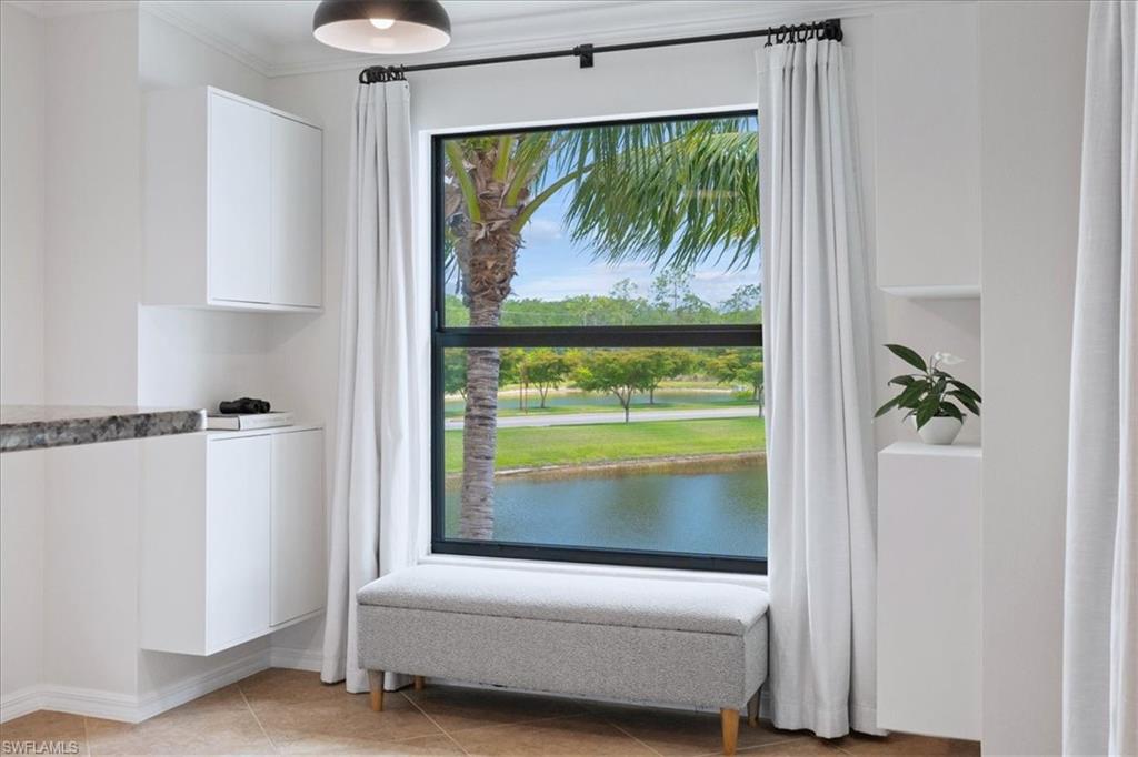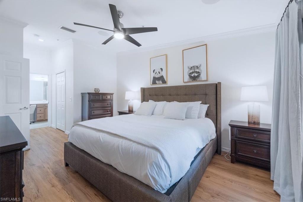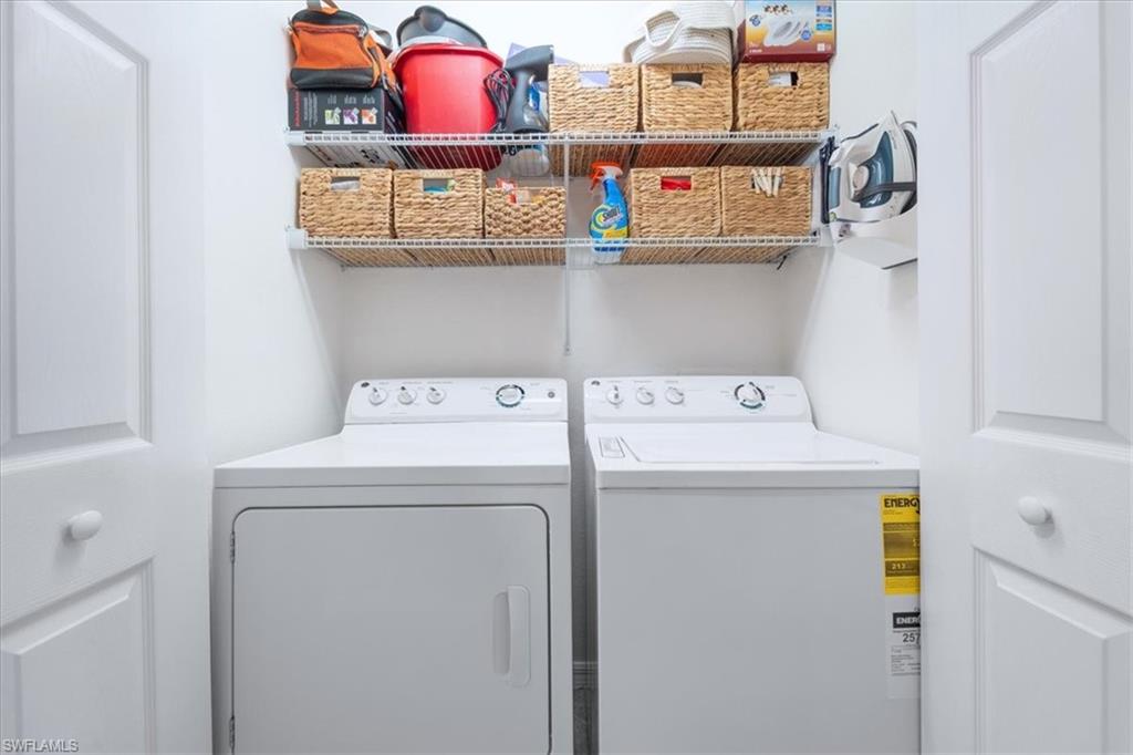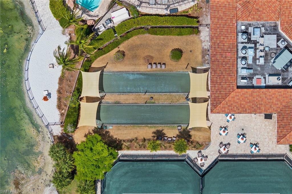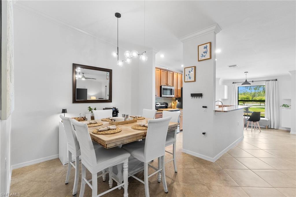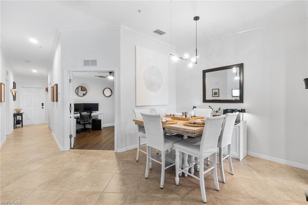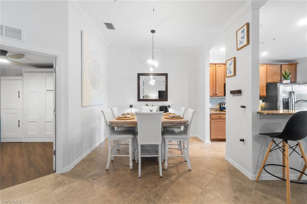 This social membership two-bedroom plus den, two bath features the Diangelo floor plan and includes an incredible and rarely available southern exposure view in the heart of Treviso Bay. Enter the top-floor residence through the spacious front screened Veranda to find extra-high ceilings and a unique blend of elegance and functionality. The wide-open floor plan of this popular model is ideal for entertaining and family living. The open concept flows from kitchen/breakfast nook to dining room and living room, creating one extra-large space. Accentuated by soaring ceilings and wide-line crown molding, it's ideal for hosting parties, movie nights and culinary adventures. Updated LED lighting fixtures and ceiling fans add a touch of contemporary style. For tech lovers, this condominium has been wired post-construction to support four rooms of in-ceiling speaker pairs and 15+ Cat6 data, security and wireless access point location drops, including the repainted and epoxy-coated detached garage. The den is a versatile space, featuring a queen-sized built-in Murphy bed with spacious storage for office supplies and linens and added crown molding, making it ideal for guests and a home office setup. Plus, enjoy the comfort of tastefully done wood-toned flooring in both bedrooms and the den. The kitchen features modern stainless steel GE appliances with a new dishwasher and tiled backsplash. The southern exposure fills the main living area with natural light all day long and the 24-by-12-inch tiled and super-screened back lanai provides a tranquil outdoor retreat where one can gaze at a pristine preserve, open skies and multiple lake water views. Don't miss your chance to own this exceptional condominium offering luxury, comfort and modern convenience in one of the sought-after Naples communities. Conveniently situated, a brief stroll leads to eight pickleball courts one way, and Villa Rilassare the other direction, which offers a host of elite amenities including a resort-style pool featuring cascading waterfalls, eight Har-Tru tennis courts with league play and pro instruction, poolside bar and dining options fully renovated March 2025, rejuvenating spa facilities, as well as tennis and bocce ball courts, elaborate fitness and aerobics facilities, saunas and steam rooms. World-class dining is enjoyed on the 18-hole TPC championship golf course grounds at the opulent clubhouse with an array of social activities on the calendar. Golf is available to social members of Treviso Bay from May to October. Ideally just five miles from vibrant downtown area of Olde Naples and in proximity to pristine beaches of Naples and Marco Island, this residence epitomizes sophisticated coastal living at its finest.