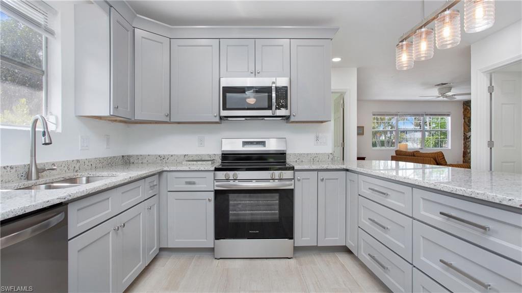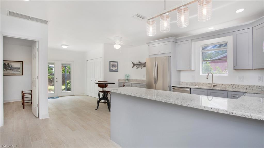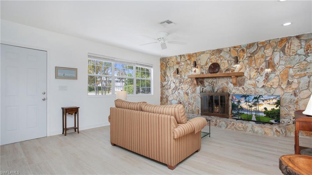 Welcome to the charming and hidden gem of Gulf Harbor, a boating community nestled in North Naples. This delightful 3-bedroom, 2-bath single-family home offers a unique lifestyle with no HOA fees or restrictions, ensuring freedom and flexibility for its residents. The property is perfectly situated just half a mile from the Cocohatchee Marina, where you'll find a convenient public boat ramp, making it an ideal location for boating enthusiasts. Lovingly maintained by the original owners, this home has undergone a recent transformation, showcasing a remodeled interior with modern touches. Step inside to find plank tile flooring throughout, new cabinets and countertops in the kitchen, all adorned with the latest coastal decor. Both bathrooms have been thoughtfully updated, featuring new cabinets, counters and elegant stand-up showers with glass doors. The addition of ample recessed lighting creates a bright and inviting atmosphere throughout the home. The main living area is a cozy retreat, boasting a true wood-burning fireplace and a striking stone wall accent, perfect for relaxing evenings. Outside the partially fenced backyard offers privacy and includes a shed for all your storage needs. The community does offer boat docks for lease at very reasonable rates if you are a member of the voluntary HOA...call for details. Don’t miss out on this fantastic opportunity to live in a vibrant community without the constraints of an HOA.