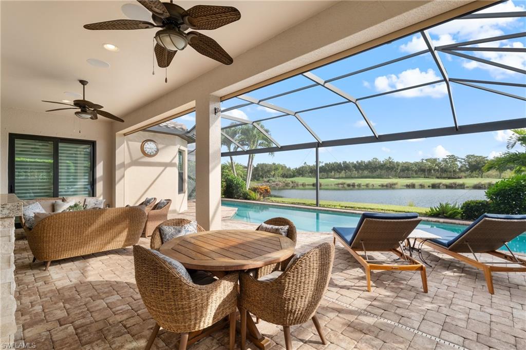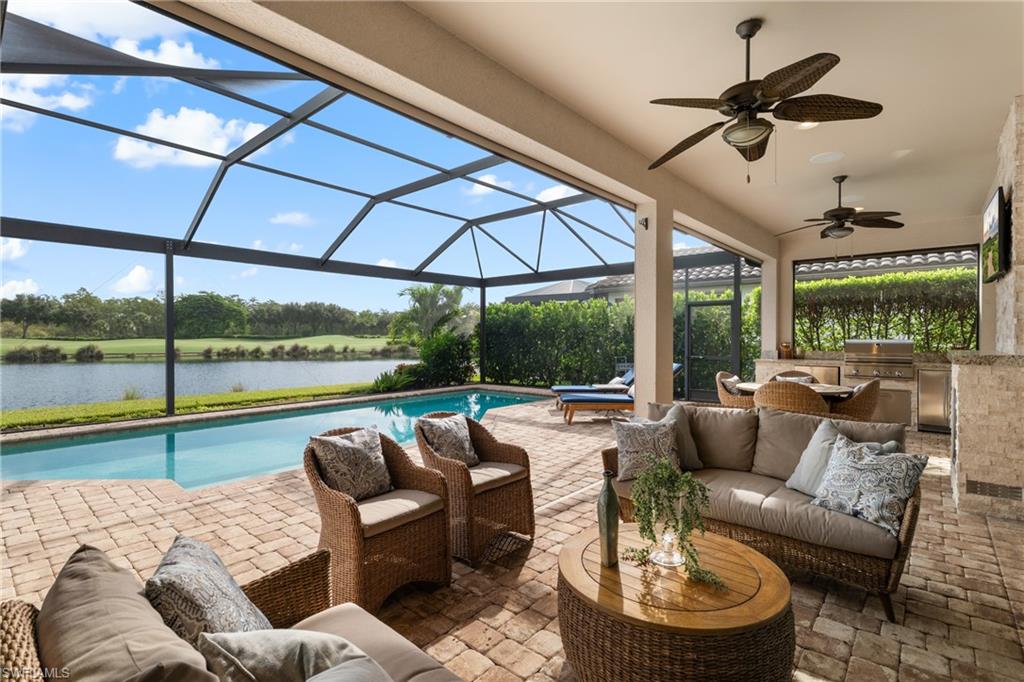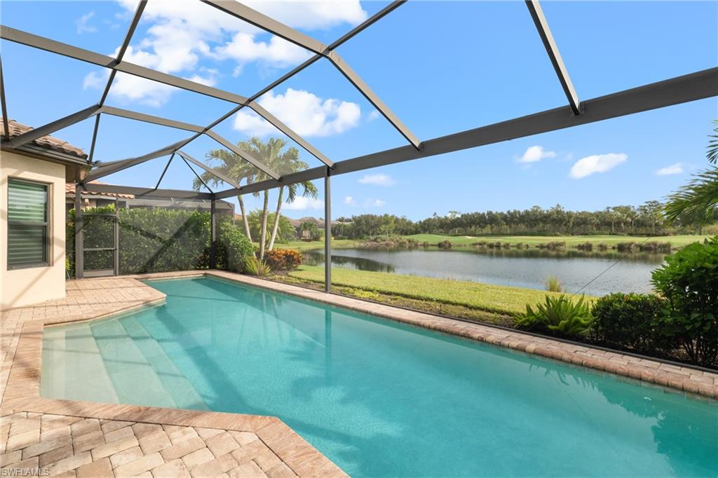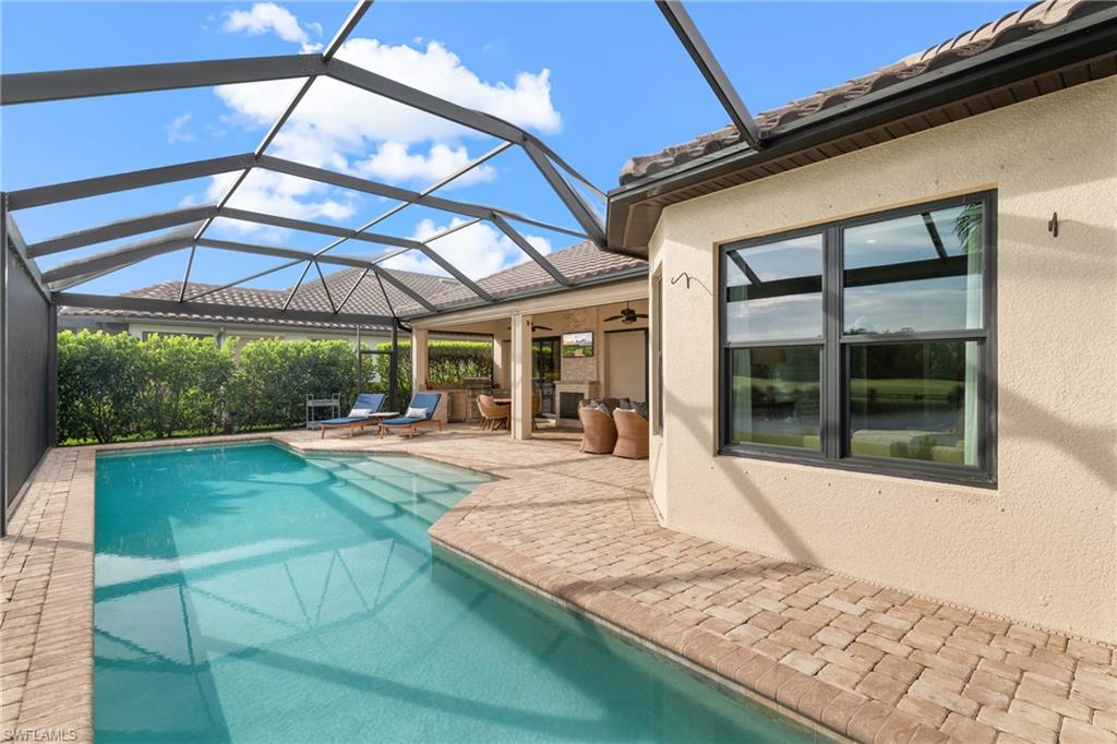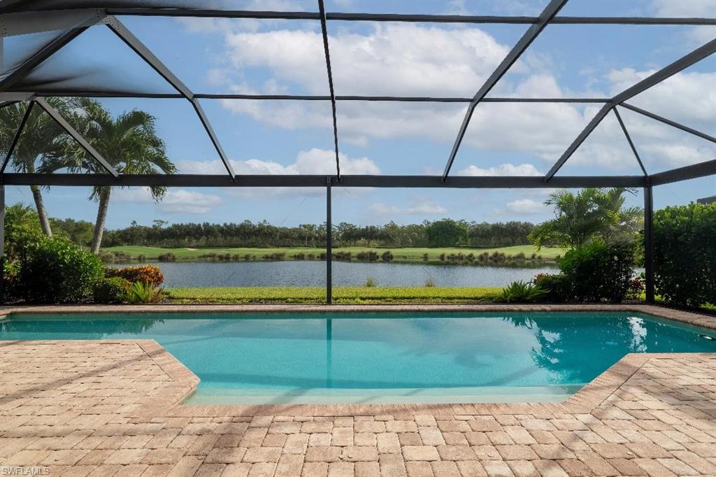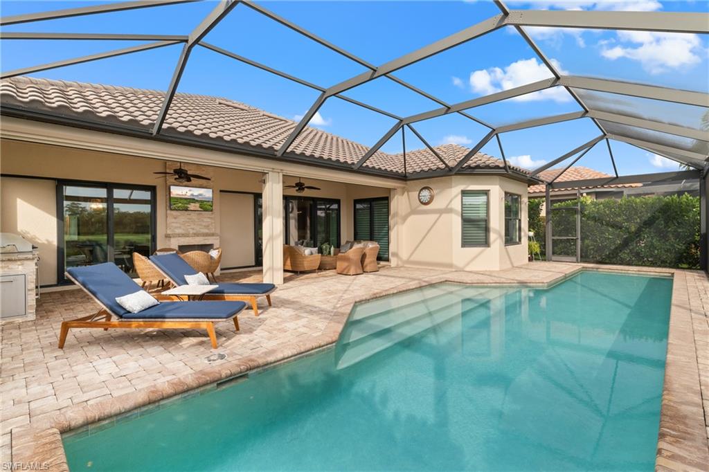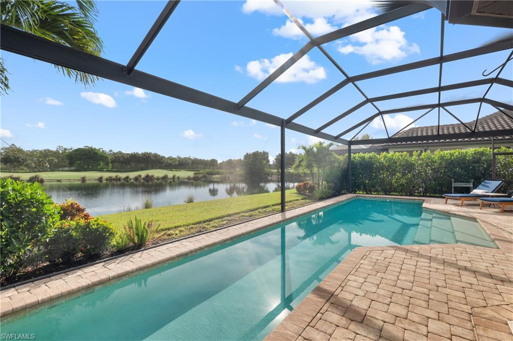THIS HOME HAS IT ALL! STUNNING VIEWS, FULL GOLF MEMBERSHIP, and being offered FURNISHED! Incredible long lake and golf course views set the stage for this exquisite “Carrera” model home, being offered fully furnished for a seamless move-in experience. Perfectly positioned on a premium lot with unobstructed views of the 9th fairway/green & natural preserve, this residence offers unmatched privacy with no other homes in direct sight—all just a short walk to the golf practice facilities & the community’s vibrant amenity campus. Lovingly maintained by its owners, this 2483 Square Foot home features 3 bedrooms, 2.5 baths, and an extended two-car garage with ample space to accommodate both vehicles and a golf cart. Sophistication meets strength with hurricane-impact windows and doors, complemented by electric hurricane shutters on the lanai for added peace of mind. The outdoor living space is nothing short of extraordinary, showcasing an expansive saltwater gas-heated lap pool stretching 42 feet, bathed in sun throughout the day and framed by a beautiful screen enclosure. An outdoor kitchen and fireplace (installed 2 years ago) elevate the setting, ideal for entertaining or simply unwinding in complete luxury. Inside, soaring 12 foot ceilings and 8-foot doors enhance the open design, while two sets of pocket sliding glass doors create a seamless flow between indoor and outdoor living. The chef’s kitchen features an expanded layout with a gas cooktop and high-end finishes that cater to both casual dining and gourmet entertaining. Additional enhancements include a whole-house water filtration system, an AIR CONDITIONED GARAGE with ceiling storage, professionally designed landscaping with accent lighting, an indoor/outdoor SONOS system with mounted TVs, CUSTOM CLOSETS built-ins, and meticulously curated furnishings and décor. Together, these upgrades reflect an additional investment of more than $100,000 over the past two years, further elevating the home’s sophistication and comfort. Perfectly positioned on a QUITE STREET just steps from the community mailboxes, this residence embodies a seamless blend of refined elegance and modern luxury. As a resident of Esplanade, you'll enjoy an unmatched lifestyle with access to world-class amenities, including a championship golf course, state-of-the-art clubhouse, resort-style pool with food and beverage service, private cabanas, tennis and pickleball courts, walking and biking trails, a dog park, fitness center, full-service salon and spa, wellness center, tiki bar, and more. Ideally located in North Naples, Esplanade Golf & Country Club offers convenient access to I-75, the airport, top-rated restaurants, premier shopping, and the stunning beaches of the Gulf Coast. Known for its vibrant, active social scene, the community delivers the perfect blend of luxury, recreation, and lifestyle. Don’t miss the opportunity to make this exceptional home yours—and start living the Esplanade dream.