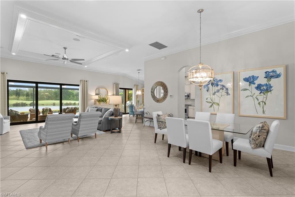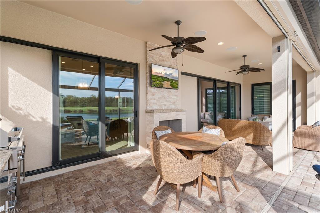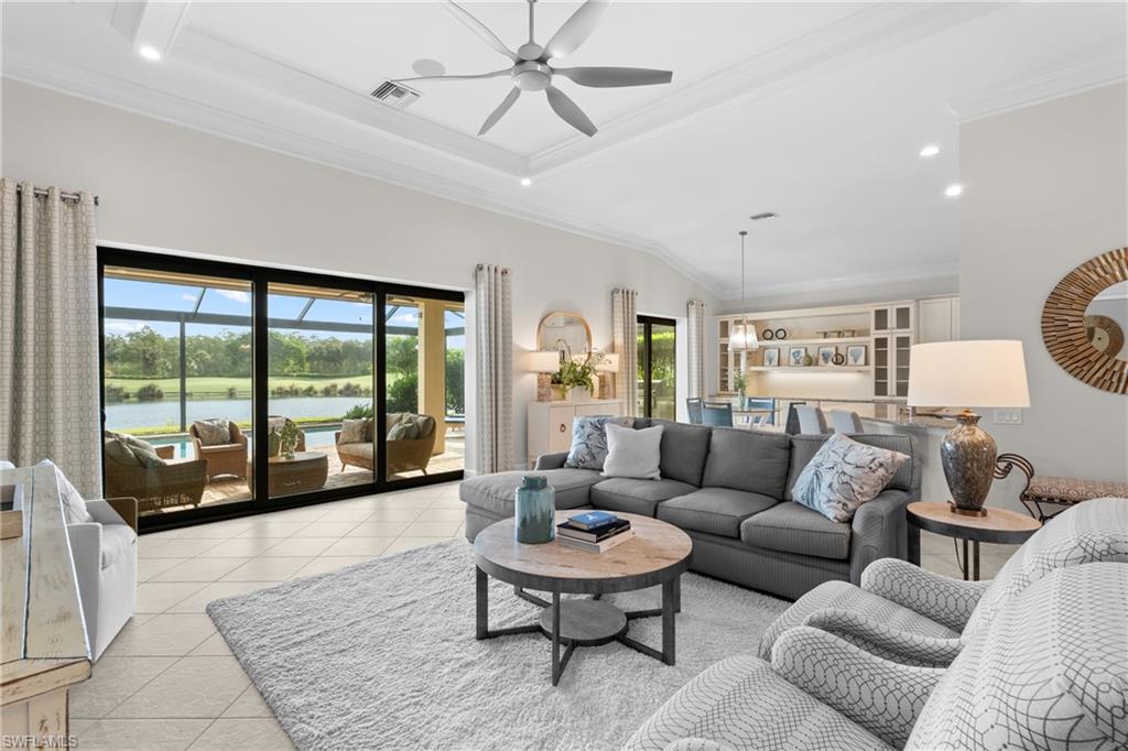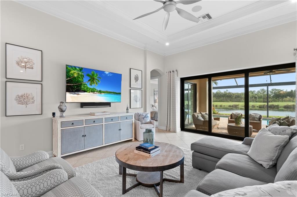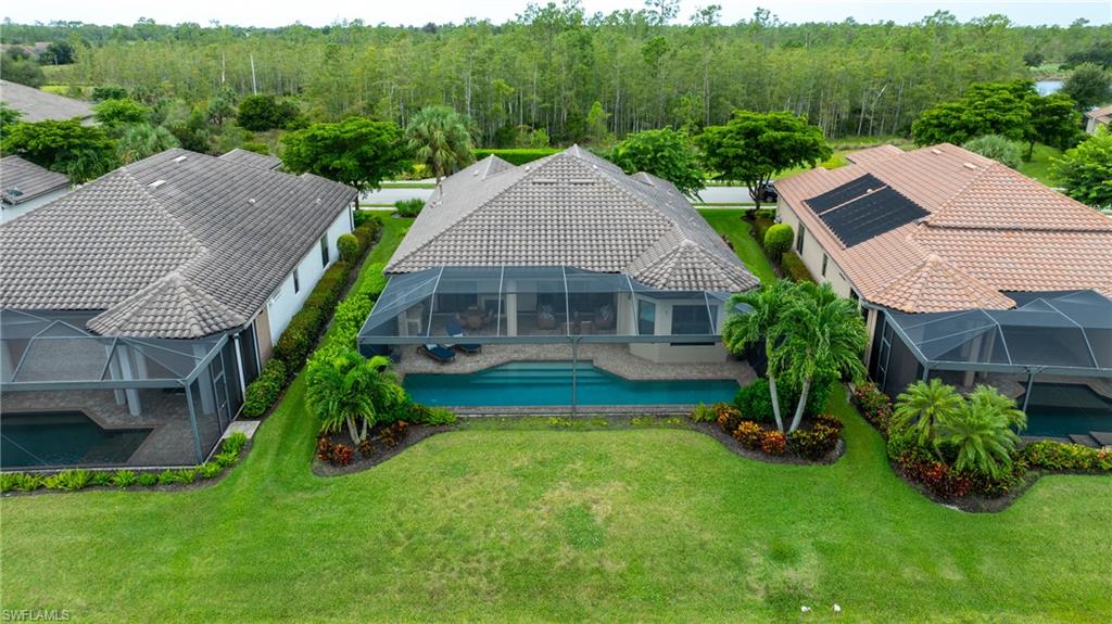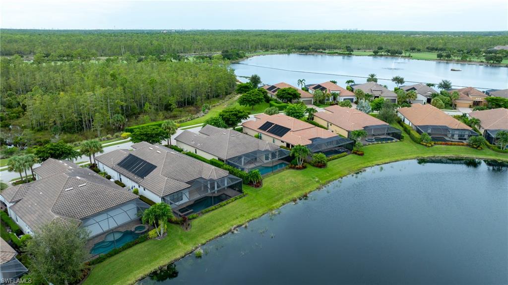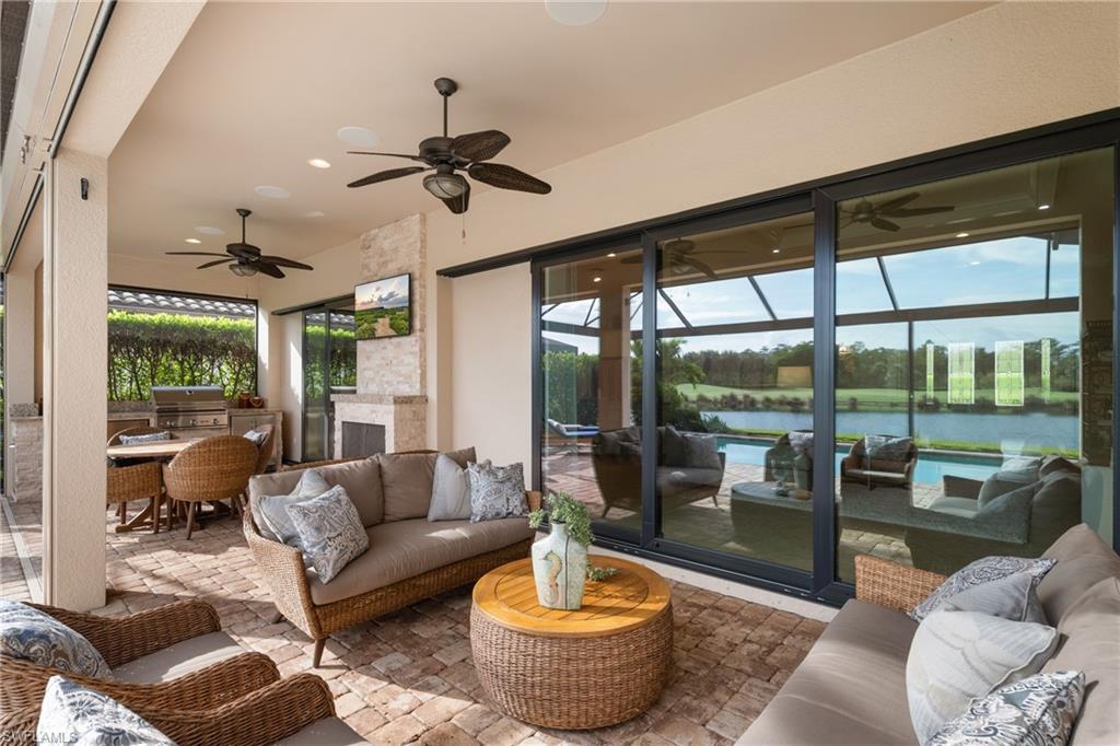 THIS HOME HAS IT ALL! STUNNING VIEWS, FULL GOLF MEMBERSHIP, and being offered FURNISHED! Incredible long lake and golf course views set the stage for this exquisite “Carrera” model home, being offered fully furnished for a seamless move-in experience. Perfectly positioned on a premium lot with unobstructed views of the 9th fairway/green & natural preserve, this residence offers unmatched privacy with no other homes in direct sight—all just a short walk to the golf practice facilities & the community’s vibrant amenity campus. Lovingly maintained by its owners, this 2483 Square Foot home features 3 bedrooms, 2.5 baths, and an extended two-car garage with ample space to accommodate both vehicles and a golf cart. Sophistication meets strength with hurricane-impact windows and doors, complemented by electric hurricane shutters on the lanai for added peace of mind. The outdoor living space is nothing short of extraordinary, showcasing an expansive saltwater gas-heated lap pool stretching 42 feet, bathed in sun throughout the day and framed by a beautiful screen enclosure. An outdoor kitchen and fireplace (installed 2 years ago) elevate the setting, ideal for entertaining or simply unwinding in complete luxury. Inside, soaring 12 foot ceilings and 8-foot doors enhance the open design, while two sets of pocket sliding glass doors create a seamless flow between indoor and outdoor living. The chef’s kitchen features an expanded layout with a gas cooktop and high-end finishes that cater to both casual dining and gourmet entertaining. Additional enhancements include a whole-house water filtration system, an AIR CONDITIONED GARAGE with ceiling storage, professionally designed landscaping with accent lighting, an indoor/outdoor SONOS system with mounted TVs, CUSTOM CLOSETS built-ins, and meticulously curated furnishings and décor. Together, these upgrades reflect an additional investment of more than $100,000 over the past two years, further elevating the home’s sophistication and comfort. Perfectly positioned on a QUITE STREET just steps from the community mailboxes, this residence embodies a seamless blend of refined elegance and modern luxury. As a resident of Esplanade, you'll enjoy an unmatched lifestyle with access to world-class amenities, including a championship golf course, state-of-the-art clubhouse, resort-style pool with food and beverage service, private cabanas, tennis and pickleball courts, walking and biking trails, a dog park, fitness center, full-service salon and spa, wellness center, tiki bar, and more. Ideally located in North Naples, Esplanade Golf & Country Club offers convenient access to I-75, the airport, top-rated restaurants, premier shopping, and the stunning beaches of the Gulf Coast. Known for its vibrant, active social scene, the community delivers the perfect blend of luxury, recreation, and lifestyle. Don’t miss the opportunity to make this exceptional home yours—and start living the Esplanade dream.