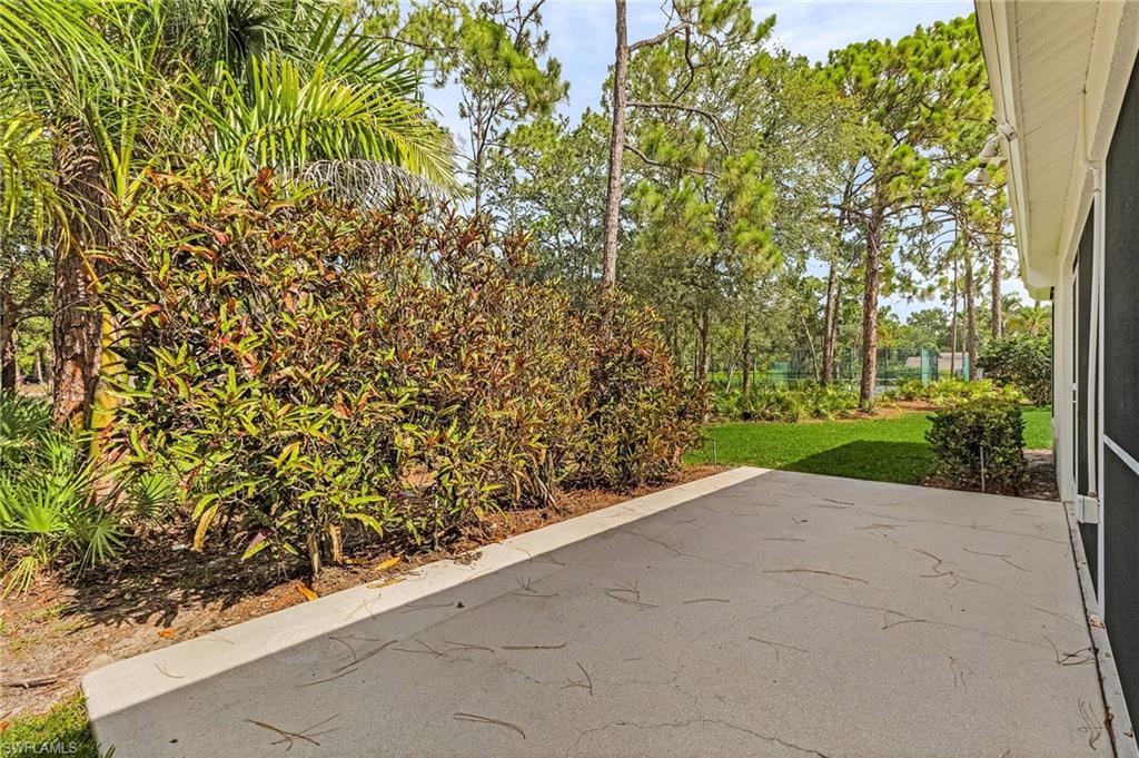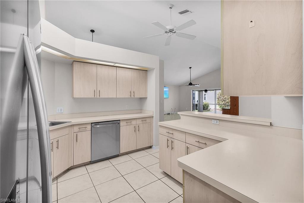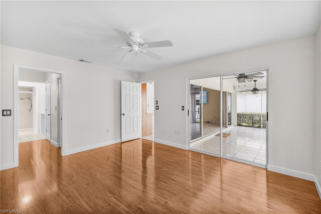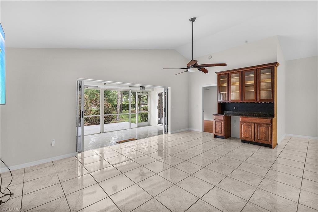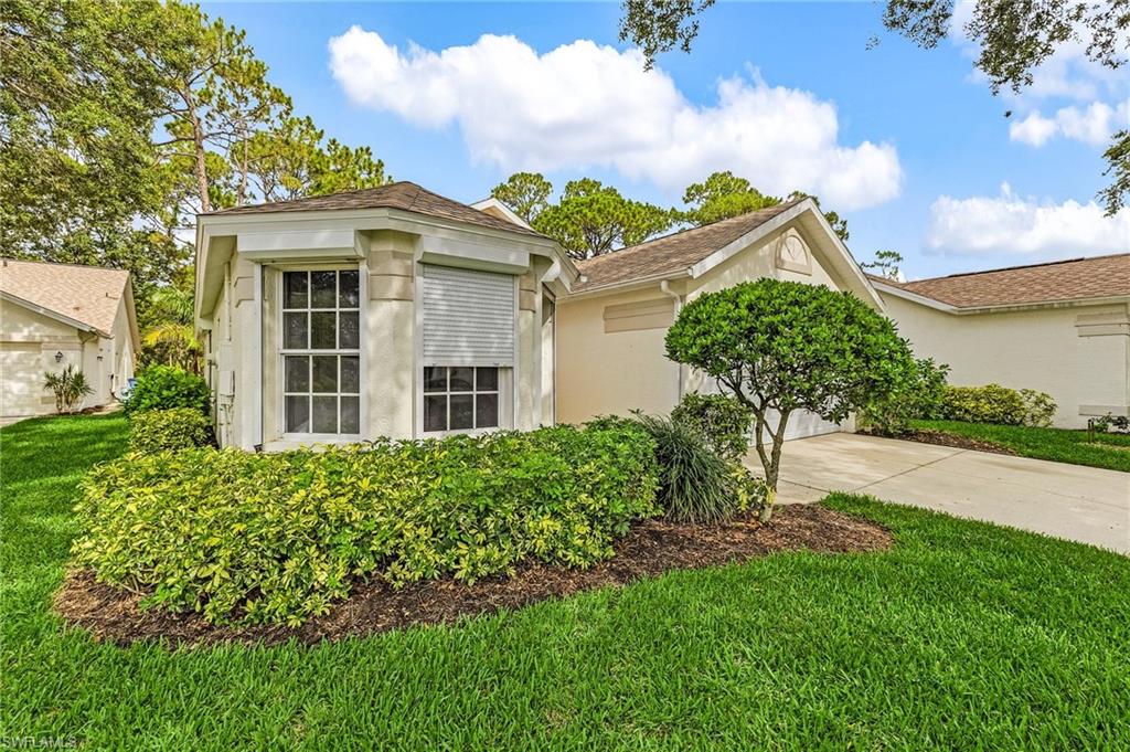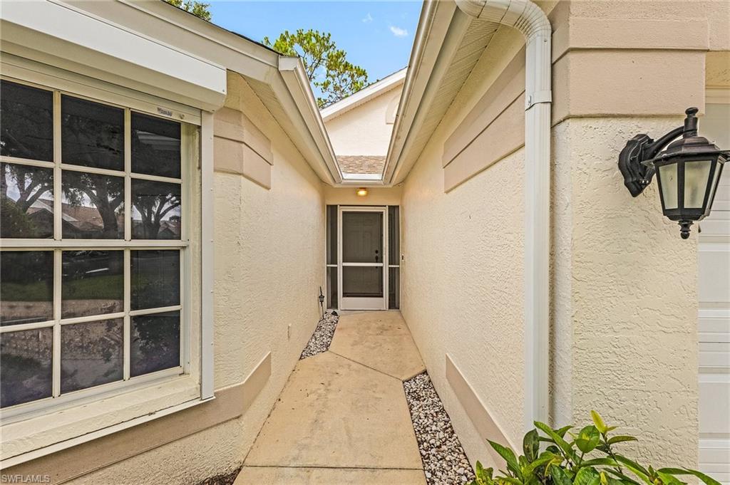 Fairway Dunes is a highly sought-after, special gem of a community in Bonita Springs convenient to shopping, dining, RSW airport and area beaches. Whether you're seeking a home for seasonal or year-round living, this 3 bedroom, 2 bath bungalow in paradise is it! The house was just re-plumbed, the interior of the entire home has been freshly painted with Sherwin Williams paint throughout, and has undergone a thorough deep cleaning including power washing the exterior. The home has tile throughout the main living area, gorgeous engineered wood flooring in the primary bedroom, and plush new carpet in the guest bedrooms. The kitchen features stainless steel appliances and a skylight that adds an abundance of natural light. The great room features a beautiful custom built dry bar with room for a beverage refrigerator, and large wall-mounted TV. The guest bathroom has recently been updated with a glass enclosed walk-in shower with river stone tile floor, new raised vanity with modern mirror., and a new comfort-height toilet. The spacious primary bedroom offers ample storage with two closets, an en-suite bathroom with a raised wooden vanity with a solid-surface counter top and dual sinks, and walk-in glass-enclosed shower. The HVAC was replaced in 2018. Air conditioned garage. The private back lanai offers a peaceful landscaped view and has electric storm shutters. Fairway Dunes is a friendly and socially active community with clubhouse, heated pool and tennis courts.