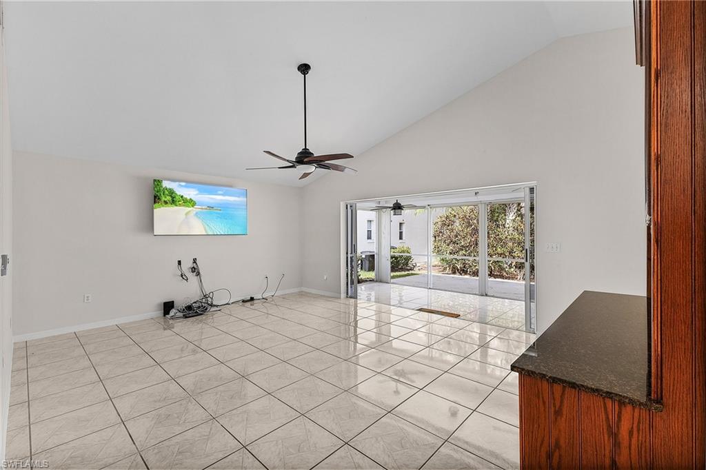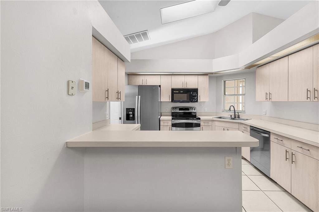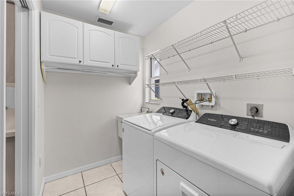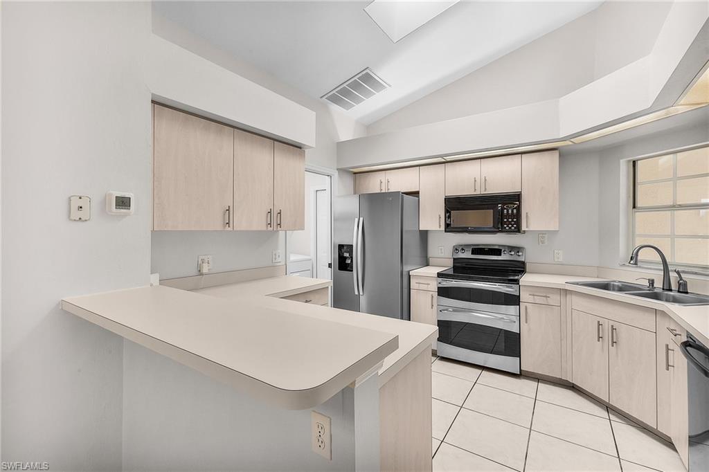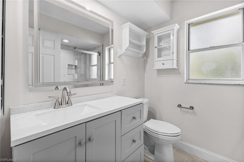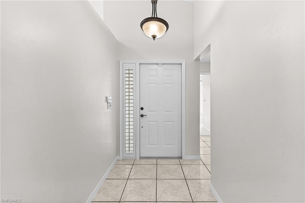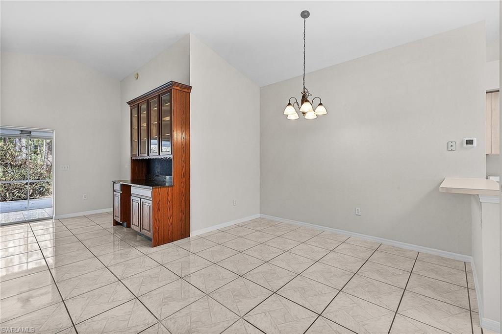 Fairway Dunes is a highly sought-after, special gem of a community in Bonita Springs convenient to shopping, dining, RSW airport and area beaches. Whether you're seeking a home for seasonal or year-round living, this 3 bedroom, 2 bath bungalow in paradise is it! The house was just re-plumbed, the interior of the entire home has been freshly painted with Sherwin Williams paint throughout, and has undergone a thorough deep cleaning including power washing the exterior. The home has tile throughout the main living area, gorgeous engineered wood flooring in the primary bedroom, and plush new carpet in the guest bedrooms. The kitchen features stainless steel appliances and a skylight that adds an abundance of natural light. The great room features a beautiful custom built dry bar with room for a beverage refrigerator, and large wall-mounted TV. The guest bathroom has recently been updated with a glass enclosed walk-in shower with river stone tile floor, new raised vanity with modern mirror., and a new comfort-height toilet. The spacious primary bedroom offers ample storage with two closets, an en-suite bathroom with a raised wooden vanity with a solid-surface counter top and dual sinks, and walk-in glass-enclosed shower. The HVAC was replaced in 2018. Air conditioned garage. The private back lanai offers a peaceful landscaped view and has electric storm shutters. Fairway Dunes is a friendly and socially active community with clubhouse, heated pool and tennis courts.