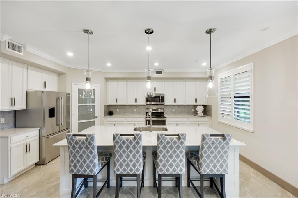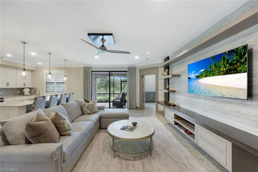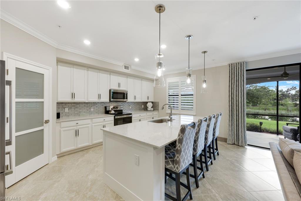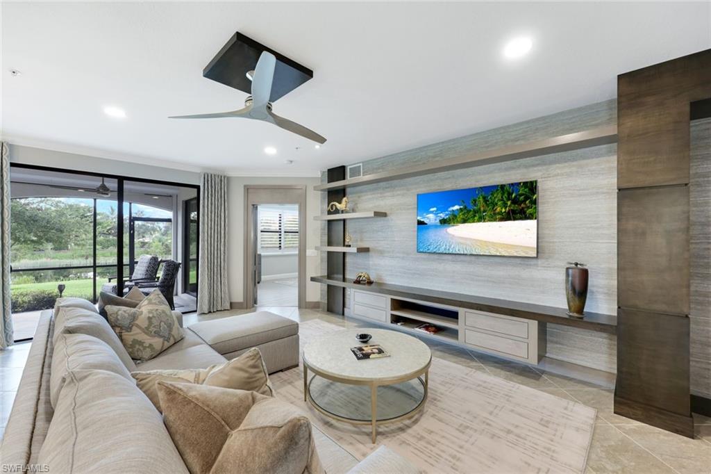 Experience the perfect blend of New York City sophistication and Florida golf and country club living in this luxurious 3-bedroom coach home, beautifully designed to reflect the ambiance of a contemporary NYC condominium. Located within the prestigious Bonita National Golf and Country Club, this home features unparalleled design and high-end finishes. Highlights include new flooring in all bedrooms, plantation shutters throughout, Storm Smart hurricane shutters, and custom millwork, including ceiling plinth blocks and custom door frames. The great room showcases Thibaut Elitas designer wall coverings and custom built-ins. The spacious kitchen offers new sinks and faucets, roll-out drawers, a Bosch fridge, and a stylish tile backsplash, along with upgraded lighting throughout, including additional recessed lights in the primary bedroom and great room, as well as ceiling art spotlights. This stunning home is being offered turnkey, complete with high-end designer furniture from brands like Bernhardt, Jessica Charles, Currey & Co., Marge Carson, Massoud, and Arteriors. The garage is equally impressive, featuring an insulated door for vehicle protection and interior cooling, additional electrical outlets, a ceiling fan, overhead storage, and custom epoxy flooring and molding. Conveniently located, you are just moments away from sandy Gulf beaches, downtown Naples, and have easy access to I-75, RSW Airport, and the River District in Fort Myers. As a social member at Bonita National, you will enjoy access to all amenities except the golf course. Relax at the lagoon pool with a waterfall, poolside cabanas, and a bar/grill. Enjoy swim lanes for water exercise, a full-service spa for post-workout relaxation, and a beautiful clubhouse that offers a restaurant, game rooms, and meeting spaces for social gatherings. Additionally, bocce and pickleball courts will soon be available for even more recreational fun! THIS IS A ONE-OF-A-KIND A TRUE MUST SEE!