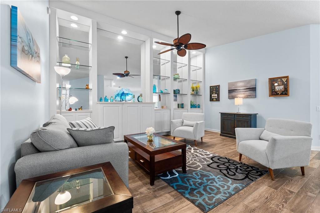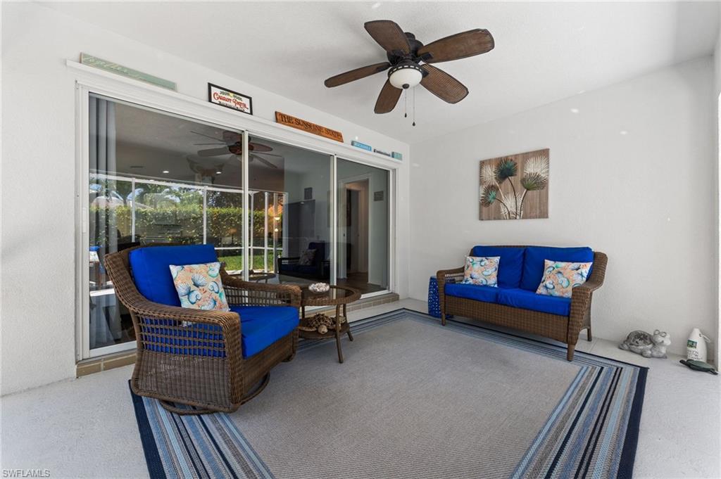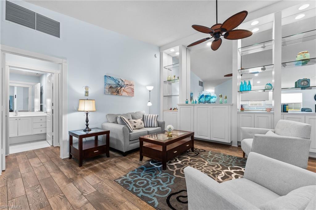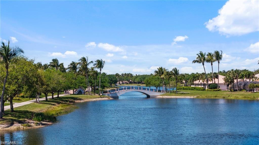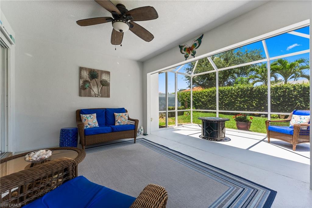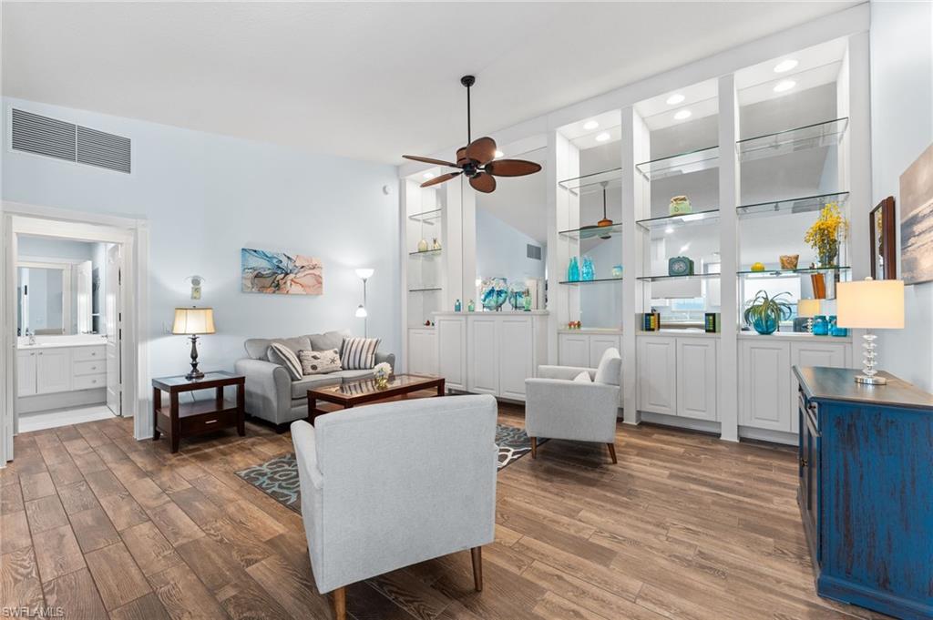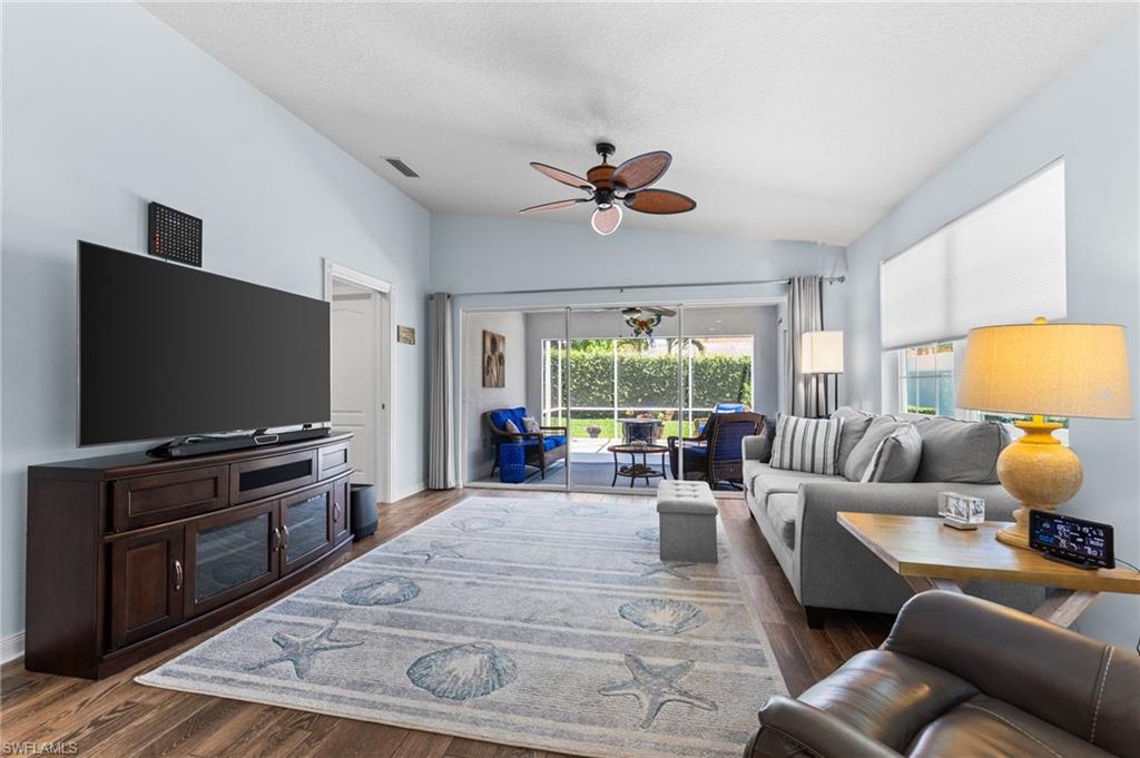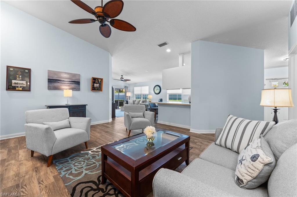 Immaculately maintained and thoughtfully updated, this 2/2 Capri Villa features vaulted ceilings, modern plank tile, open floorplan and split bedrooms with ample space for entertaining. A freshly painted exterior and new landscaping creates a great first impression. Inside, new owners will love the hurricane impact windows and electric hurricane shades along the extended, screened lanai for low maintenance living. The kitchen has been upgraded with white shaker cabinet fronts, and newer appliances. Both bedrooms act as en-suite masters on either side of the home. Fresh interior paint and a popular southern exposure brings ample light into the home. Whole-home charcoal water filter included! Island Walk is a popular neighborhood for seasonal and full-time residents, featuring a guard gated entrance, sprawling clubhouse with activities and huge fitness center, resort style pool, NEW pickleball courts, tennis, mail center, gas station, fantastic restaurant and other essentials! With plenty of walking trails and nature to observe from your new home or while you’re out and about, this community draws you in to enjoy all that Southwest Florida has to offer. Close to popular shops and dining, Mercato, 30 minutes to RSW and just 15 minutes from world class beaches! 2.75% VA loan MAY be assumable. Check with your lender!
