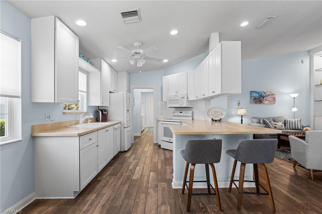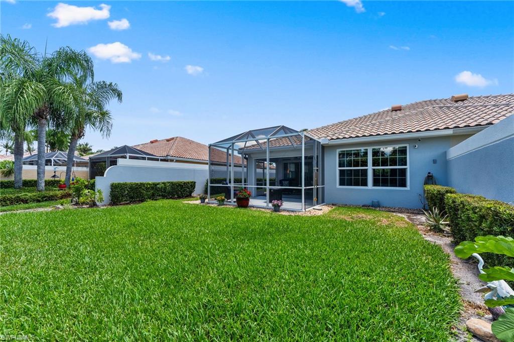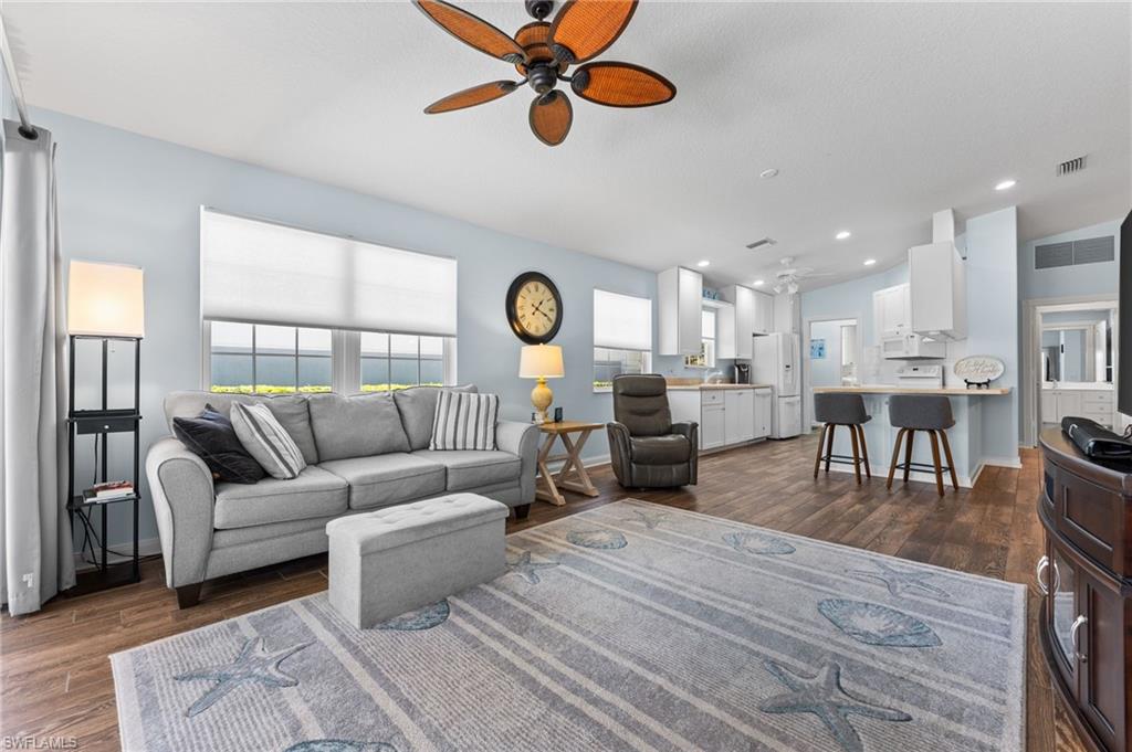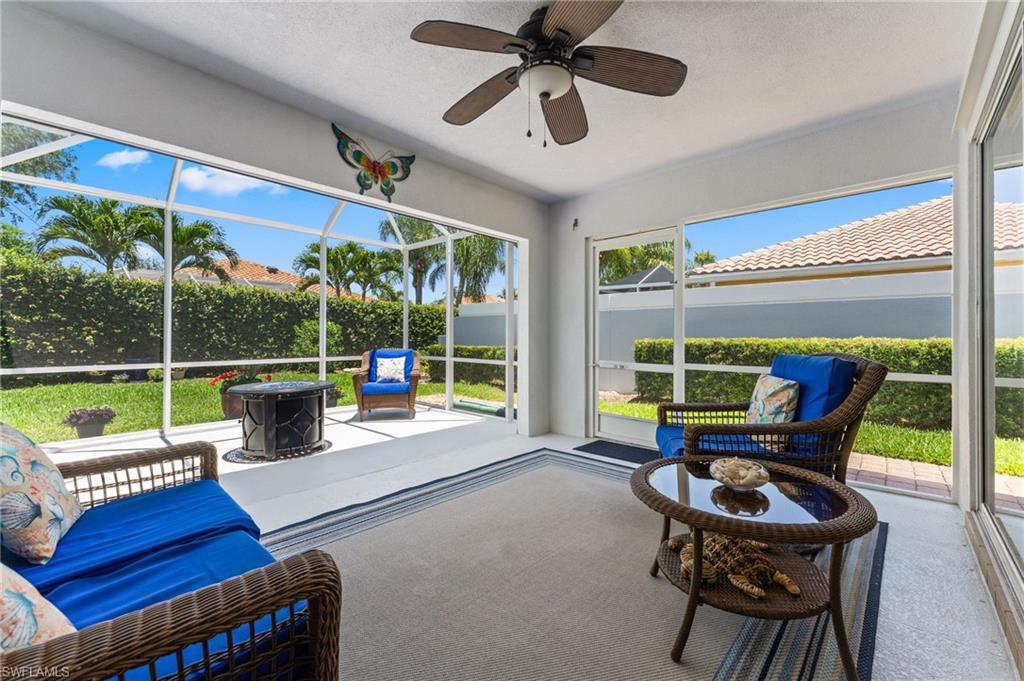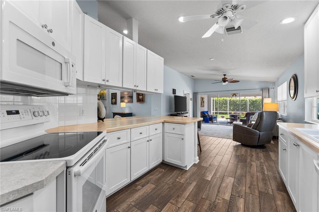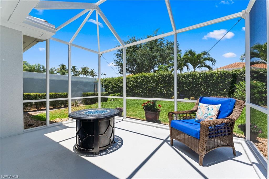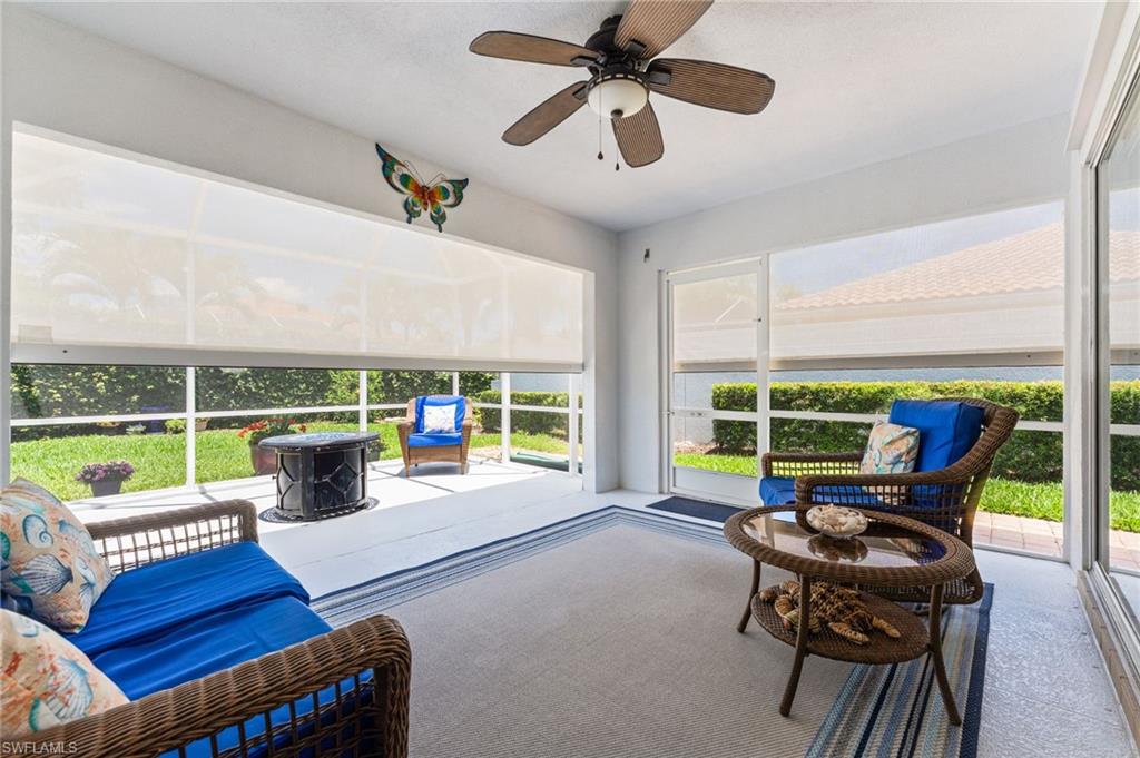 Immaculately maintained and thoughtfully updated, this 2/2 Capri Villa features vaulted ceilings, modern plank tile, open floorplan and split bedrooms with ample space for entertaining. A freshly painted exterior and new landscaping creates a great first impression. Inside, new owners will love the hurricane impact windows and electric hurricane shades along the extended, screened lanai for low maintenance living. The kitchen has been upgraded with white shaker cabinet fronts, and newer appliances. Both bedrooms act as en-suite masters on either side of the home. Fresh interior paint and a popular southern exposure brings ample light into the home. Whole-home charcoal water filter included! Island Walk is a popular neighborhood for seasonal and full-time residents, featuring a guard gated entrance, sprawling clubhouse with activities and huge fitness center, resort style pool, NEW pickleball courts, tennis, mail center, gas station, fantastic restaurant and other essentials! With plenty of walking trails and nature to observe from your new home or while you’re out and about, this community draws you in to enjoy all that Southwest Florida has to offer. Close to popular shops and dining, Mercato, 30 minutes to RSW and just 15 minutes from world class beaches! 2.75% VA loan MAY be assumable. Check with your lender!