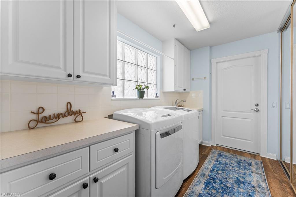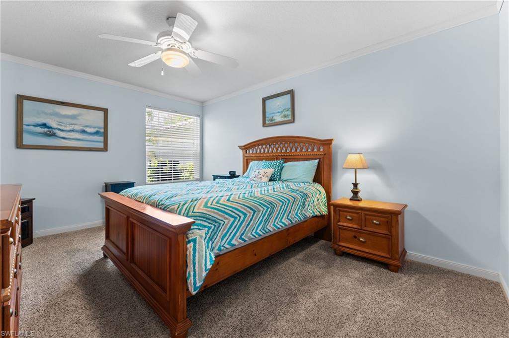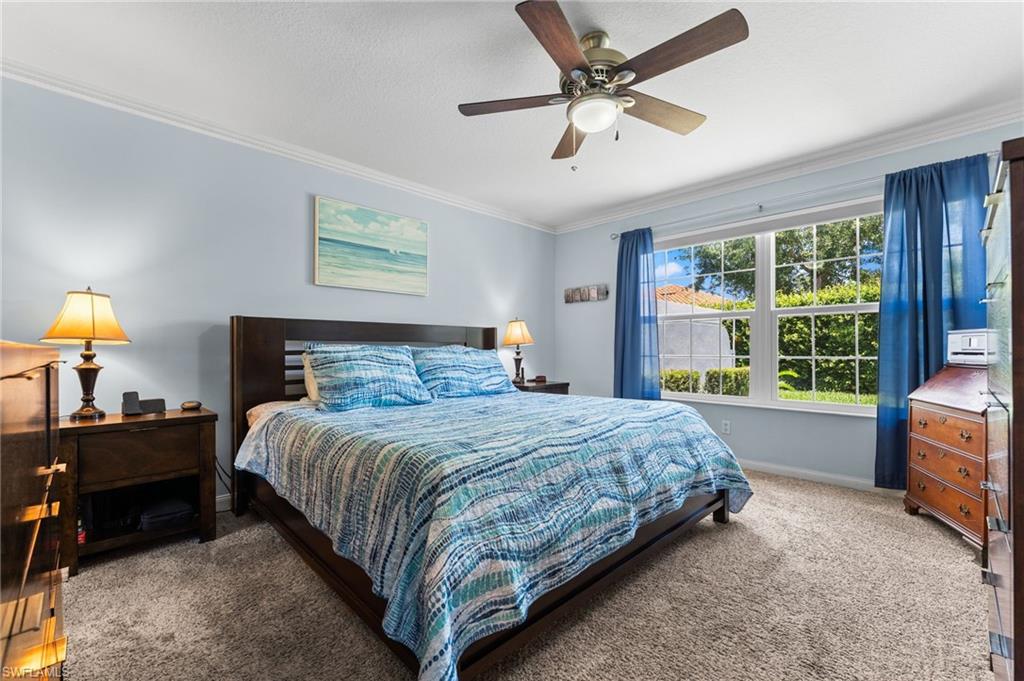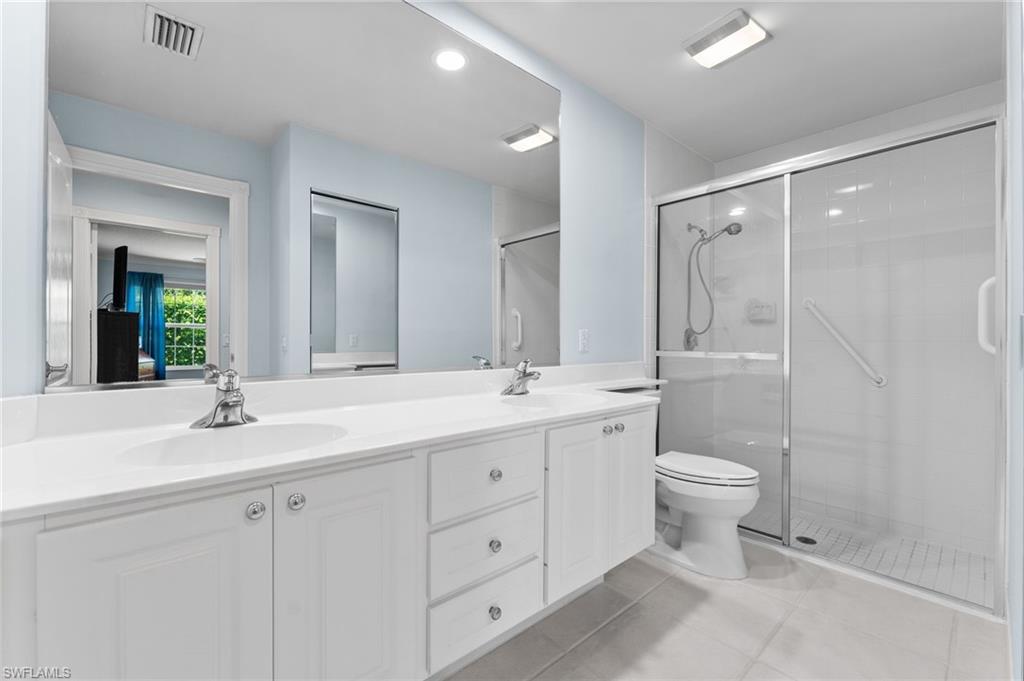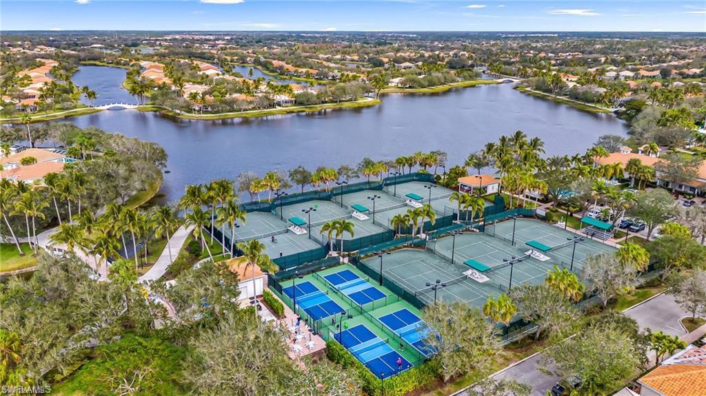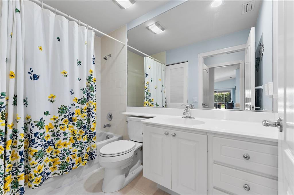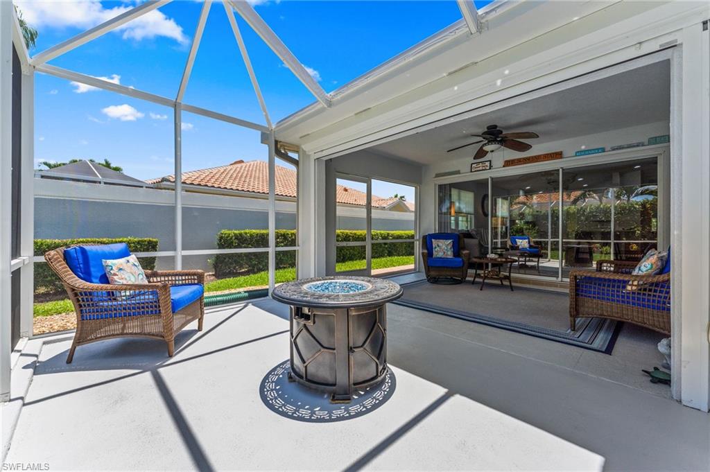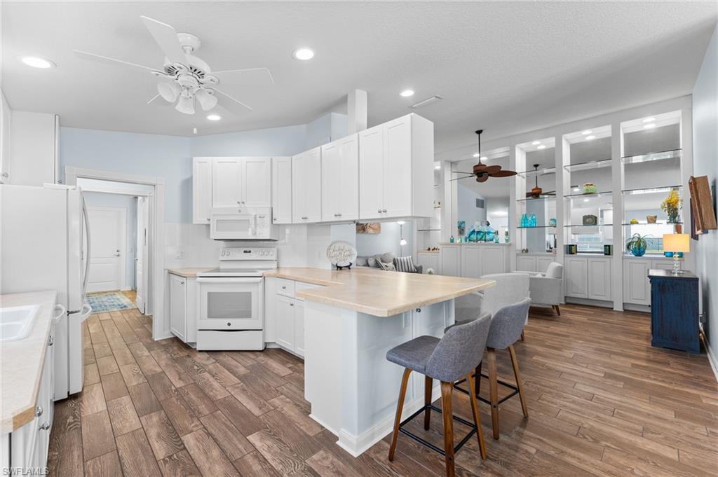 Immaculately maintained and thoughtfully updated, this 2/2 Capri Villa features vaulted ceilings, modern plank tile, open floorplan and split bedrooms with ample space for entertaining. A freshly painted exterior and new landscaping creates a great first impression. Inside, new owners will love the hurricane impact windows and electric hurricane shades along the extended, screened lanai for low maintenance living. The kitchen has been upgraded with white shaker cabinet fronts, and newer appliances. Both bedrooms act as en-suite masters on either side of the home. Fresh interior paint and a popular southern exposure brings ample light into the home. Whole-home charcoal water filter included! Island Walk is a popular neighborhood for seasonal and full-time residents, featuring a guard gated entrance, sprawling clubhouse with activities and huge fitness center, resort style pool, NEW pickleball courts, tennis, mail center, gas station, fantastic restaurant and other essentials! With plenty of walking trails and nature to observe from your new home or while you’re out and about, this community draws you in to enjoy all that Southwest Florida has to offer. Close to popular shops and dining, Mercato, 30 minutes to RSW and just 15 minutes from world class beaches! 2.75% VA loan MAY be assumable. Check with your lender!