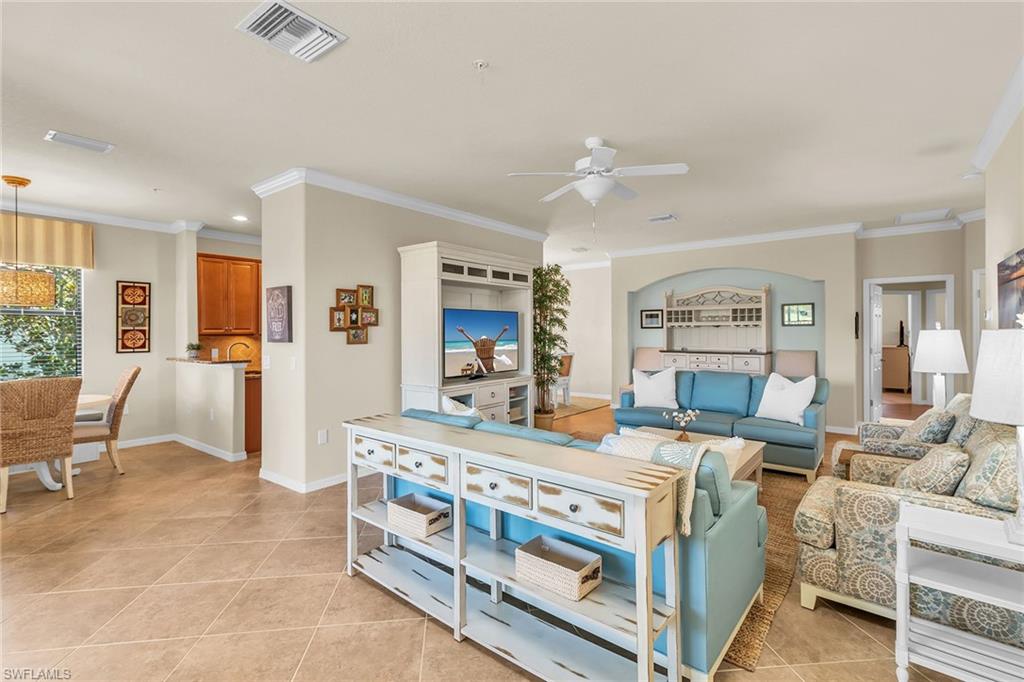 Beautifully furnished, turnkey, second-floor coach home with western exposure and sunsets over the wide lake view from the private lanai. Three bedrooms, three-car tandem garage and open floor plan. Tile floors on the diagonal in main living areas, crown molding, custom light fixtures and neutral decor. Kitchen with granite counters, breakfast bar, gas stove, stainless steel appliances, pantry and breakfast nook. The primary suite includes lanai access, two walk-in closets, bath with dual sinks, tile shower and tub. The split floor plan includes two bedrooms with a bath. Laundry room. Impact doors and windows. A life of luxury is ensured in this residence enhanced by the 54,000-square-foot club and spa, full-service spa, fitness center complete with personal trainers and fitness classes, three swimming pools, championship golf courses, bocce, and six tennis courts and pickleball courts with competitive teams. Fiddler's Creek is close to Marco Island Executive Airport, beaches, shopping, restaurants, boating and easy access to Naples 5th Avenue.