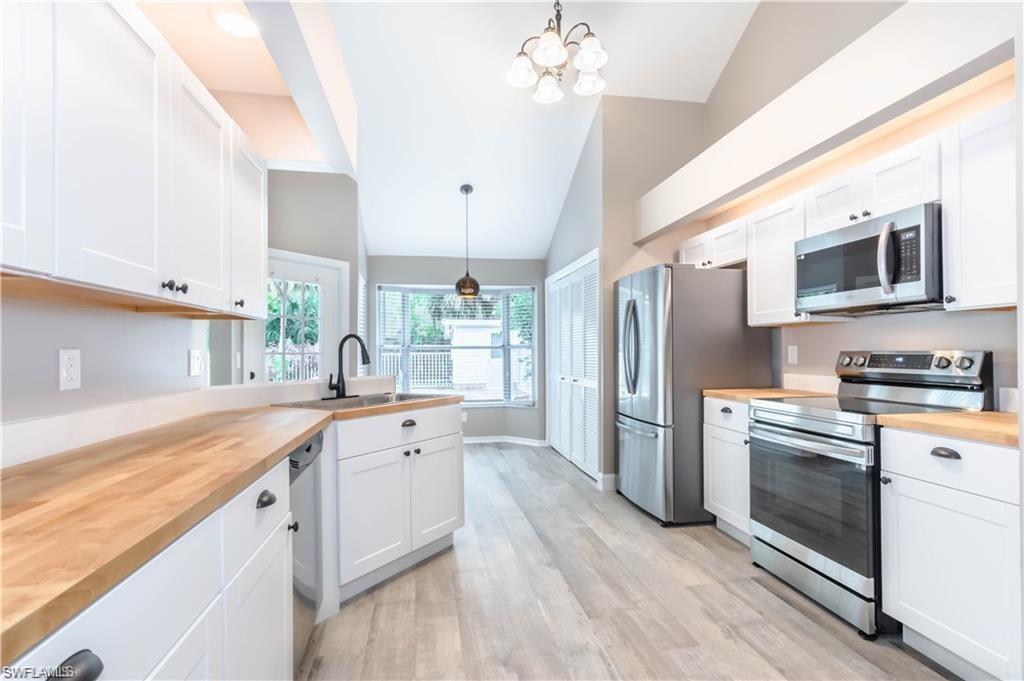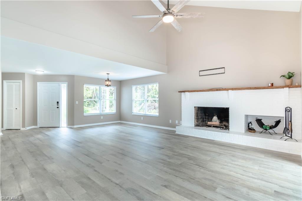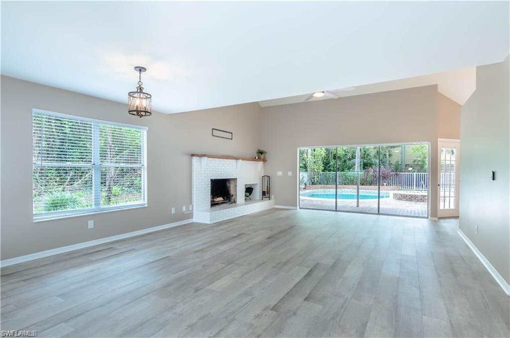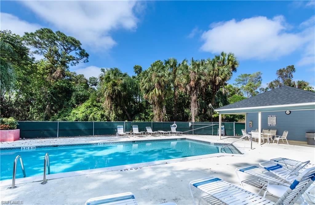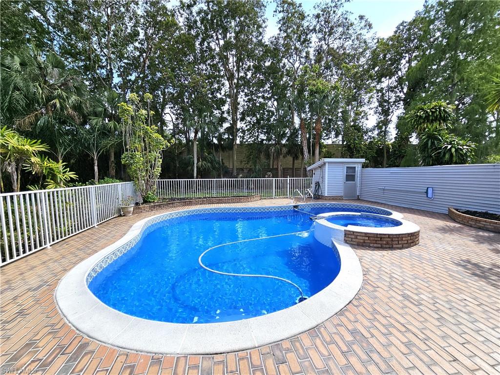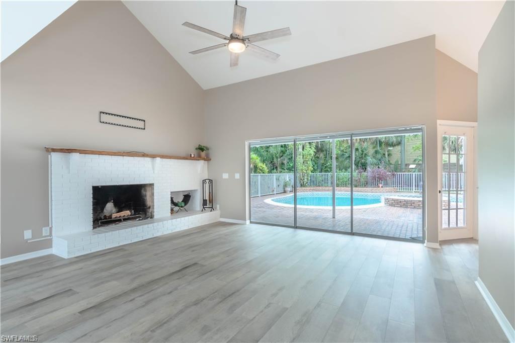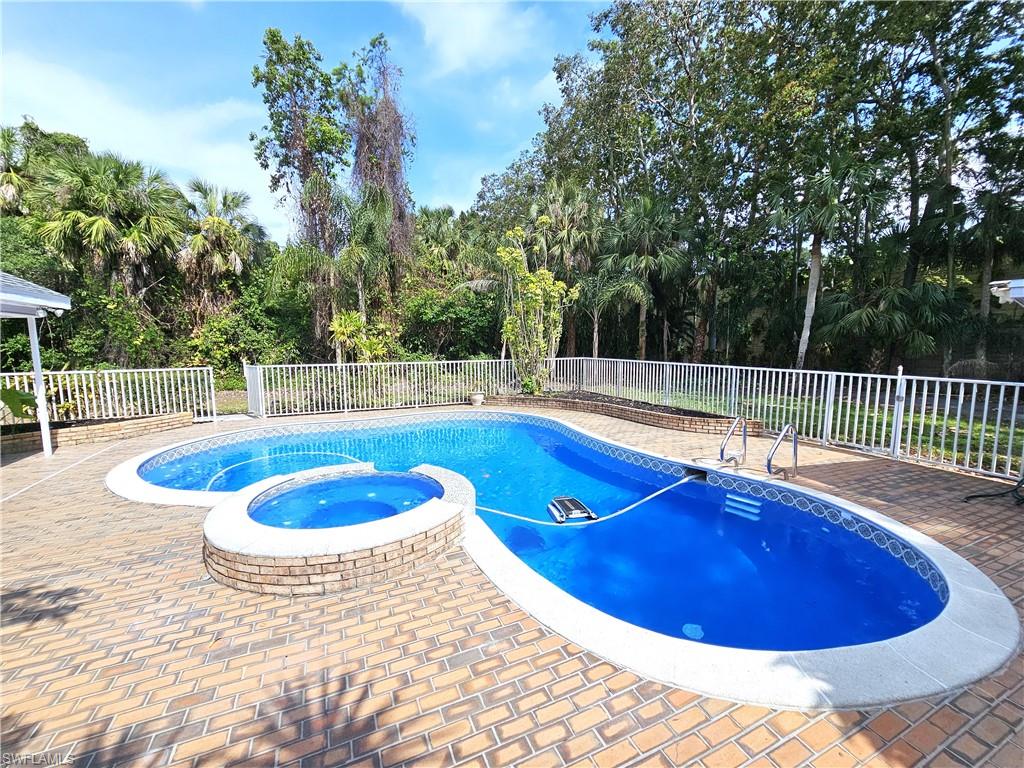 Largest Remodeled Villa in Berkshire Village – Private Pool, Spa & Spacious Garage. Experience the perfect blend of space, privacy, and style in the largest villa in Berkshire Village. This fully remodeled 3-bedroom, 4-bath home is tucked beside a tranquil preserve and features an oversized resurfaced pool and spa, surrounded by tropical landscaping with guava and papaya trees. A poolside cabana bath and outdoor shower complete the ideal outdoor oasis. Inside, the great room centers around a rare wood-burning fireplace, while the sunny breakfast nook and formal dining room offer perfect spaces for everyday living and entertaining. The first-floor master suite includes a walk-in closet, soaking tub, separate shower, and dual vanities. Two additional bedrooms and baths, a charming play nook under the stairs, and updated finishes throughout add comfort and character. Recent upgrades include a new roof, new HVAC system, new appliances, and a fully finished detached two-car garage—ideal for a mechanic, hobbyist, or anyone needing extra workspace. Best of all, this home is not in a flood zone, offering added peace of mind and long-term value. Located just steps from the community heated pool and tennis/pickleball courts, and only minutes from I-75 and downtown Naples, this villa delivers relaxed, resort-style living in one of Southwest Florida’s most convenient and desirable locations.