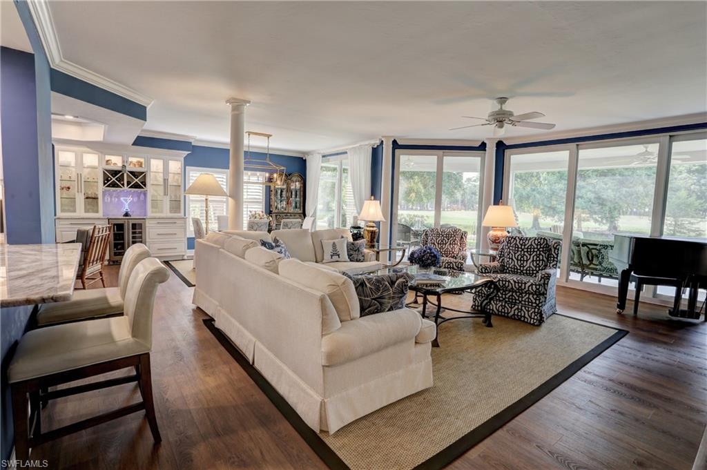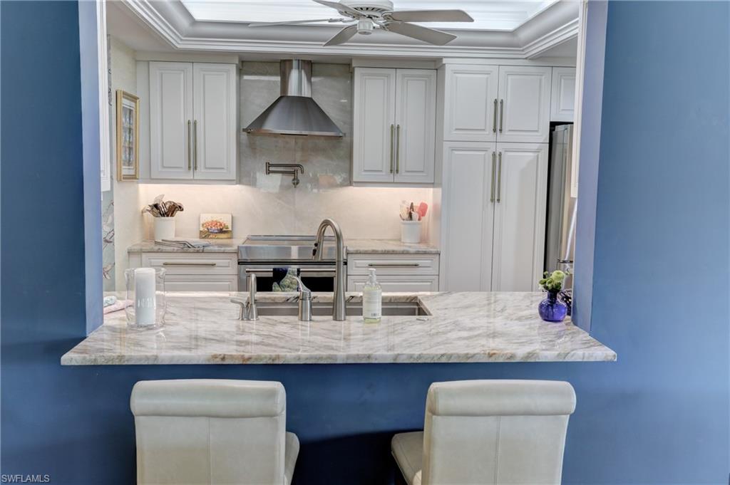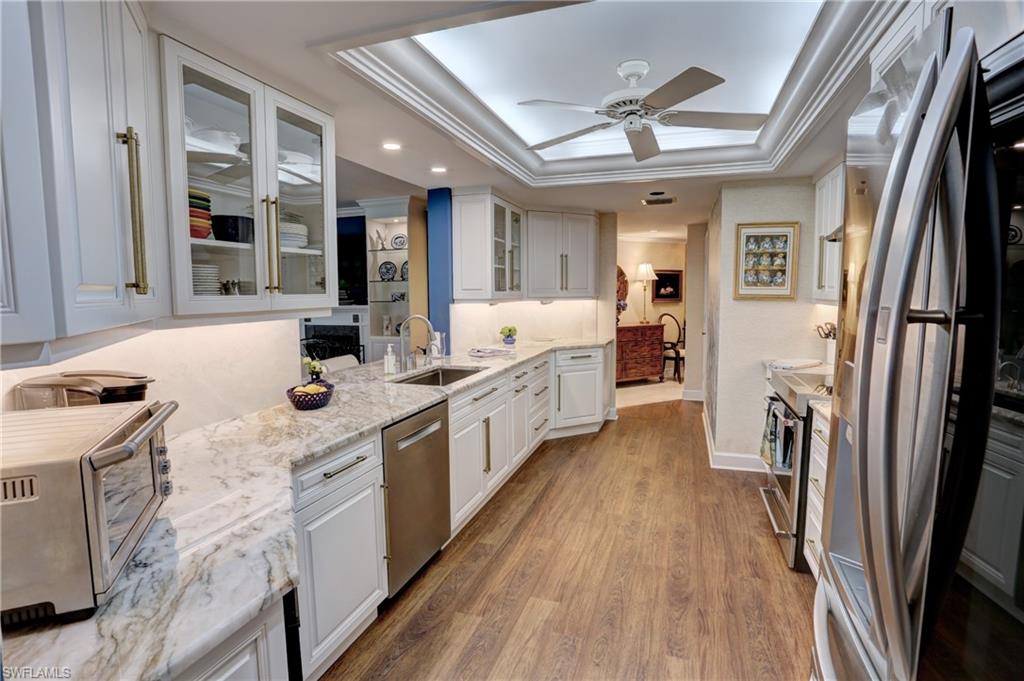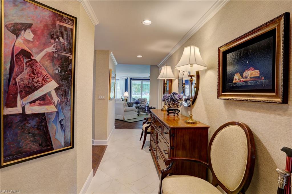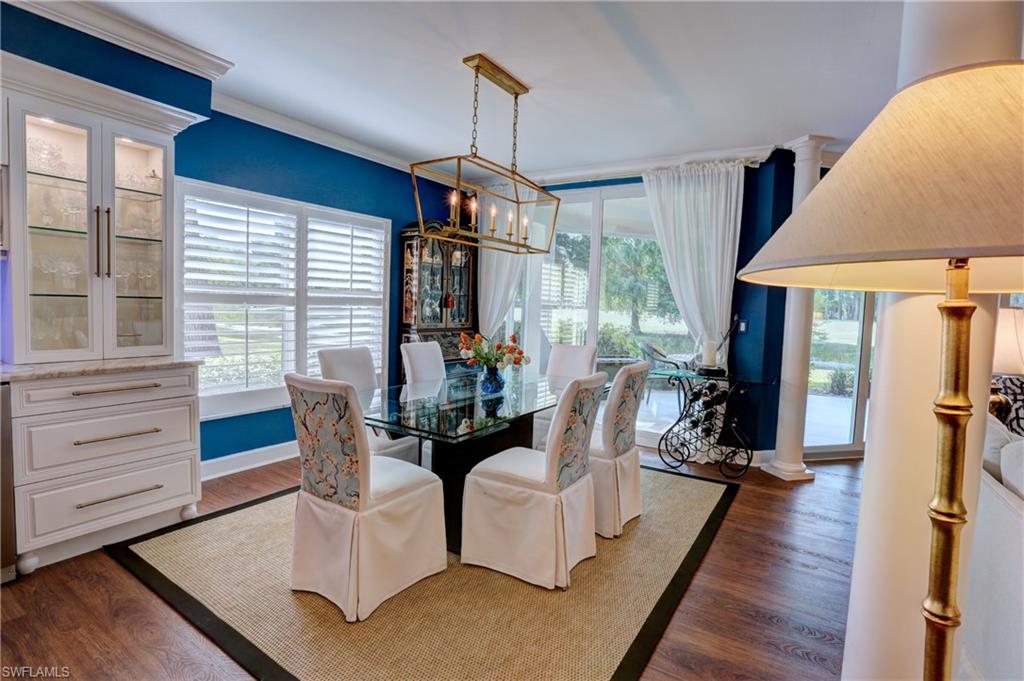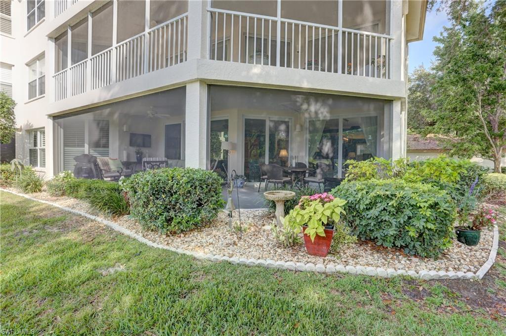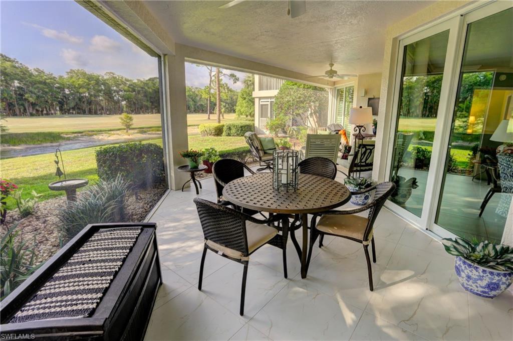 Elegant 1st floor corner condo with large lanai overlooking lake and golf, just steps to the club! This home has been totally and tastefully renovated with attention to every detail and meticulously cared for. New floors throughout, new paint, beautiful crown moldings, remodeled baths. Kitchen remodel is a chef’s dream and open to great room with quartzite counters, all new appliances, induction cooktop, even craft ice in freezer! Great room with built in bar and beverage fridge, glass door cabinets with lighting, electric fireplace and mantel. The lanai is a retreat with panoramic screens, impact sliders, porcelain tile, surrounded by custom rock garden, and the view is exceptional! Enjoy 27 holes of Arthur Hills immediate golf, active tennis/pickleball with10 Har Tru tennis courts, 7 pickleball courts, popular bocce teams, full croquet, resort-style zero entry pool, state of the art fitness center, w/full spa services & group exercise classes. New activity center with circular outdoor bar and pickle ball stadium for exhibition matches with seating for 165! Enjoy indoor/outdoor casual dining at the Tiebreaker and a lively social schedule of events/parties at the club. Wyndemere, a gated premiere 2025-2026 Platinum Club of America, known for its friendly and welcoming membership, is ideally located within minutes to world class dining, shopping and the spectacular sugar sand Gulf beaches. Come join the fun of this spectacular Southwest Florida lifestyle!