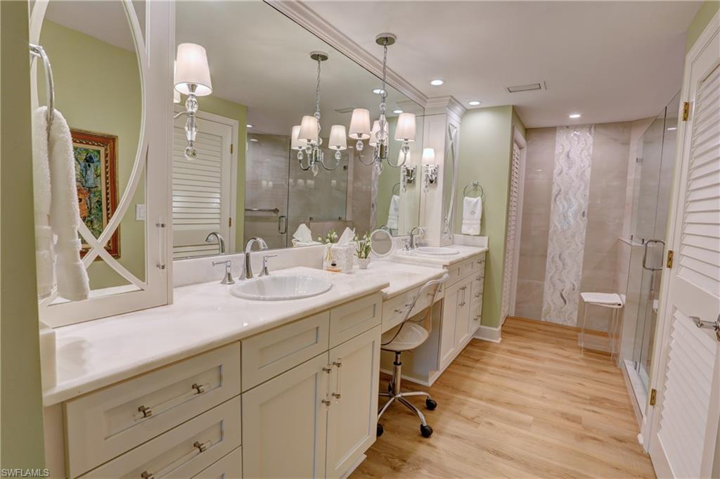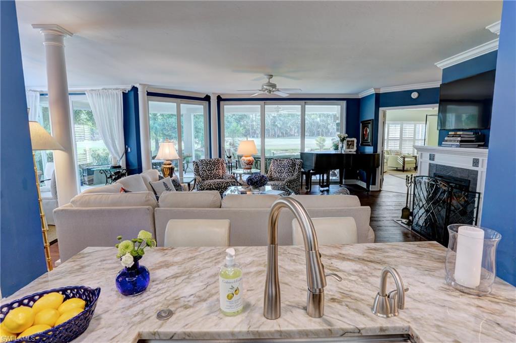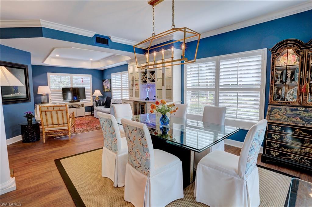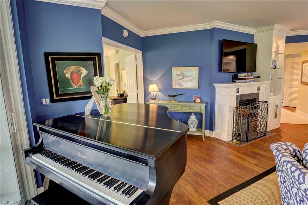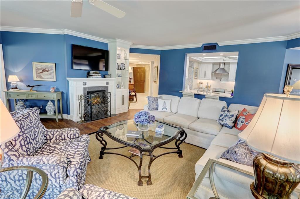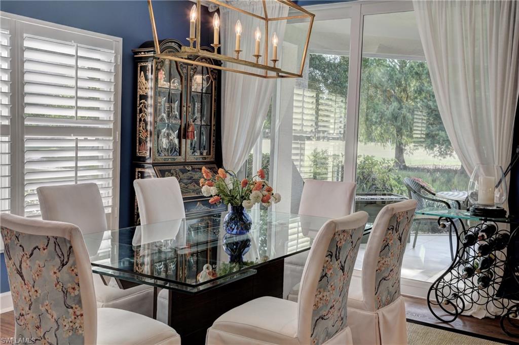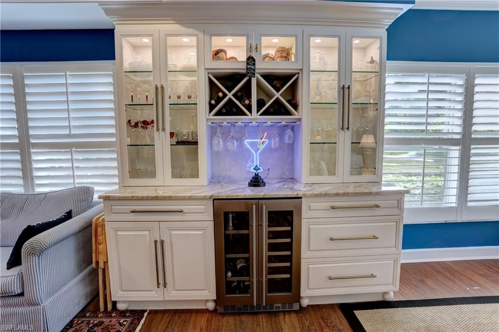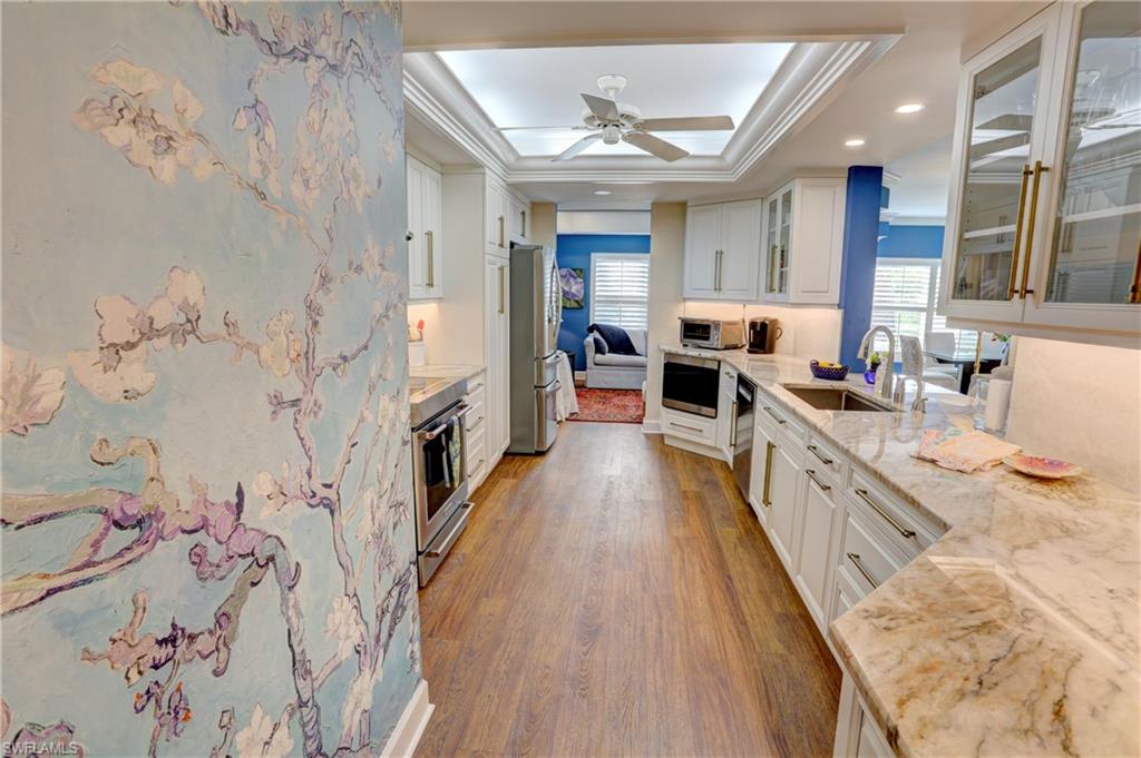 Elegant 1st floor corner condo with large lanai overlooking lake and golf, just steps to the club! This home has been totally and tastefully renovated with attention to every detail and meticulously cared for. New floors throughout, new paint, beautiful crown moldings, remodeled baths. Kitchen remodel is a chef’s dream and open to great room with quartzite counters, all new appliances, induction cooktop, even craft ice in freezer! Great room with built in bar and beverage fridge, glass door cabinets with lighting, electric fireplace and mantel. The lanai is a retreat with panoramic screens, impact sliders, porcelain tile, surrounded by custom rock garden, and the view is exceptional! Enjoy 27 holes of Arthur Hills immediate golf, active tennis/pickleball with10 Har Tru tennis courts, 7 pickleball courts, popular bocce teams, full croquet, resort-style zero entry pool, state of the art fitness center, w/full spa services & group exercise classes. New activity center with circular outdoor bar and pickle ball stadium for exhibition matches with seating for 165! Enjoy indoor/outdoor casual dining at the Tiebreaker and a lively social schedule of events/parties at the club. Wyndemere, a gated premiere 2025-2026 Platinum Club of America, known for its friendly and welcoming membership, is ideally located within minutes to world class dining, shopping and the spectacular sugar sand Gulf beaches. Come join the fun of this spectacular Southwest Florida lifestyle!