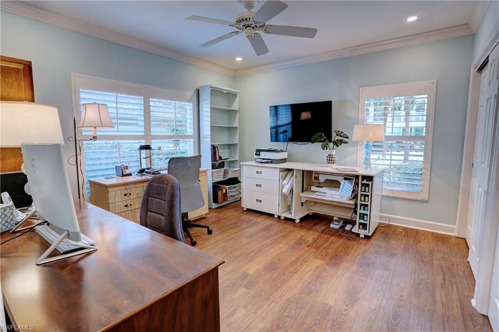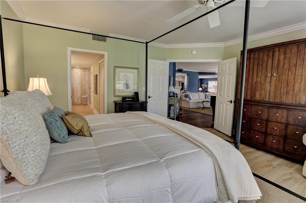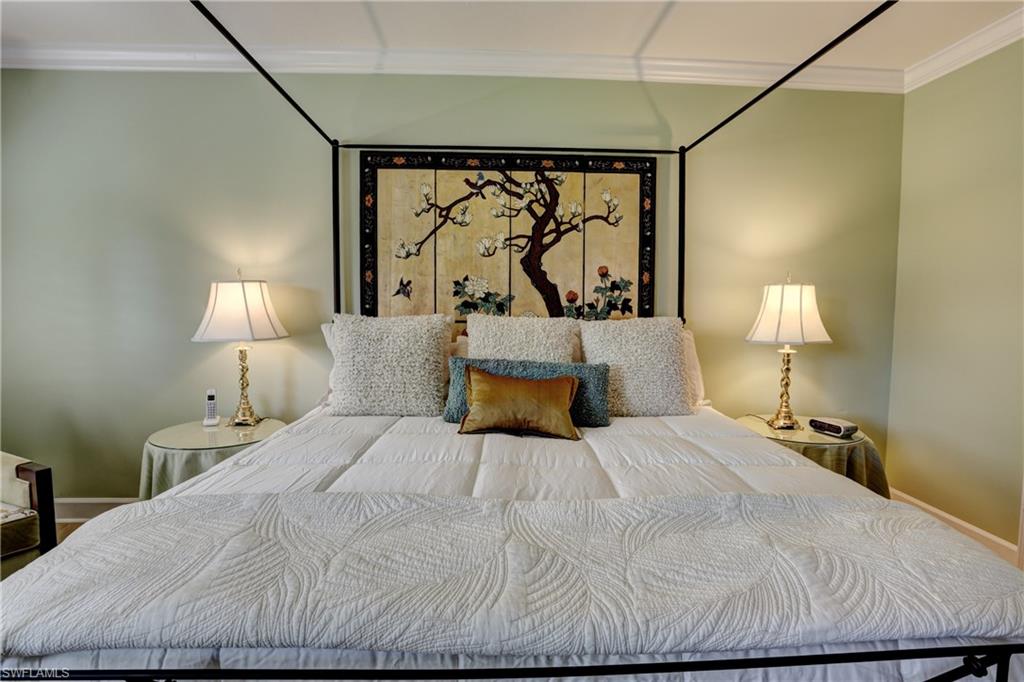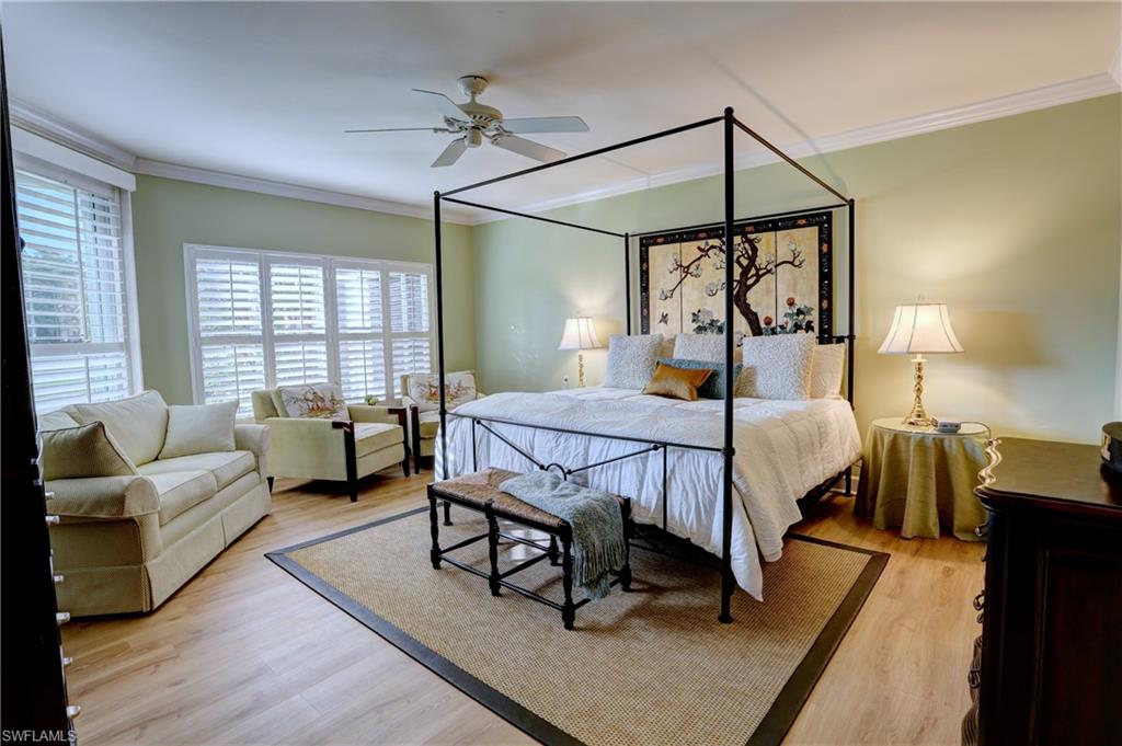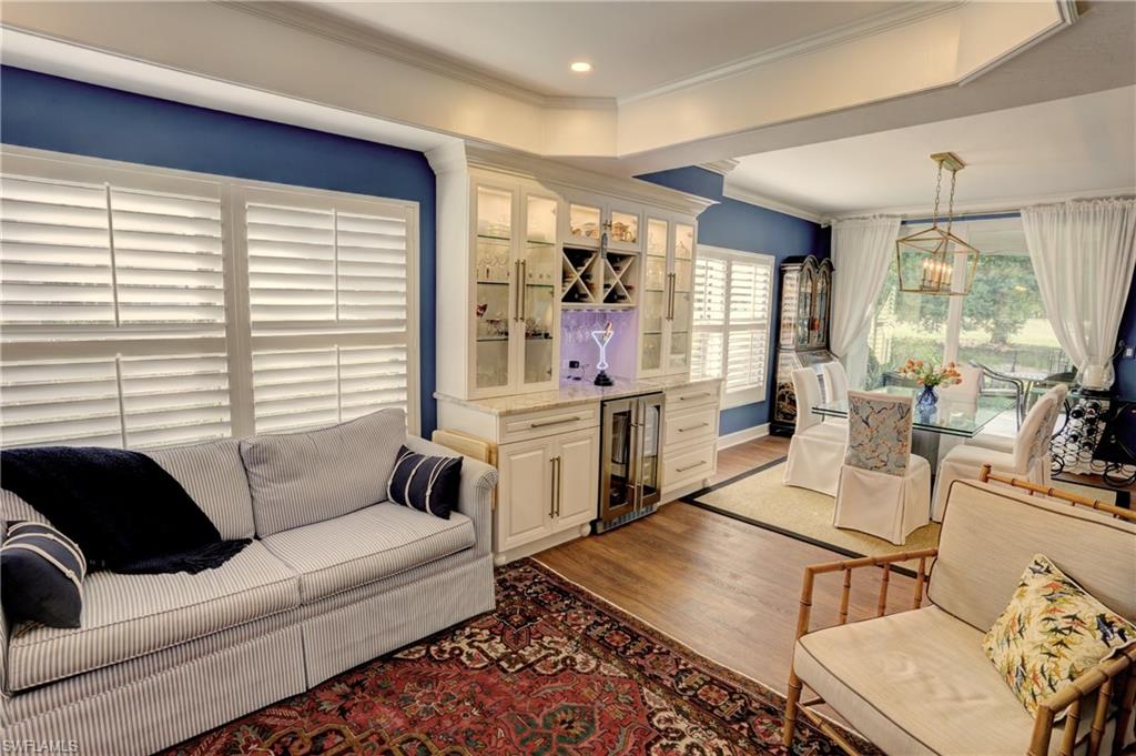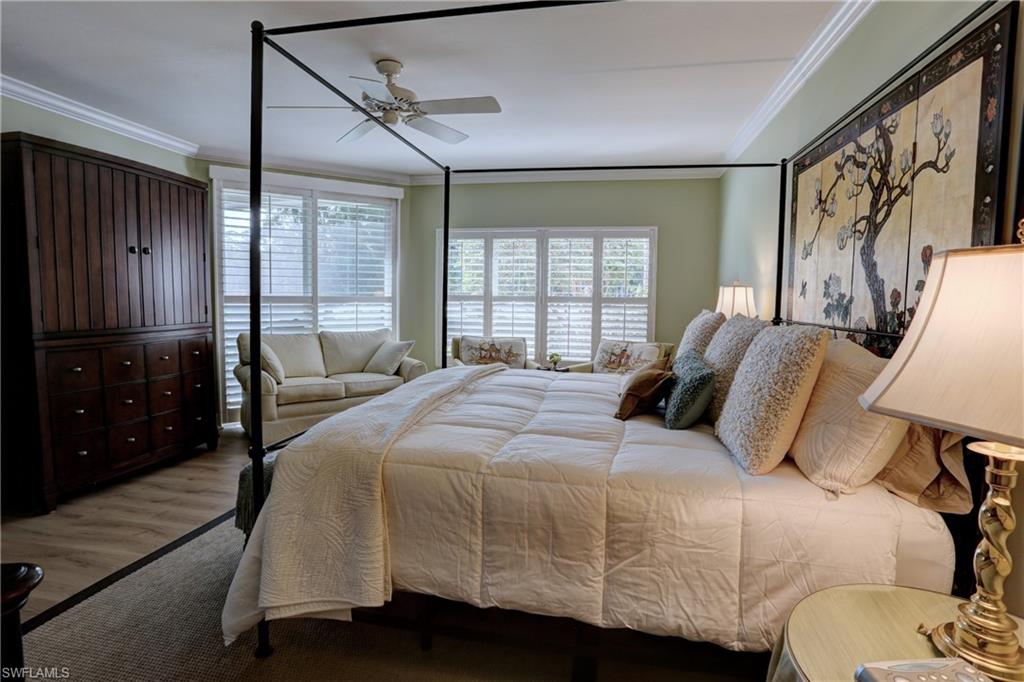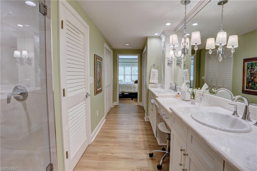 Elegant 1st floor corner condo with large lanai overlooking lake and golf, just steps to the club! This home has been totally and tastefully renovated with attention to every detail and meticulously cared for. New floors throughout, new paint, beautiful crown moldings, remodeled baths. Kitchen remodel is a chef’s dream and open to great room with quartzite counters, all new appliances, induction cooktop, even craft ice in freezer! Great room with built in bar and beverage fridge, glass door cabinets with lighting, electric fireplace and mantel. The lanai is a retreat with panoramic screens, impact sliders, porcelain tile, surrounded by custom rock garden, and the view is exceptional! Enjoy 27 holes of Arthur Hills immediate golf, active tennis/pickleball with10 Har Tru tennis courts, 7 pickleball courts, popular bocce teams, full croquet, resort-style zero entry pool, state of the art fitness center, w/full spa services & group exercise classes. New activity center with circular outdoor bar and pickle ball stadium for exhibition matches with seating for 165! Enjoy indoor/outdoor casual dining at the Tiebreaker and a lively social schedule of events/parties at the club. Wyndemere, a gated premiere 2025-2026 Platinum Club of America, known for its friendly and welcoming membership, is ideally located within minutes to world class dining, shopping and the spectacular sugar sand Gulf beaches. Come join the fun of this spectacular Southwest Florida lifestyle!