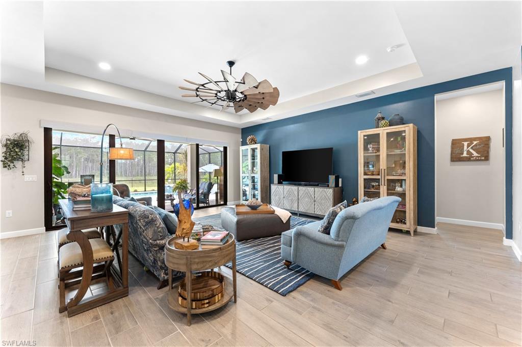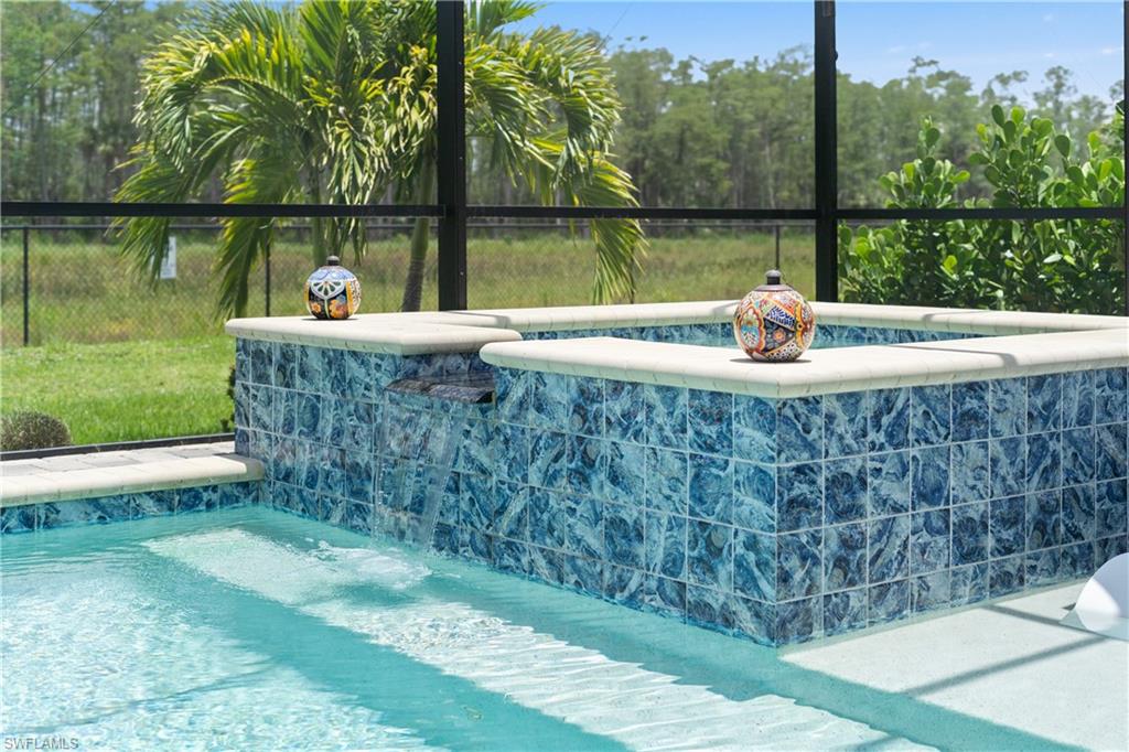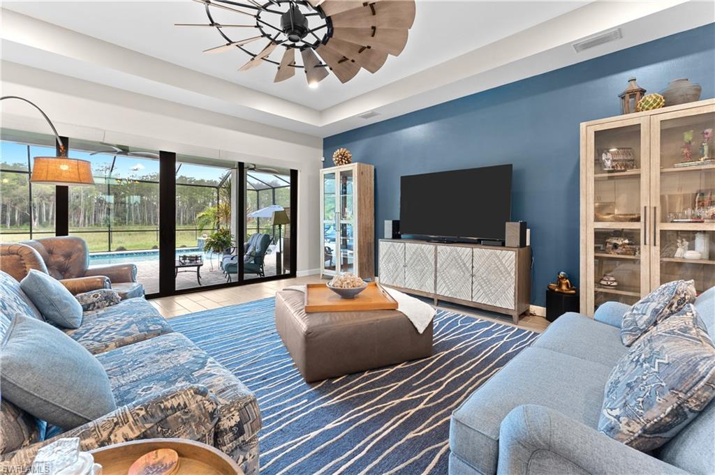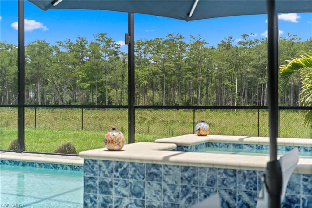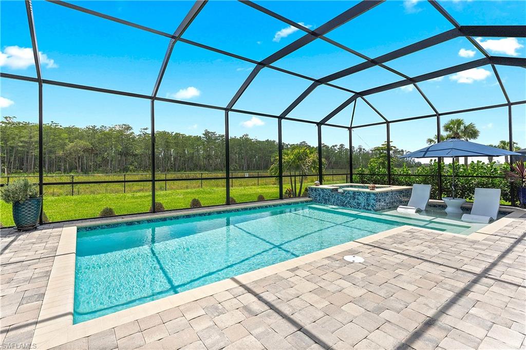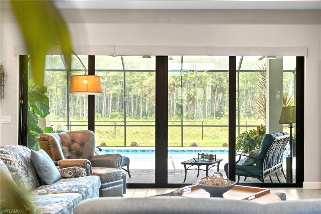 MAJOR PRICE IMPROVEMENT! RARELY AVAILABLE SINGLE STORY ESTATE HOME (76' WIDE HOMESITE) IN VERDANA VILLAGE! COME SEE THIS GORGEOUS "SUNSET" FLOORPLAN WITH CUSTOM POOL/SPA AND PRIVATE PRESERVE/WOODED VIEWS (No homes behind you)! This beautiful property was built in 2023 by Lennar and offers 3 Bedrooms + Den, 3 Full Baths (one bath is en-Suite and also serves as a Pool Bath), 3 Car Garage, 2,650sf. Have peace of mind knowing that this residence is “STORM READY” with IMPACT RESISTANT WINDOWS AND DOORS and a WHOLE HOME NATURAL GAS GENERATOR. Upon arriving at the home, take notice of the large FRONT SCREENED ENTRY accented by the glass double doors allowing tons of natural light to flow into the home. Inside, this property showcases WOOD LOOK PLANK TILE THROUGHOUT (NO CARPET ANYWHERE), painted ACCENT WALLS, 8' interior doors, and TRAY CEILINGS. DESIGNER CEILING FANS and UPGRADED LIGHTING elevate the interior of this home. The living and dining spaces flow seamlessly in this OPEN CONCEPT layout, creating a warm and inviting space for both entertaining and everyday life. The Spacious Greatroom is appointed with (4) 4' PANEL SLIDING GLASS DOORS which open onto the 34' wide, OVERSIZED COVERED LANAI. Sip your morning coffee and watch the sun rise over the pines/palms. Enjoy splashing around in your CUSTOM GAS HEATED POOL AND SPA or relax on a ledge lounger on the SUNSHELF while overlooking the PRIVATE, NATURAL PRESERVE (NO HOMES BEHIND YOU). The pool cage pillar lighting is perfect to enhance the evening ambiance. Inside, you’ll find a CHEF’S KITCHEN where beauty meets function. Anchoring the space is a generous kitchen island, topped with QUARTZ countertops, perfect for prepping gourmet meals, hosting wine-and-cheese nights, or gathering around for casual breakfasts. The Kitchen boasts white cabinetry and is equipped with STAINLESS STEEL appliances, GAS COOKTOP and BUILT IN WALL OVENS. The Primary Bedroom is enhanced by a TRAY CEILING, Private Glass Sliding Door to Lanai and DUAL CLOSETS while the Primary Bath showcases a SPACIOUS WALK-IN SHOWER. Other features include: Electric Rolldown Shades in the living area and Primary Bedroom, Laundry cabinets and sink, Garage MINI-SPLIT AC, insulated garage doors and storage racks, and TANKLESS WATER HEATER. This property is high and dry in Flood Zone X—NO FLOOD INSURANCE REQUIRED! Verdana Village residents enjoy an unbeatable amenity package including indoor/outdoor pickleball & tennis, indoor basketball, bocce ball, clubhouse, green spaces, resort-style pool & spa, fitness, movement studio, playground w/sun shade, a full-service restaurant, craft beer lounge, cafe and indoor/outdoor patio bar. In front of Verdana Village is the new Publix Plaza with Dunkin’ Donuts, Nail salon, Hair Salon, UPS Store, Legno Italian Restaurant and more. Across the street is a new fire station with full EMS services. The highly rated Jack Nicklaus designed OLD CORKSCREW GOLF CLUB is open to the public and located just 1.5 miles away
