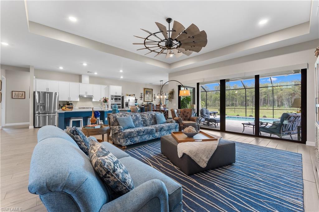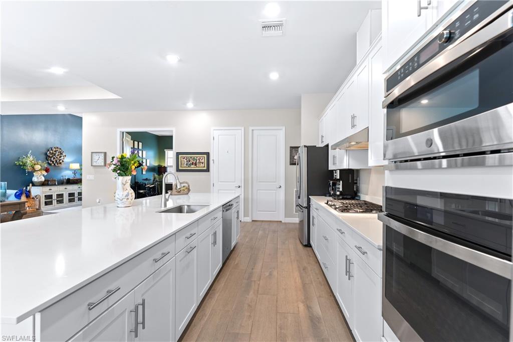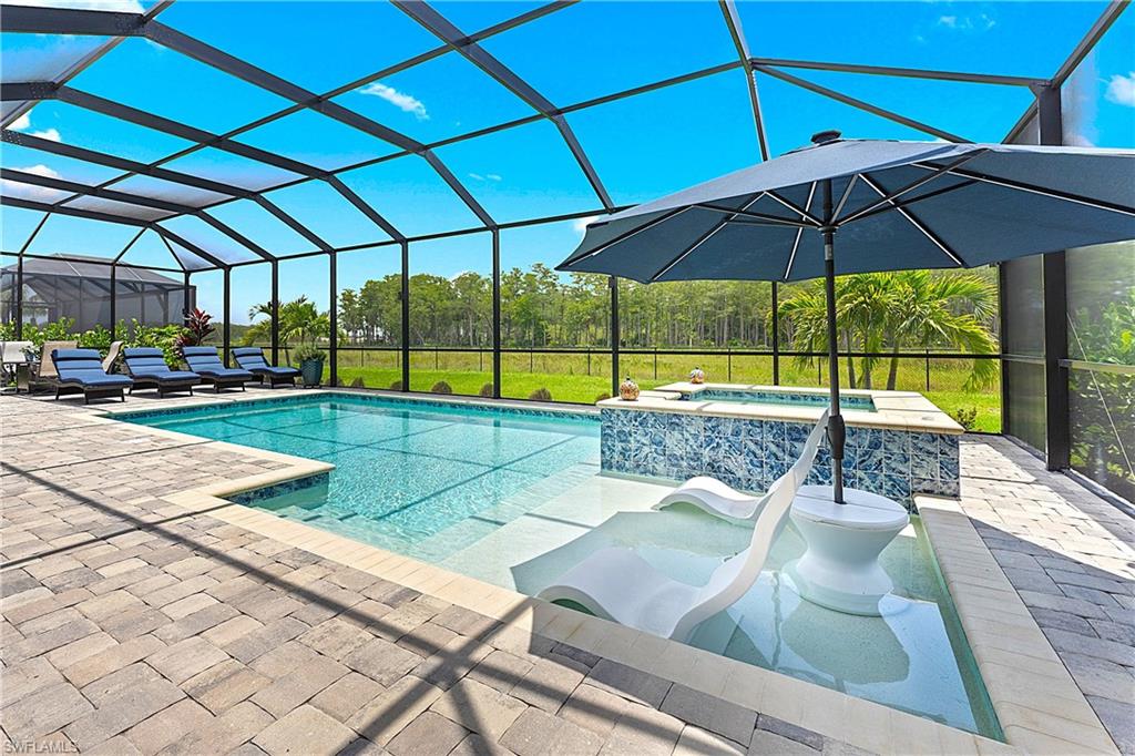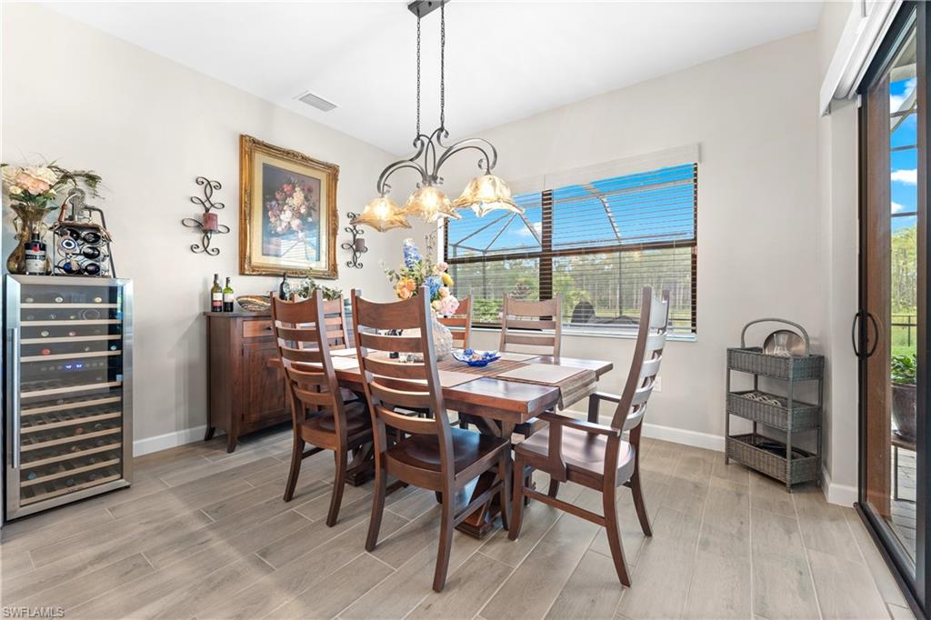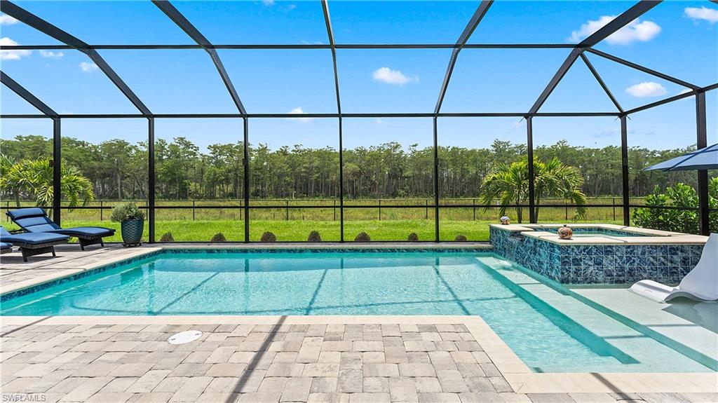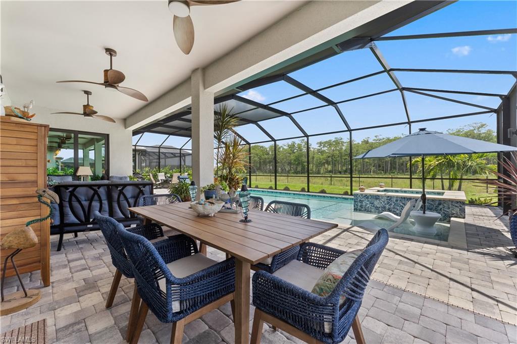 MAJOR PRICE IMPROVEMENT! RARELY AVAILABLE SINGLE STORY ESTATE HOME (76' WIDE HOMESITE) IN VERDANA VILLAGE! COME SEE THIS GORGEOUS "SUNSET" FLOORPLAN WITH CUSTOM POOL/SPA AND PRIVATE PRESERVE/WOODED VIEWS (No homes behind you)! This beautiful property was built in 2023 by Lennar and offers 3 Bedrooms + Den, 3 Full Baths (one bath is en-Suite and also serves as a Pool Bath), 3 Car Garage, 2,650sf. Have peace of mind knowing that this residence is “STORM READY” with IMPACT RESISTANT WINDOWS AND DOORS and a WHOLE HOME NATURAL GAS GENERATOR. Upon arriving at the home, take notice of the large FRONT SCREENED ENTRY accented by the glass double doors allowing tons of natural light to flow into the home. Inside, this property showcases WOOD LOOK PLANK TILE THROUGHOUT (NO CARPET ANYWHERE), painted ACCENT WALLS, 8' interior doors, and TRAY CEILINGS. DESIGNER CEILING FANS and UPGRADED LIGHTING elevate the interior of this home. The living and dining spaces flow seamlessly in this OPEN CONCEPT layout, creating a warm and inviting space for both entertaining and everyday life. The Spacious Greatroom is appointed with (4) 4' PANEL SLIDING GLASS DOORS which open onto the 34' wide, OVERSIZED COVERED LANAI. Sip your morning coffee and watch the sun rise over the pines/palms. Enjoy splashing around in your CUSTOM GAS HEATED POOL AND SPA or relax on a ledge lounger on the SUNSHELF while overlooking the PRIVATE, NATURAL PRESERVE (NO HOMES BEHIND YOU). The pool cage pillar lighting is perfect to enhance the evening ambiance. Inside, you’ll find a CHEF’S KITCHEN where beauty meets function. Anchoring the space is a generous kitchen island, topped with QUARTZ countertops, perfect for prepping gourmet meals, hosting wine-and-cheese nights, or gathering around for casual breakfasts. The Kitchen boasts white cabinetry and is equipped with STAINLESS STEEL appliances, GAS COOKTOP and BUILT IN WALL OVENS. The Primary Bedroom is enhanced by a TRAY CEILING, Private Glass Sliding Door to Lanai and DUAL CLOSETS while the Primary Bath showcases a SPACIOUS WALK-IN SHOWER. Other features include: Electric Rolldown Shades in the living area and Primary Bedroom, Laundry cabinets and sink, Garage MINI-SPLIT AC, insulated garage doors and storage racks, and TANKLESS WATER HEATER. This property is high and dry in Flood Zone X—NO FLOOD INSURANCE REQUIRED! Verdana Village residents enjoy an unbeatable amenity package including indoor/outdoor pickleball & tennis, indoor basketball, bocce ball, clubhouse, green spaces, resort-style pool & spa, fitness, movement studio, playground w/sun shade, a full-service restaurant, craft beer lounge, cafe and indoor/outdoor patio bar. In front of Verdana Village is the new Publix Plaza with Dunkin’ Donuts, Nail salon, Hair Salon, UPS Store, Legno Italian Restaurant and more. Across the street is a new fire station with full EMS services. The highly rated Jack Nicklaus designed OLD CORKSCREW GOLF CLUB is open to the public and located just 1.5 miles away