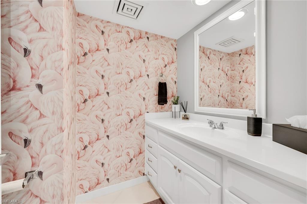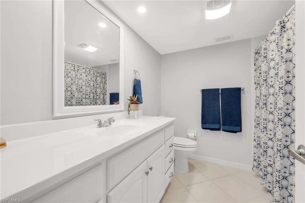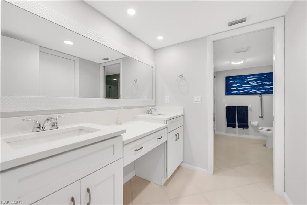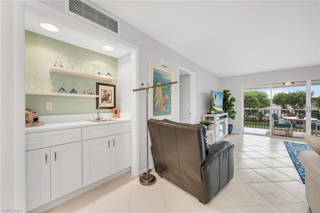 Experience refined coastal living in this fully remodeled and furnished two-bedroom, two-and-a-half-bath residence in a low-density building at Florentine Villas. Ideally on Marco Island’s desirable south end, just a short distance from the South Beach access point, this home offers western exposure for nightly sunset views from the expansive screened lanai. The lanai, upgraded with a new screen and enclosure, provides a generous outdoor living space complete with electric storm shutters for added peace of mind. Inside, the residence showcases diagonal tile flooring throughout, complemented by white plantation shutters. The kitchen features a shiplap tray ceiling with recessed lighting, white cabinetry, a mosaic tile backsplash and high-end appliances, including a range, microwave, dishwasher and a refrigerator with an icemaker. An adjacent dining area flows seamlessly into the living room, where glass sliders open to the lanai. A wet bar with shelving and cabinetry enhances the space, ideal for entertaining. The primary suite offers lanai access and includes a spacious walk-in closet. The en-suite bath is appointed with a dual-sink vanity featuring quartz countertops, a makeup counter, a tub, and a separate walk-in shower with floor-to-ceiling tile and a frameless glass enclosure. The guest bedroom also boasts a large walk-in closet and an en-suite bath with a shower-tub combination. A convenient powder bath is off the hallway, and the laundry room includes shelving, a washer and a dryer. Additional highlights include a new hot water tank (2023) and potential for monthly rentals. The building has undergone significant updates, including a new roof in 2020, a pool renovation in 2021 and an elevator refurbishment in 2023. The seller will cover the current special assessments! With low-density living, under-cover assigned parking, and a storage room, this property offers a blend of luxury, convenience and coastal charm.